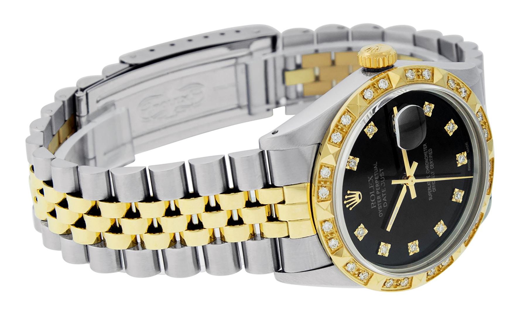 One Mens 14K Yellow Gold Rolex Datejust Polished Bright with Satin Finish, Serviced & Electronically Tested, Stainless Steel Case: 36mm, Yellow Gold Crown, Custom Bezel: New 18K Yellow Gold Pyramid Diamond Bezel, Diamond Count: 24 Diamonds, Total Weight .75 Carat, Clarity: SI-VS, Color: G to H. Custom Crystal: New Scratch Resistant Synthetic Sapphire Cyclops Lens. Custom Hands: New Luminecent Hands. Movement: Automatic Winding Movement Caliber 3035. Custom Dial: Black Single Cut Diamond Dial, Diamond Count: 10 Diamonds In Dial, Color: G to H, Clarity: VS. Date Window: 3 O'Clock Position Date Display, Quickset, Model: Datejust. Condition: G-6 Extra Fine. Bracelet: 14K Yellow Gold And Stainless Steel Jubilee Band. Bright Polish & Satin Finish. 7.0 Inch Length, Adjustable. Standard Clasp, With Rolex Logo. This Watch Has Been Serviced And Polished It Is Free Of All Scratches And Dents.