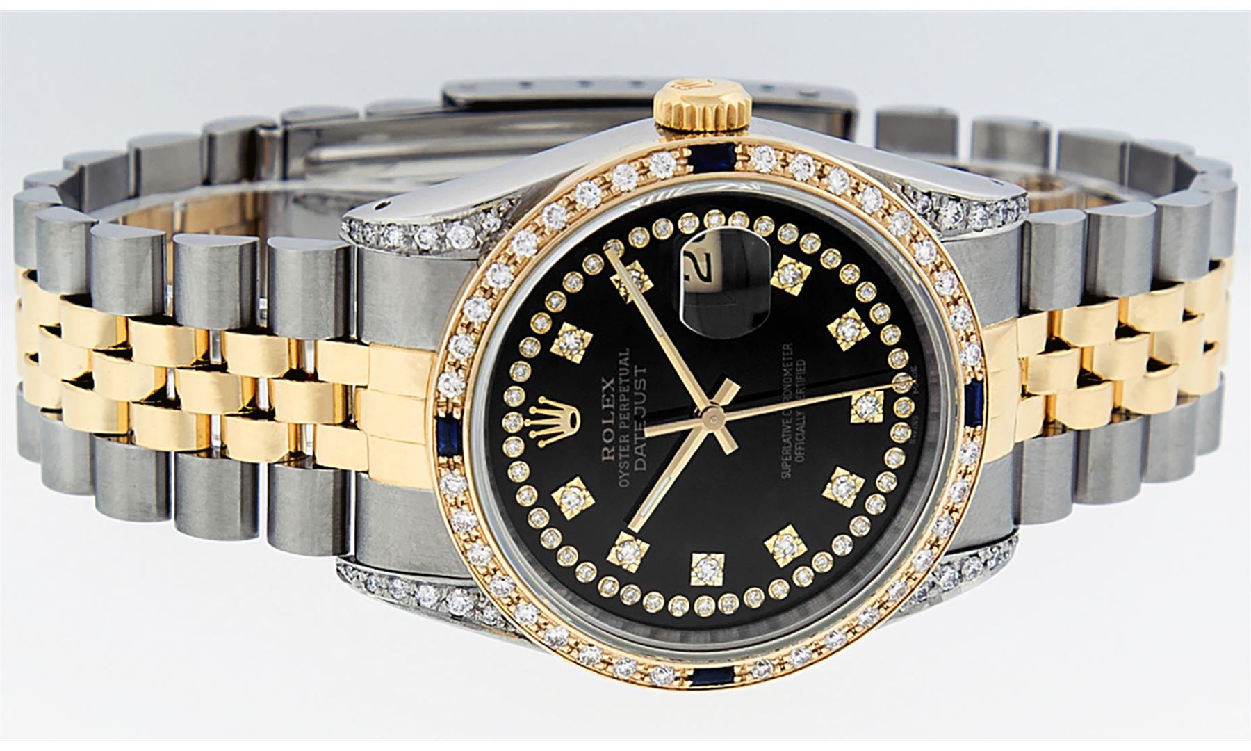 One Mens 14K Yellow Gold Rolex Datejust Polished Bright with Satin Finish, Serviced & Electronically Tested, Stainless Steel Case: 36mm, Custom Diamond Lugs: 28 Diamonds On Lugs, Color: G to H, Clarity: SI-VS. Yellow Gold Crown, Custom Bezel: New 18K Yellow Gold Beadset Diamond + Sapphire Bezel, Diamond + Stone Count: 36 Diamonds + 4 Sapphires, Total Weight 1.00 Carat, Clarity: SI-VS, Color: G to H. Custom Crystal: New Scratch Resistant Synthetic Sapphire Cyclops Lens. Custom Hands: New Luminecent Hands. Movement: Automatic Winding Movement Caliber 3035. Custom Dial: Black Single Cut String Diamond Dial, Stone Count: 58 Diamonds In Dial, Color: G to H, Clarity: VS2. Date Window: 3 O'Clock Position Date Display, Quickset, Model: 16013 Datejust. Condition: G-6 Extra Fine. Bracelet: 14K Yellow Gold And Stainless Steel Jubilee Band. Bright Polish & Satin Finish. 7.0 Inch Length, Adjustable. Standard Clasp, With Rolex Logo. This Watch Has Been Serviced And Polished It Is Free Of All Scratches And Dents.