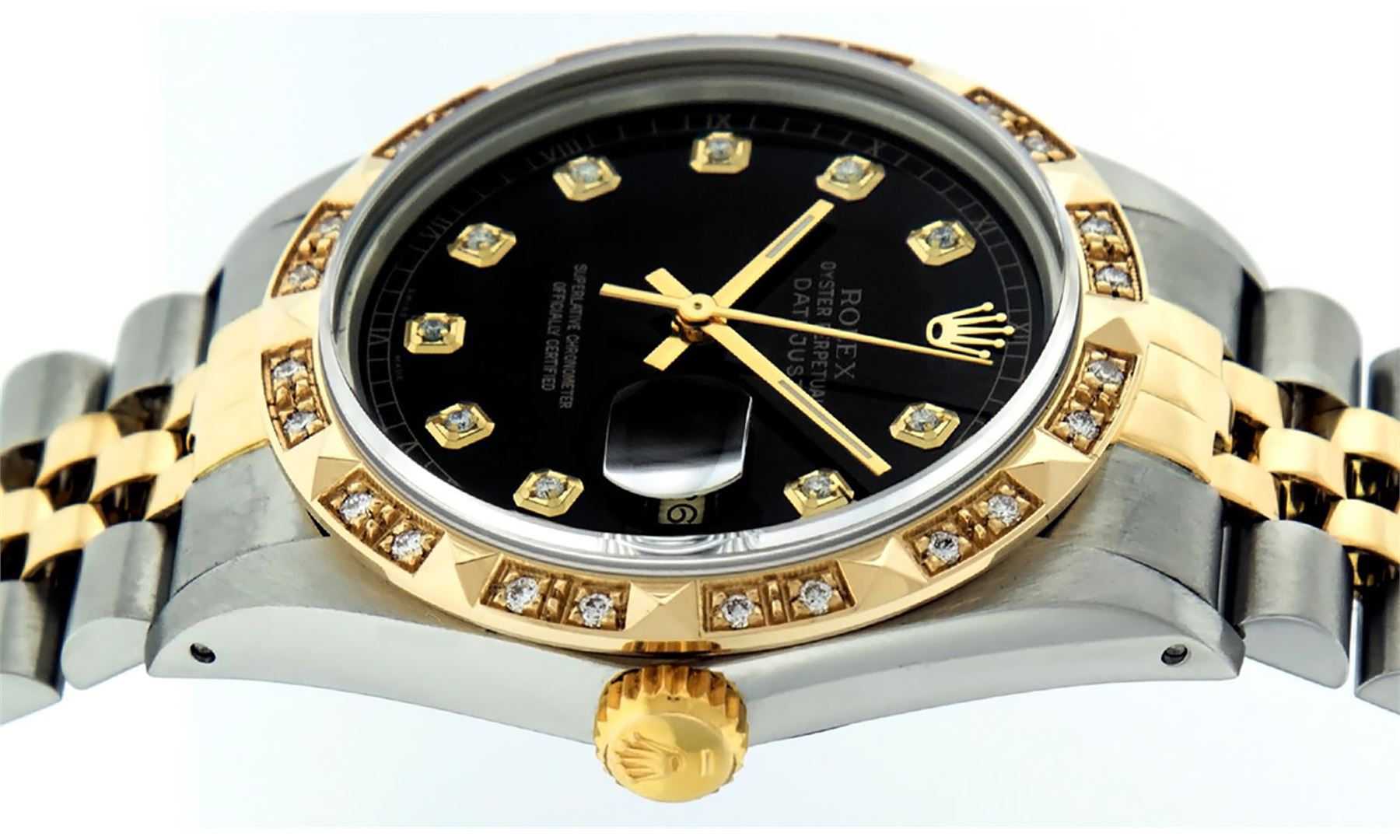 One Mens 14K Yellow Gold Rolex Datejust Polished Bright with Satin Finish, Serviced & Electronically Tested, Stainless Steel Case: 36mm, Yellow Gold Crown, Custom Bezel: New 18K Yellow Gold Pyramid Diamond Bezel, Diamond Count: 24 Diamonds, Total Weight .75 Carat, Clarity: SI-VS, Color: G to H. Custom Crystal: New Scratch Resistant Synthetic Sapphire Cyclops Lens. Custom Hands: New Luminecent Hands. Movement: Automatic Winding Movement Caliber 3035. Custom Dial: Black Diamond Dial With Roman Track, Diamond Count: 10 Diamonds In Dial, Color: G to H, Clarity: VS. Date Window: 3 O'Clock Position Date Display, Quickset, Model: Datejust. Condition: G-6 Extra Fine. Bracelet: 14K Yellow Gold And Stainless Steel Jubilee Band. Bright Polish & Satin Finish. 7.0 Inch Length, Adjustable. Standard Clasp, With Rolex Logo. This Watch Has Been Serviced And Polished It Is Free Of All Scratches And Dents.