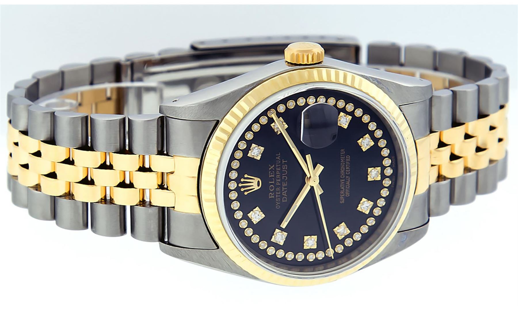 One Mens 14K Yellow Gold Two Tone Rolex Datejust Polished, Serviced & Electronically Tested, 14K Yellow Gold & Stainless Steel Case: 36mm, 14K Yellow Gold Crown,�Bezel: 14K Yellow Gold�Fluted Bezel. Custom Crystal: New Acrylic Cyclops Lens. Custom Hands: New Luminecent Hands. Movement: Automatic Winding Movement Caliber 3035. Custom Dial: Black Single Cut String Dial Set With VS Diamond Hour Markers,�Diamond Count: 58 Diamonds�in Dial, G To H In Color, SI-VS Clarity. Date Window: 3 O'Clock Position Date Display,�Quickset, Model: 16013 Datejust, Condition: G-6 Extra Fine. Bracelet: Two Tone 14K Yellow Gold & Stainless Steel Jubilee Band. Bright Polish.�7.0 Inch Length, Adjustable. Standard Clasp, With Rolex Logo. This Watch Has Been Serviced And Polished It Is Free Of All Scratches And Dents.