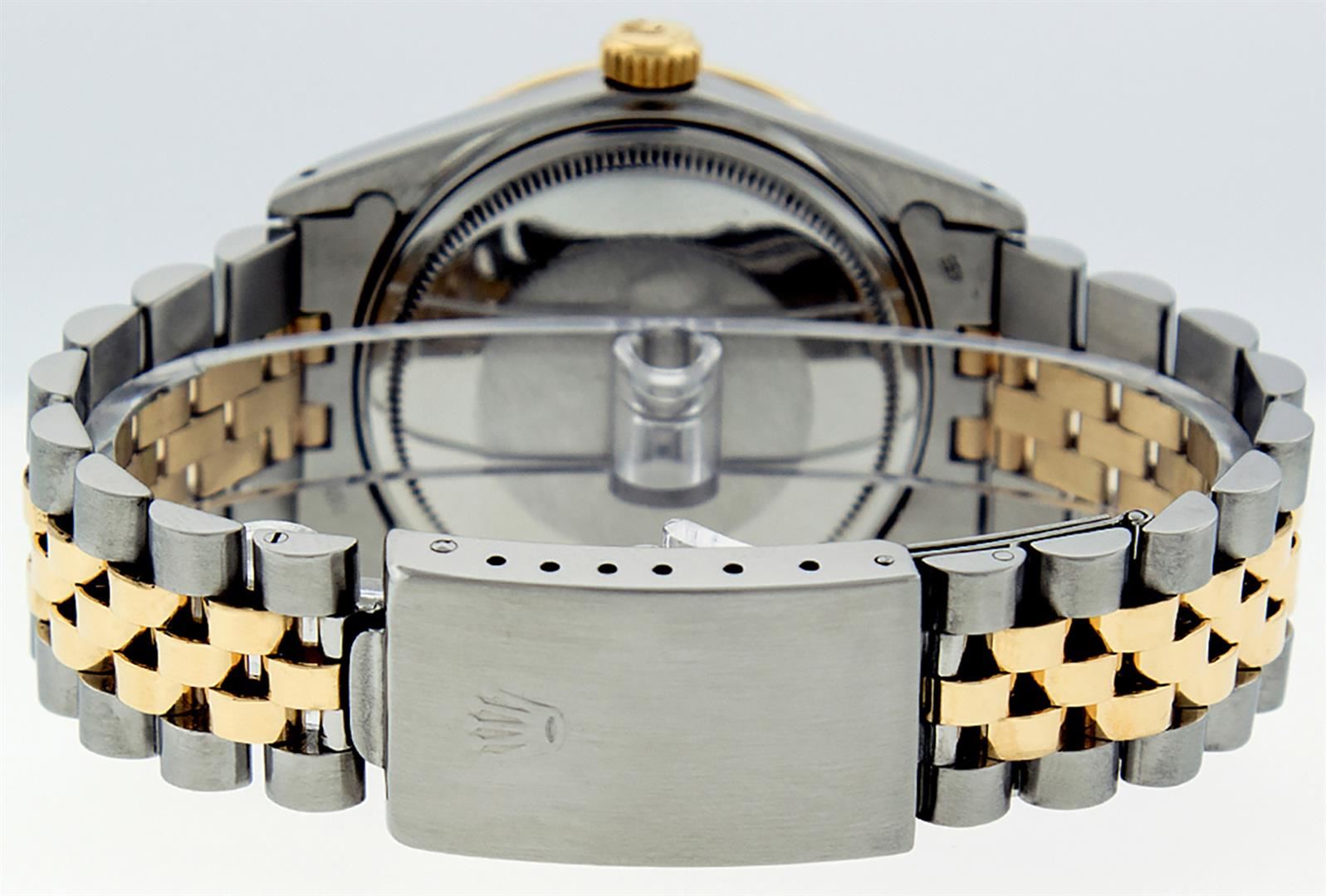 One Mens 14K Yellow Gold Two Tone Rolex Datejust Polished, Serviced & Electronically Tested, 14K Yellow Gold & Stainless Steel Case:36mm, 14K Yellow Gold Crown, Custom Bezel: New 18K Yellow Gold Sapphire Beadset Diamond Bezel, Diamond Count: 36 Diamonds + 4 Sapphires, Total Weight 1.00 Carat, Clarity: SI-VS, Color: G to H. Custom Crystal: New Scratch Resistant Synthetic Sapphire Cyclops Lens. Custom Hands: New Luminecent Hands. Movement: Automatic Winding Movement Caliber 3035. Custom Dial: Blue Vignette With Diamond Hour Markers And Roman Track. Diamond Count: 10 Diamonds On Dial, Clarity: SI-VS, Color: Color G to H Date Window: 3 O'Clock Position Date Display, Quickset, Model: Datejust, Condition: G-6 Extra Fine. Bracelet: Two Tone 14K Yellow Gold & Stainless Steel Jubilee Band. Bright Polish. 7.0 Inch Length, Adjustable. Standard Clasp, With Rolex Logo. This Watch Has Been Serviced Time Tested And Is In Excellent Condition It Is Free Of All Scratches And Dents.