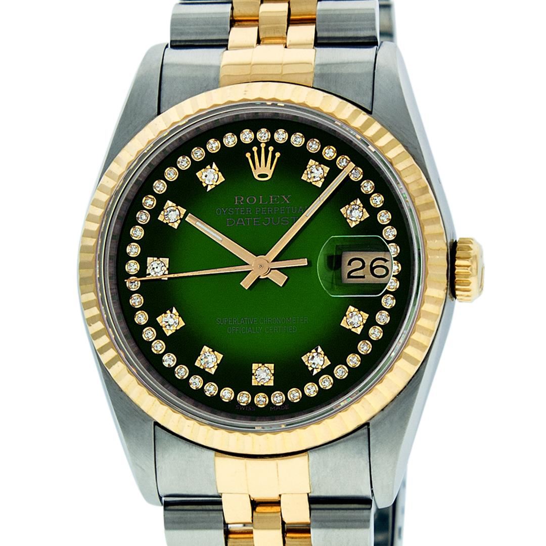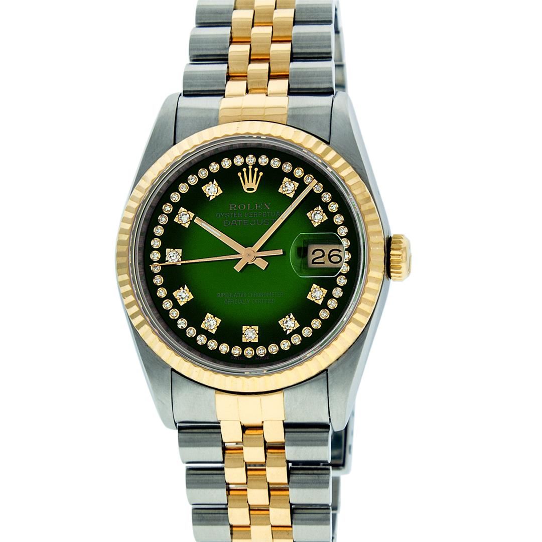 One Mens 14K Yellow Gold Two Tone Rolex Datejust Polished, Serviced & Electronically Tested, 14K Yellow Gold & Stainless Steel Case: 36mm, 14K Yellow Gold Crown, Bezel: 14K Yellow Gold Fluted Bezel. Custom Crystal: New Acrylic Cyclops Lens. Custom Hands: New Luminecent Hands. Movement: Automatic Winding Movement Caliber 3035. Custom Dial: Green Vignette String Dial Set With VS Diamond Hour Markers, Diamond Count: 58 Diamonds in Dial, G To H In Color, SI-VS Clarity. Date Window: 3 O'Clock Position Date Display, Quickset, Model: 16013 Datejust, Condition: G-6 Extra Fine. Bracelet: Two Tone 14K Yellow Gold & Stainless Steel Jubilee Band. Bright Polish. 7.0 Inch Length, Adjustable. Standard Clasp, With Rolex Logo. This Watch Has Been Serviced And Polished It Is Free Of All Scratches And Dents.