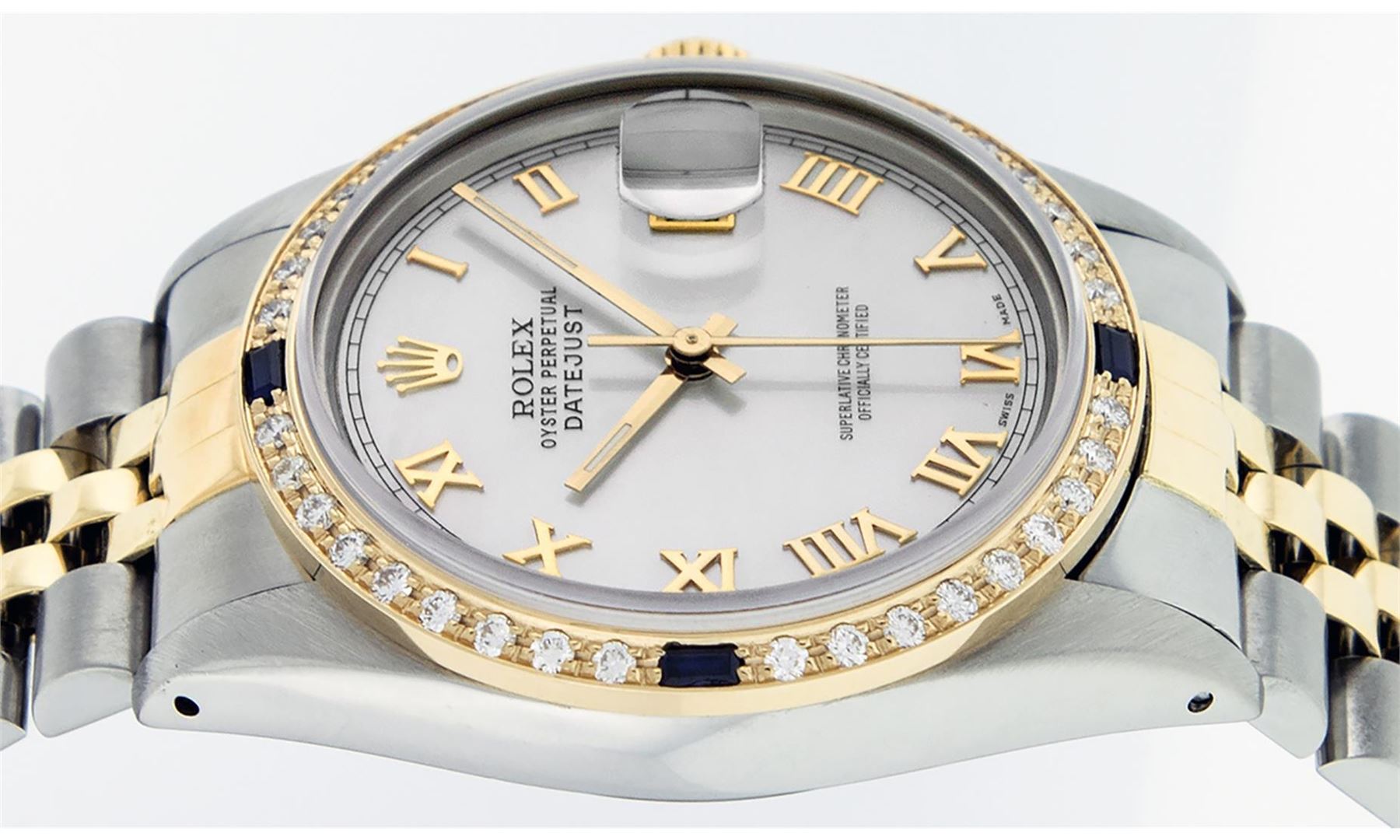 One Mens 14K Yellow Gold Two Tone Rolex Datejust Polished, Serviced & Electronically Tested, 14K Yellow Gold & Stainless Steel Case: 36mm, 14K Yellow Gold Crown, Custom Bezel: 18K Yellow Gold Beadset & Sapphire Diamond Bezel, Stone Count: 36 Diamonds + 4 Sapphires, Total Weight 1.00 Carat, Clarity: SI-VS, Color: G to H. Custom Crystal: New Scratch Resistant Synthetic Sapphire Cyclops Lens. Custom Hands: New Luminecent Hands. Movement: Automatic Winding Movement Caliber 3035. Custom Dial: Mother Of Pearl Roman Dial With Square Track. Date Window: 3 O'Clock Position Date Display, Quickset, Model: 16013 Datejust. Condition: G-6 Extra Fine. Bracelet: Two Tone 14K Yellow Gold & Stainless Steel Jubilee. Bright Polish. 7.0 Inch Length, Adjustable. Standard Clasp, With Rolex Logo. This Watch Has Been Serviced Time Tested And Is In Excellent Condition It Is Free Of All Scratches And Dents.