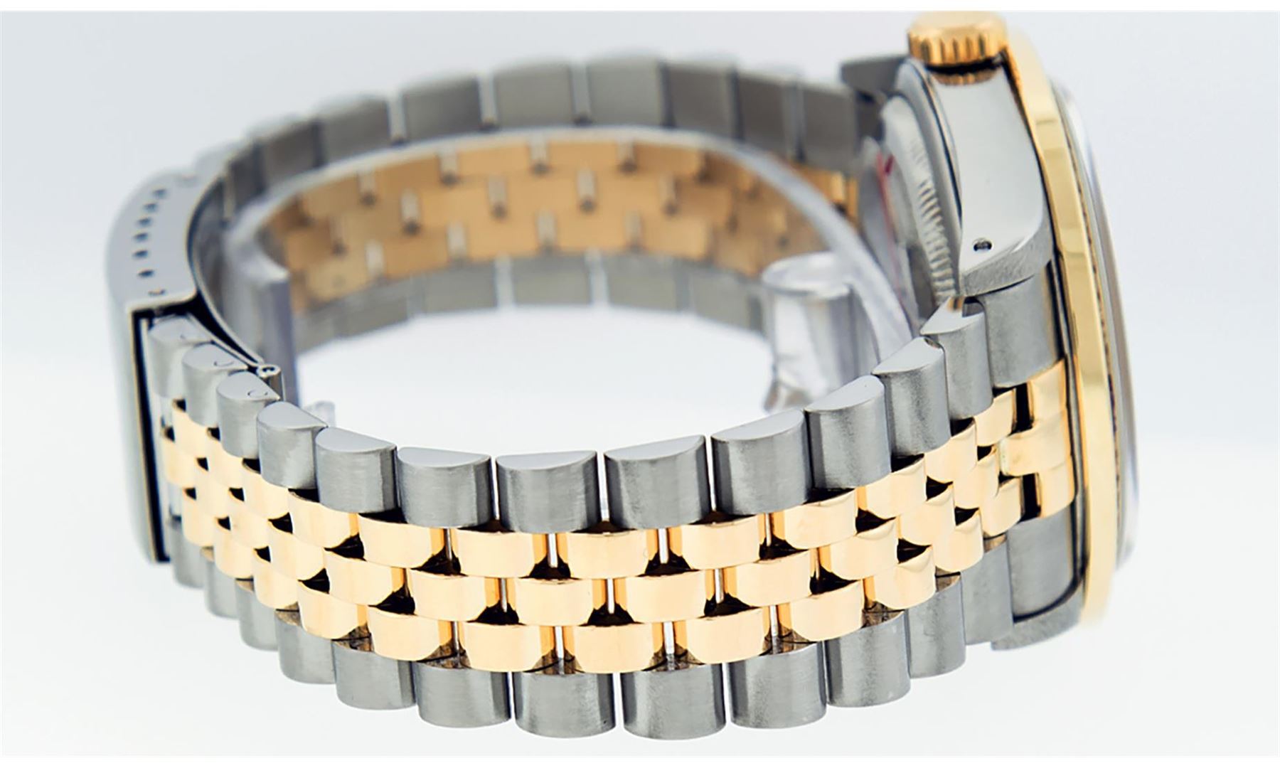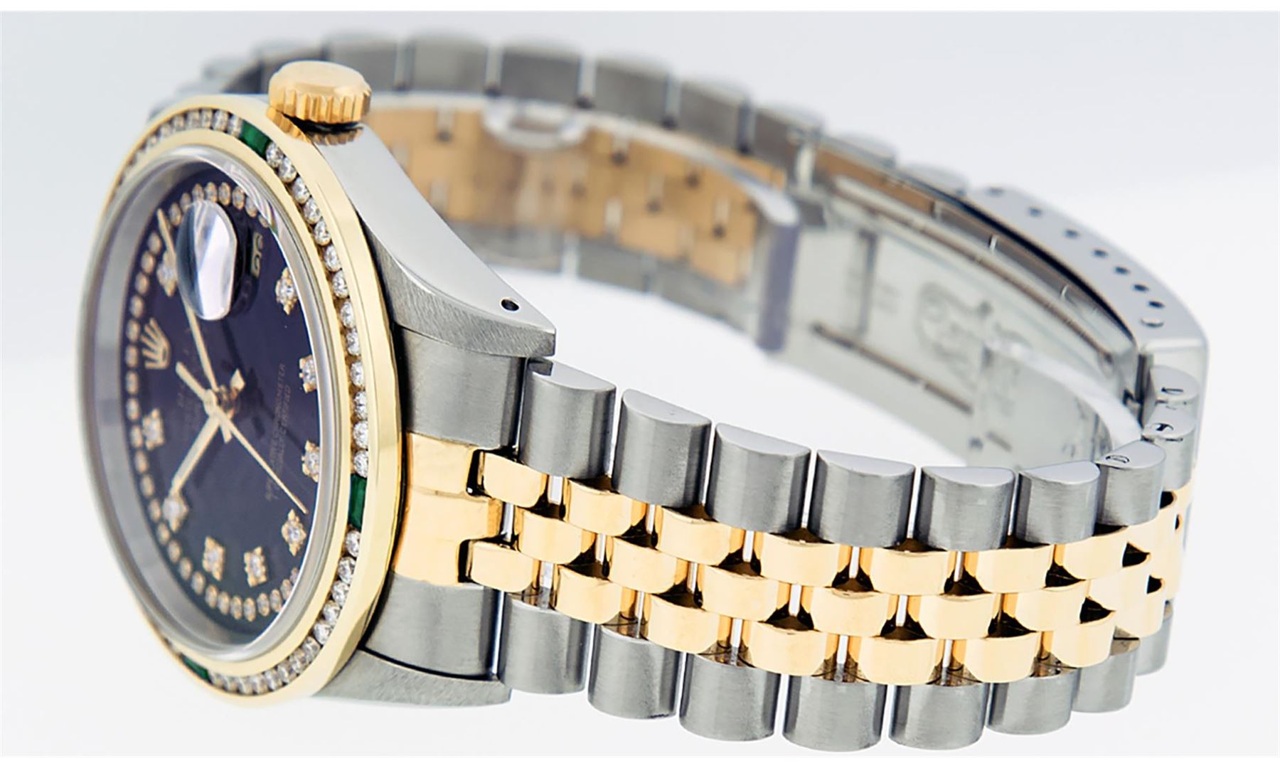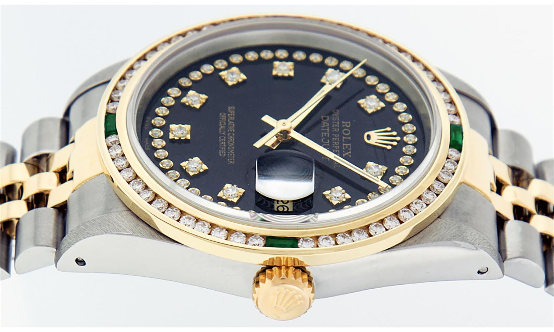 One Mens 14K Yellow Gold Two Tone Rolex Datejust Polished, Serviced & Electronically Tested, 14K Yellow Gold & Stainless Steel Case: 36mm, 14K Yellow Gold Crown, Custom Bezel: New 18K Yellow Gold Emerald Channel Set Diamond Bezel, Diamond Count: 52 Diamonds + 4 Emeralds, Total Weight 1.30 Carat, Clarity: SI-VS, Color: G to H. Custom Crystal: New Scratch Resistant Synthetic Sapphire Cyclops Lens. Custom Hands: New Luminecent Hands. Movement: Automatic Winding Movement Caliber 3035. Custom Dial: Black String Diamond Dial With Single Cut Diamonds, Diamond Count: 58 Diamonds in Dial. Date Window: 3 O'Clock Position Date Display, Quickset, Model: 16013 Datejust. Condition: G-6 Extra Fine. Bracelet:Two Tone 14K Yellow Gold & Stainless Steel Jubilee Band. Bright Polish. 7.0 Inch Length, Adjustable. Standard Clasp, With Rolex Logo. This Watch Has Been Serviced Time Tested And Is In Excellent Condition It Is Free Of All Scratches And Dents.