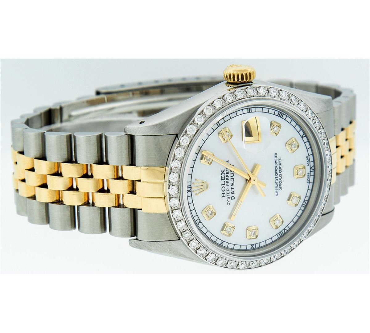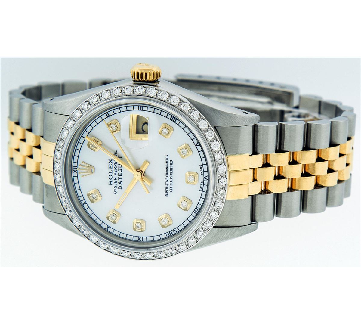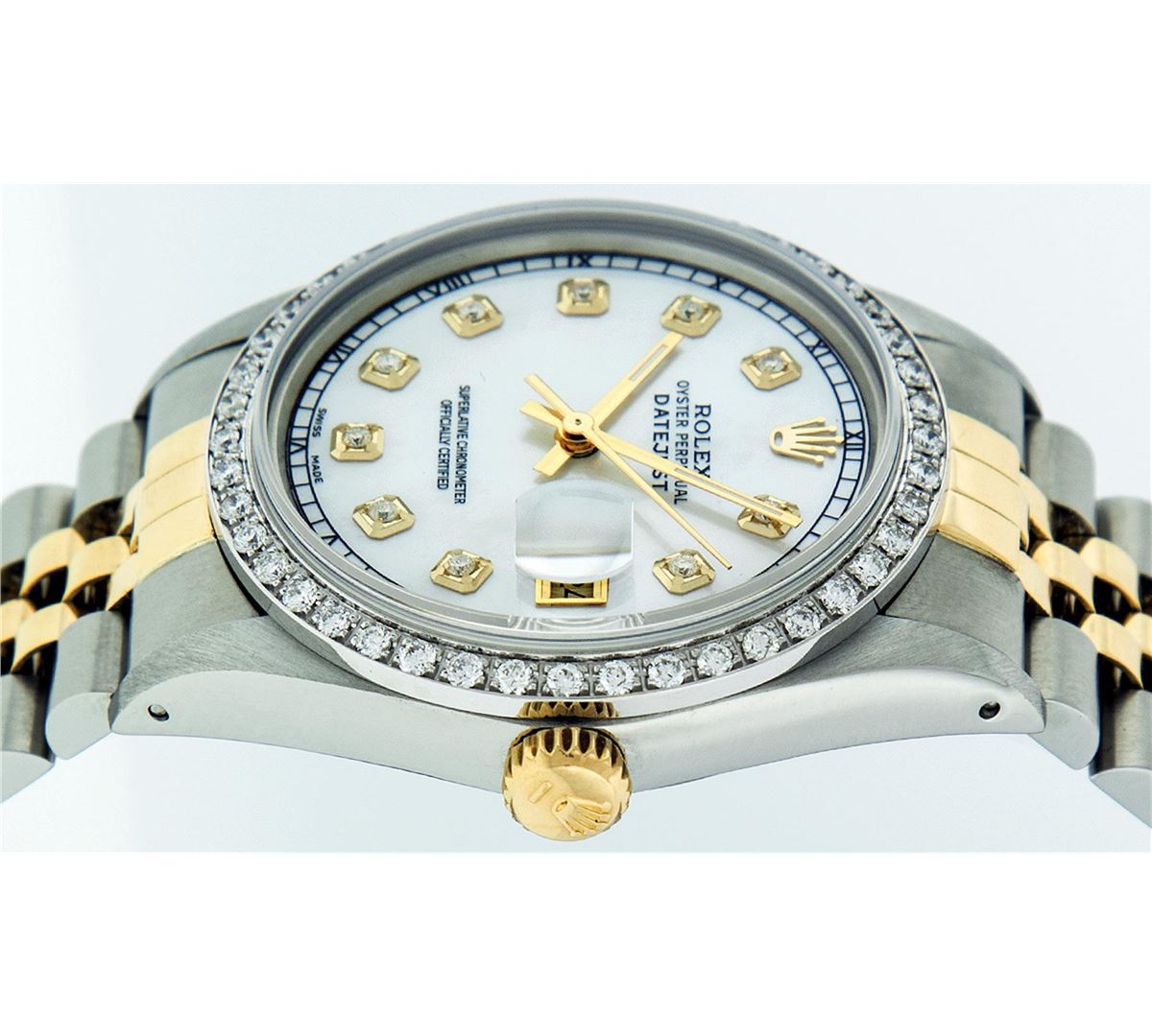 One Mens Two Tone Rolex Datejust Polished, Serviced & Electronically Tested, 14K Yellow Gold & Stainless Steel Case:36mm, 14K Yellow Gold Crown, Custom Bezel: 18K White Gold Beadset Diamond Bezel, Diamond Count: 44 Diamonds, Total Weight 1.00 Carat, Clarity: Si-VS, Color: G to H. Custom Crystal: Synthetic Sapphire Cyclops Lens. Movement: Automatic Winding Movement Caliber 3035. Custom Dial: Mother Of Pearl Diamond Dial, 10 Diamonds in Dial G To H In Color, Si-VS Clarity, Date Window: 3 O'Clock Position Date Display, Quickset, Model: 16013 Condition: G-6 Extra Fine. Bracelet:Two Tone 14K Yellow Gold & Stainless Steel Jubilee. Bright Polish. 7.0 Inch Length, Adjustable. Standard Clasp, With Rolex Logo.