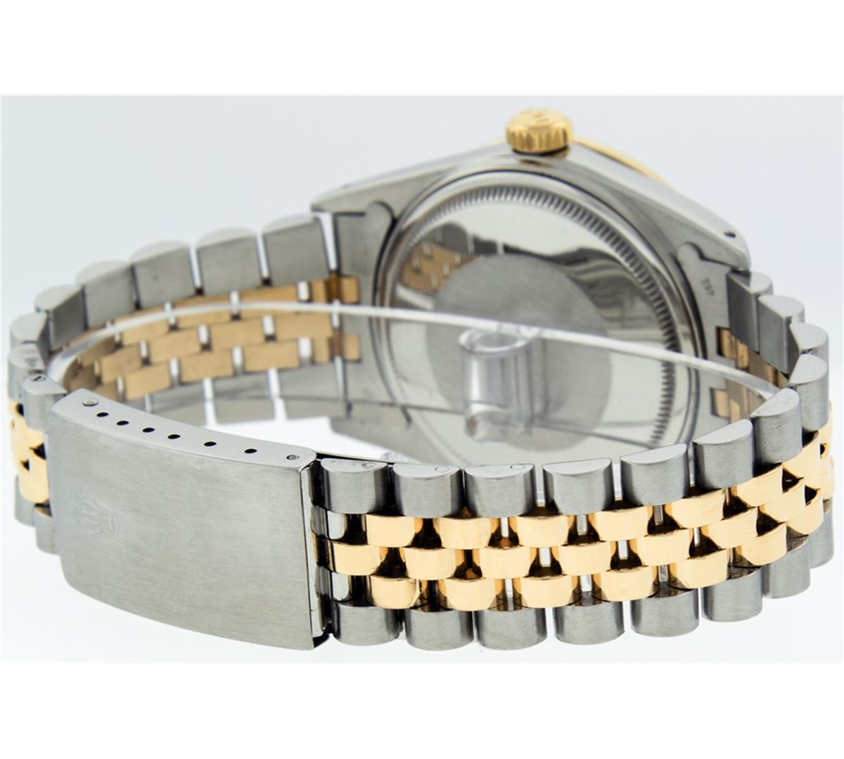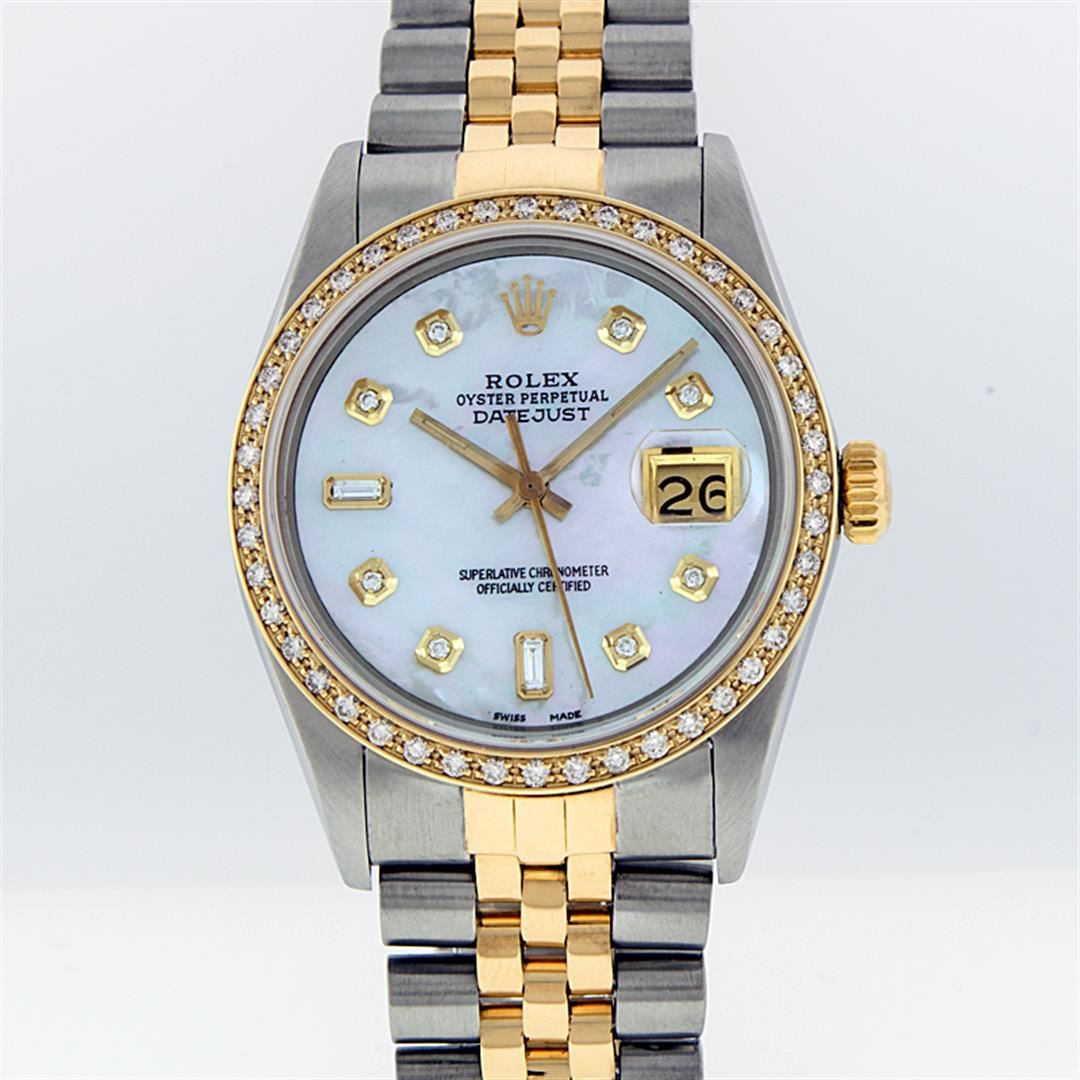 One Gents Two Tone Rolex Datejust Polished, Serviced & Electronically Tested, 14K Yellow Gold & Stainless Steel Case:36mm, 14K Yellow Gold Crown, Custom Bezel: 18K Yellow Gold Bead Set Diamond Bezel, Diamond Count: 44 Diamonds Total Weight 1.0 Carat, Clarity: Si-VS, Color: G to H. Custom Crystal: Synthetic Sapphire Cyclops Lens. Movement: Automatic Winding Movement Caliber 3035. Custom Dial: Mother Of Pearl Diamond + Baguette Dial, Diamond Count: 8 Diamonds + 2 Baguette, Color: G to H, Clarity: SI-VS Date Window: 3 O'Clock Position Date Display, Quickset, Model: 16013 Condition: G-6 Extra Fine. Bracelet: Two Tone 14K Yellow Gold & Stainless Steel Jubilee. Bright Polish. 7.0 Inch Length, Adjustable. Standard Clasp, With Rolex Logo.
