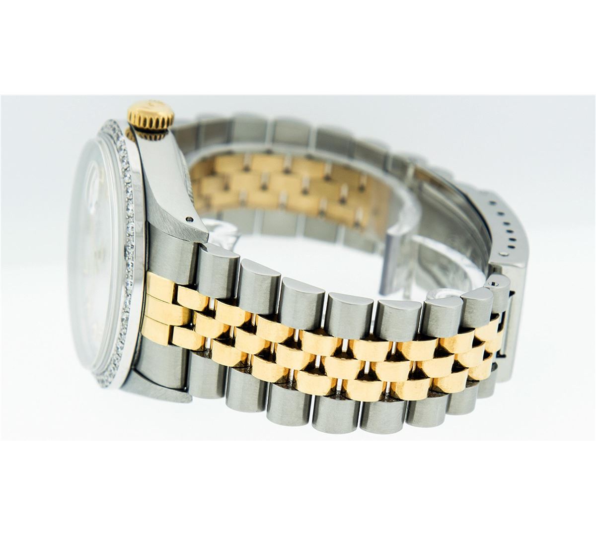 One Mens Two Tone Rolex Datejust Polished, Serviced & Electronically Tested, 14K Yellow Gold & Stainless Steel Case:36mm, 14K Yellow Gold Crown, Custom Bezel: 18K White Gold Beadset Diamond Bezel, Diamond Count: 44 Diamonds, Total Weight 1.00 Carat, Clarity: Si-VS, Color: G to H. Custom Crystal: Synthetic Sapphire Cyclops Lens. Movement: Automatic Winding Movement Caliber 3035. Custom Dial: Mother Of Pearl Diamond Dial, 10 Diamonds in Dial G To H In Color, Si-VS Clarity, Date Window: 3 O'Clock Position Date Display, Quickset, Model: 16013 Condition: G-6 Extra Fine. Bracelet:Two Tone 14K Yellow Gold & Stainless Steel Jubilee. Bright Polish. 7.0 Inch Length, Adjustable. Standard Clasp, With Rolex Logo.