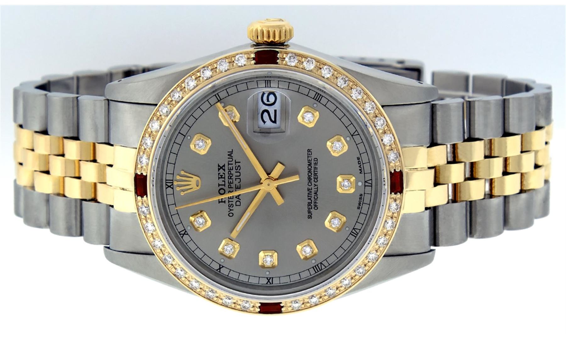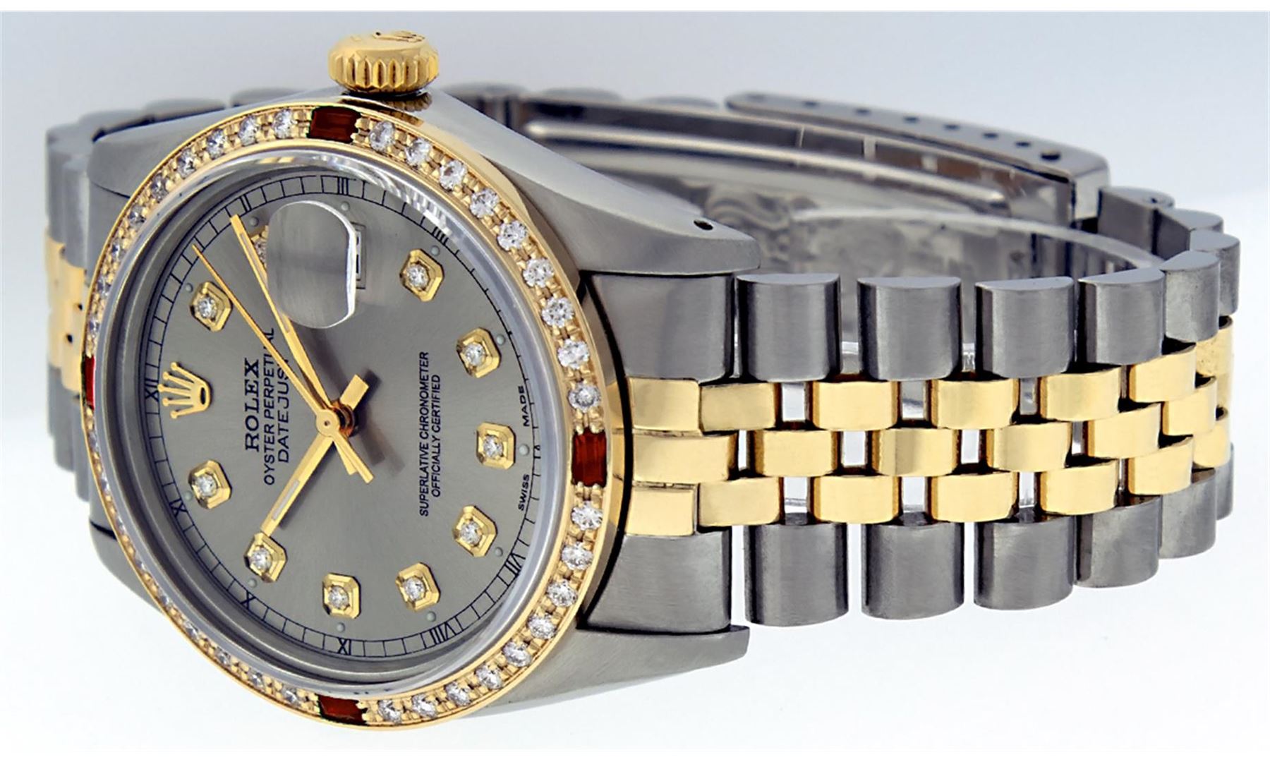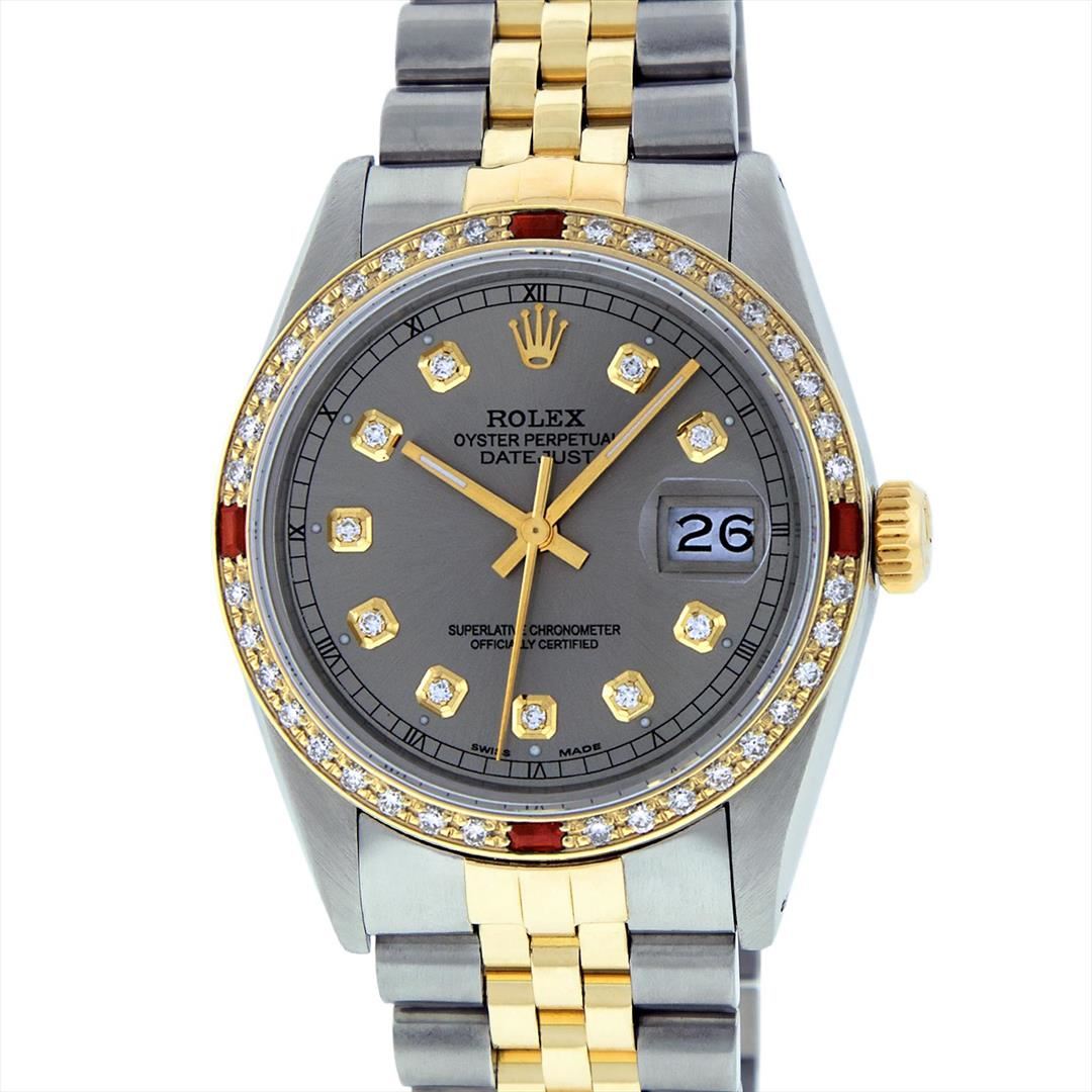 One Gents Two Tone Rolex Datejust Polished, Fully Serviced & Electronically Tested, 14K Yellow Gold & Stainless Steel Case:36mm, 14K Yellow Gold Crown, Custom Bezel: 18K Yellow Gold Ruby Beadset Diamond Bezel, Diamond Count: 36 Diamonds + 4 Rubies, Total Weight 1.0 Carat, Clarity: Si-VS, Color: G to H. Custom Crystal: Synthetic Sapphire Cyclops Lens. Movement: Automatic Winding Movement Caliber 3035. Custom Dial: Slate Grey Diamond Dial With Square Track and Luminescent Dots. Diamond Count: 10 Diamonds In Dial, Color: G to H, Clarity: SI-VS. Date Window: 3 O'Clock Position Date Display, Quickset, Model: Datejust Condition: G-6 Extra Fine. Bracelet: Two Tone 14K Yellow Gold & Stainless Steel Jubilee. Bright Polish. 6.5 Inch Length, Adjustable. Standard Clasp, With Rolex Logo.