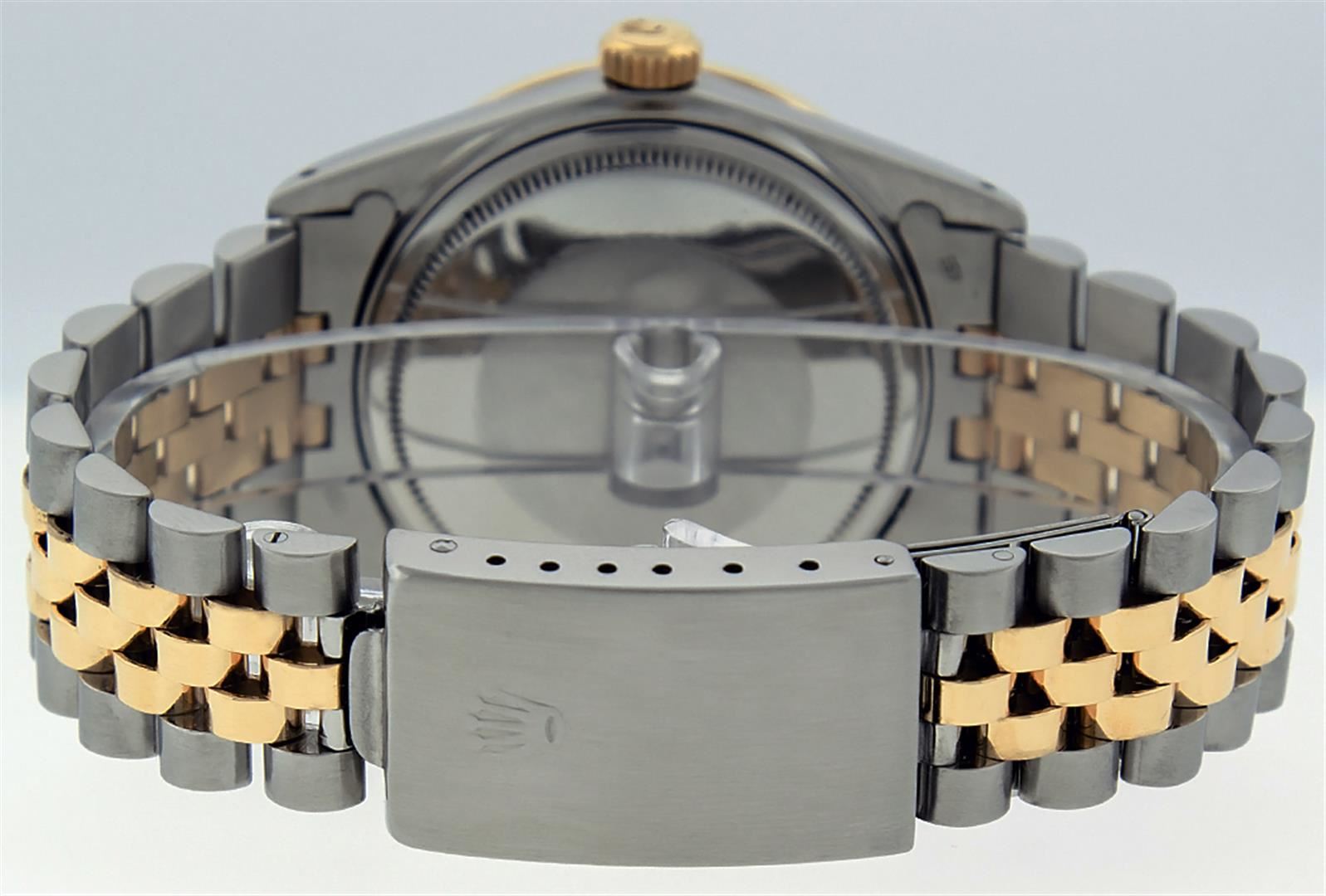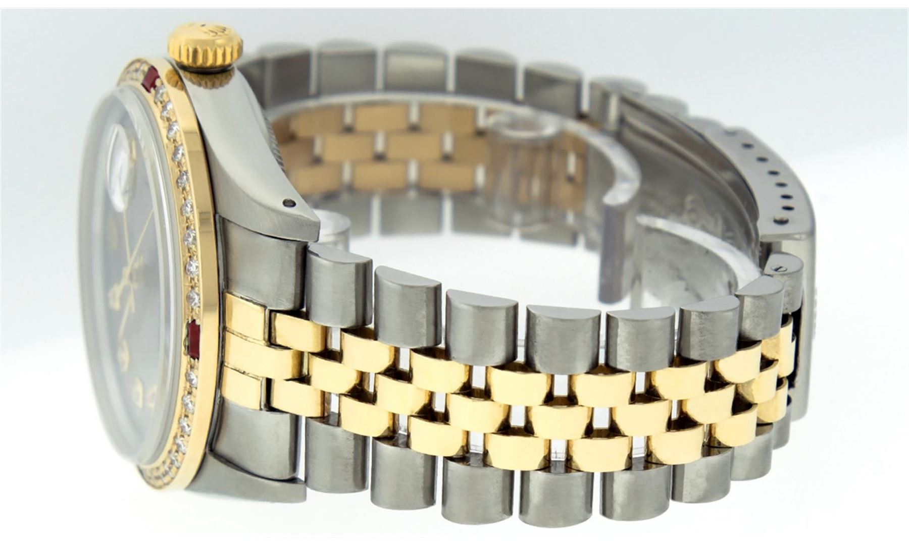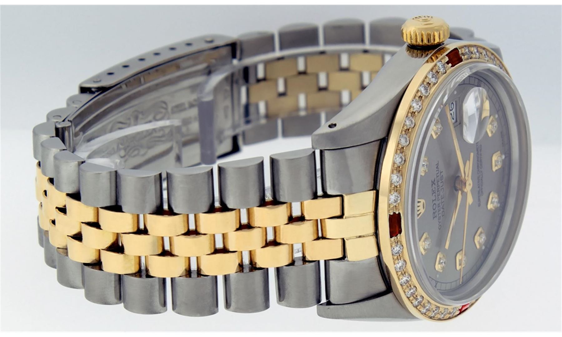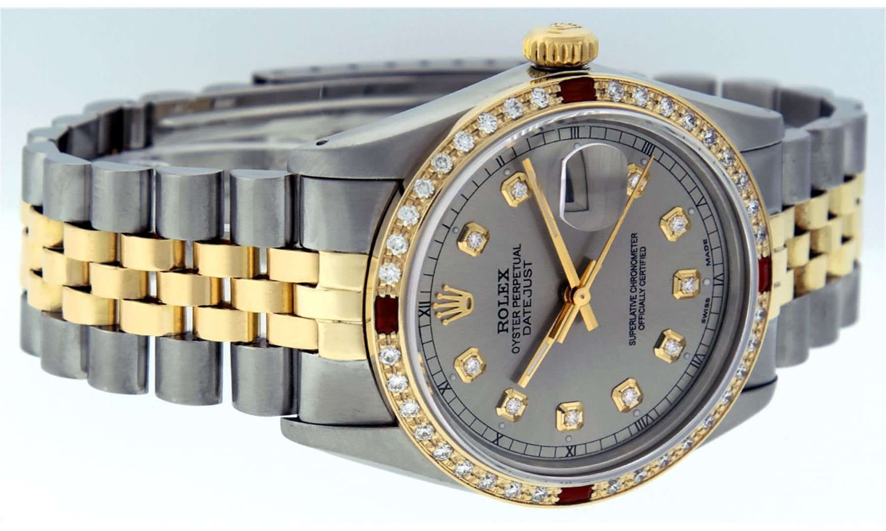 One Gents Two Tone Rolex Datejust Polished, Fully Serviced & Electronically Tested, 14K Yellow Gold & Stainless Steel Case:36mm, 14K Yellow Gold Crown, Custom Bezel: 18K Yellow Gold Ruby Beadset Diamond Bezel, Diamond Count: 36 Diamonds + 4 Rubies, Total Weight 1.0 Carat, Clarity: Si-VS, Color: G to H. Custom Crystal: Synthetic Sapphire Cyclops Lens. Movement: Automatic Winding Movement Caliber 3035. Custom Dial: Slate Grey Diamond Dial With Square Track and Luminescent Dots. Diamond Count: 10 Diamonds In Dial, Color: G to H, Clarity: SI-VS. Date Window: 3 O'Clock Position Date Display, Quickset, Model: Datejust Condition: G-6 Extra Fine. Bracelet: Two Tone 14K Yellow Gold & Stainless Steel Jubilee. Bright Polish. 6.5 Inch Length, Adjustable. Standard Clasp, With Rolex Logo.