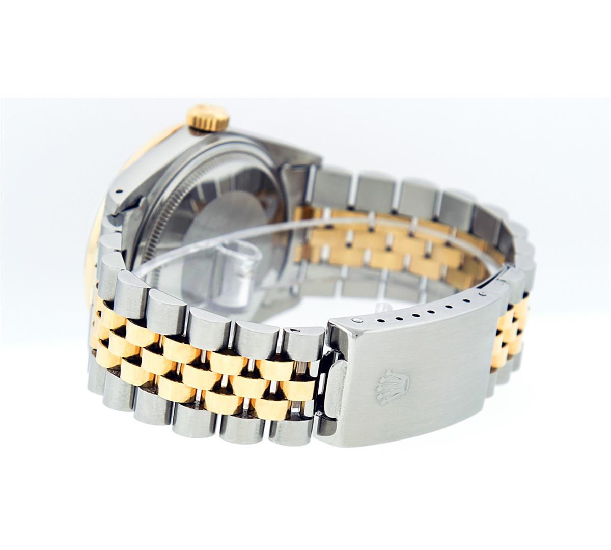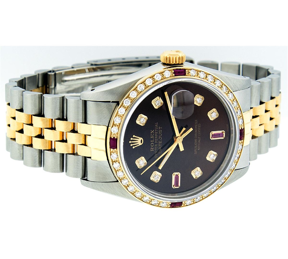 One Mens Two Tone Rolex Datejust Polished, Serviced & Electronically Tested, 14K Yellow Gold & Stainless Steel Case:36mm, 14K Yellow Gold Crown, Custom Bezel: 18K Yellow Gold Ruby Beadset Diamond Bezel, Diamond + Gem Count: 38 Diamonds + 4 Rubies Total Weight 1.00 Carat, Clarity: Si-VS, Color: G to H. Custom Crystal: Synthetic Sapphire Cyclops Lens. Movement: Automatic Winding Movement Caliber 3035. Custom Dial: Brown Diamond Dial + 2 Ruby Baguettes, Diamond Count: 8 Baguettes + 2 Ruby Baguettes  in Dial, Dial Weight: .20 Carat G To H In Color, Clarity: SI-VS Date Window: 3 O'Clock Position Date Display,  Quickset, Model: 16013 Condition: G-6 Extra Fine. Bracelet:Two Tone 14K Yellow Gold & Stainless Steel Jubilee. Bright Polish. 7.0 Inch Length, Adjustable. Standard Clasp, With Rolex Logo.
