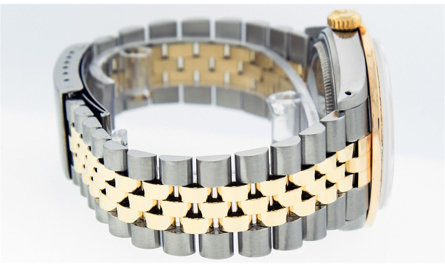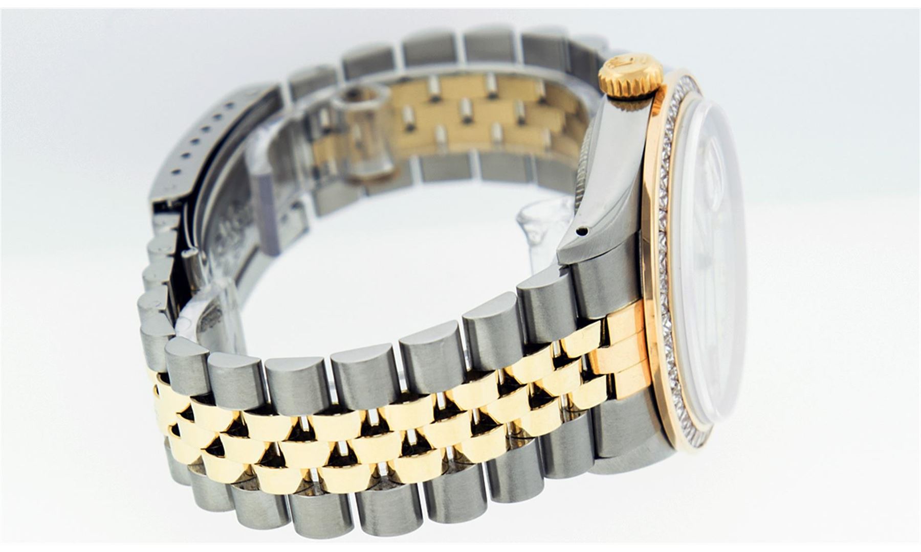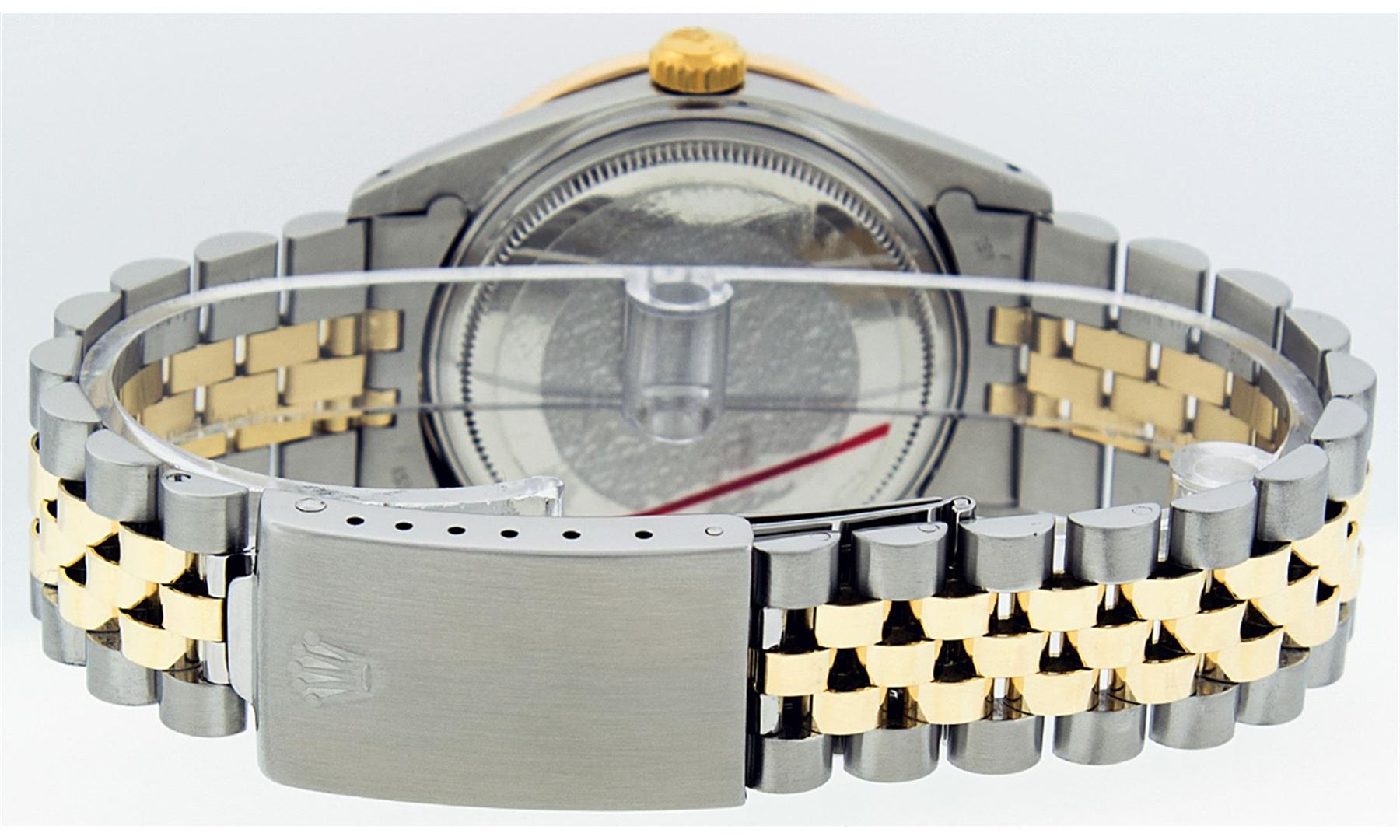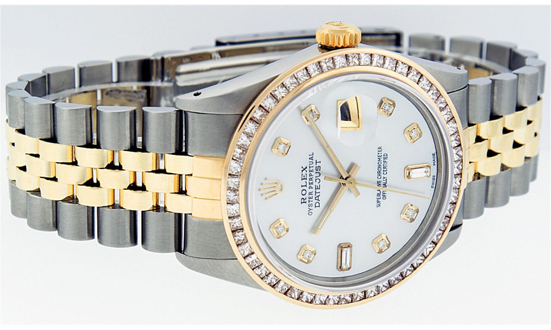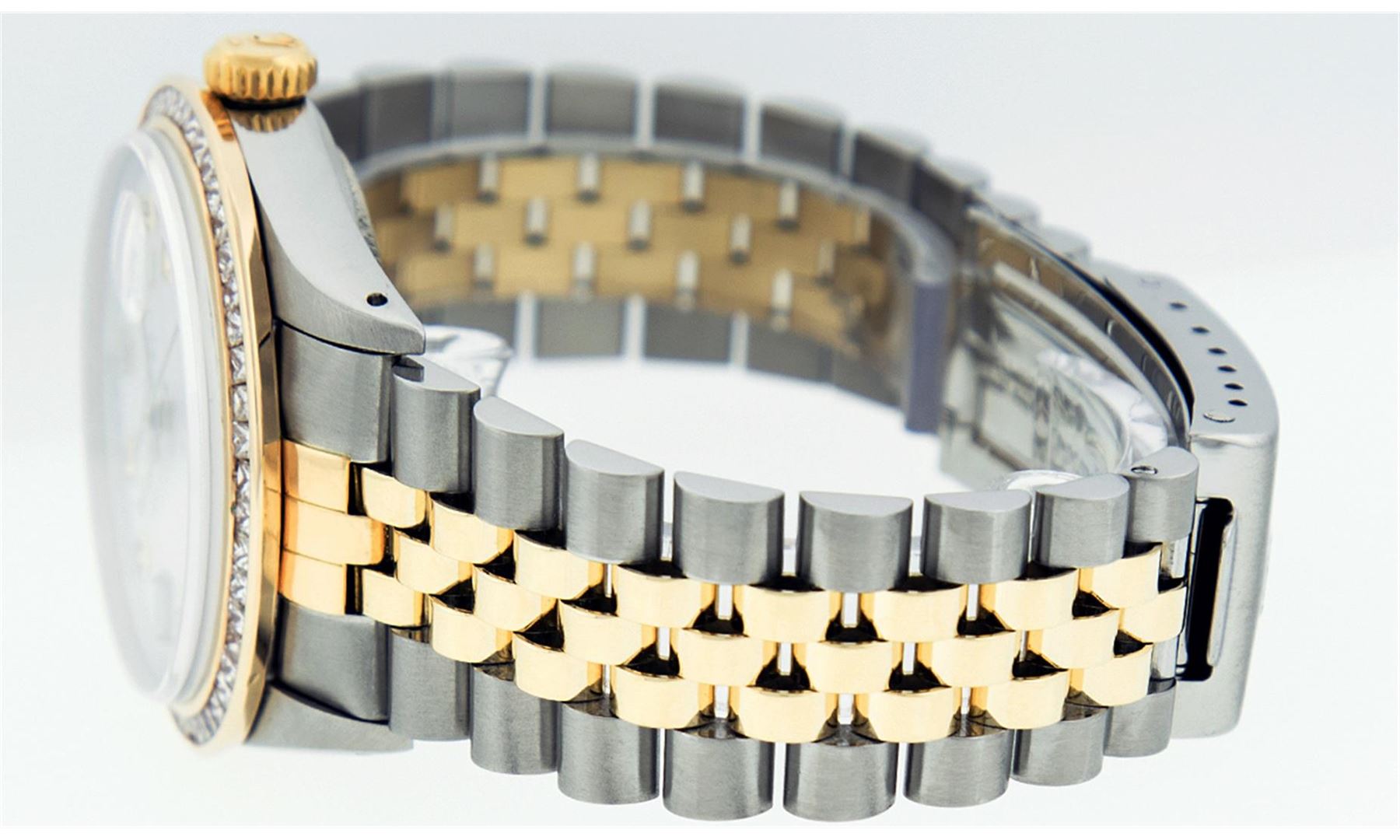 One Mens Two Tone Rolex Datejust Polished Bright with Satin Finish, Serviced & Electronically Tested, 14K Yellow Gold And Stainless Steel Case:36mm, 14K Yellow Gold Crown, Custom Bezel: 14K Yellow Gold Princess Cut Diamond Bezel, Diamond Count: 53 Diamonds, Total Weight 2.75 Carat, Clarity: SI-VS, Color: G to H. Custom Crystal: Synthetic Sapphire Cyclops Lens. Movement: Automatic Winding Movement Caliber 3035. Custom Dial: Mother Of Pearl 8 + 2 Diamond Dial, Diamond Count: 8 Diamonds in Dial + 2 Baguettes, Diamond Color: G To H In Color, Clarity: VS2-SI1. Date Window: 3 O'Clock Position Date Display, Quickset, Model: 16013 Condition: G-6 Extra Fine. Bracelet: 14K Yellow Gold And Stainless Steel Jubilee. Bright Polish & Satin Finish. 7.0 Inch Length, Adjustable. Standard Clasp, With Rolex Logo.