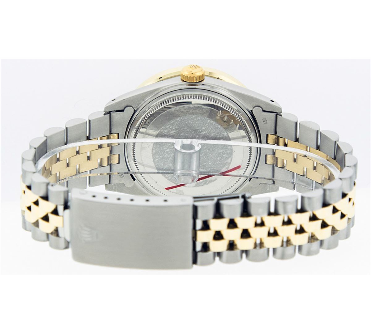 One Mens Rolex Datejust Polished Bright with Satin Finish, Serviced & Electronically Tested, 14K Yellow Gold and Stainless Steel Case:36mm, Stainless Steel Crown, Custom Bezel: 18K Yellow Gold Channel Set Diamond Bezel, Diamond Count: 40 Diamonds, Total Weight 3.00 Carat, Clarity: SI-VS, Color: G to H. Custom Crystal: Synthetic Sapphire Cyclops Lens. Movement: Automatic Winding Movement Caliber 3035. Custom Dial: Mother Of Pearl Diamond, Diamond Count: 8 Diamond + 2 Baguettes in Dial, Dial Color: G To H In Color, Clarity: SI-VS. Date Window: 3 O'Clock Position Date Display, Quickset, Model: 16013 Condition: G-6 Extra Fine. Bracelet: 14K Yellow Gold and Stainless Steel Jubilee. Bright Polish & Satin Finish. 7.0 Inch Length, Adjustable. Standard Clasp, With Rolex Logo.