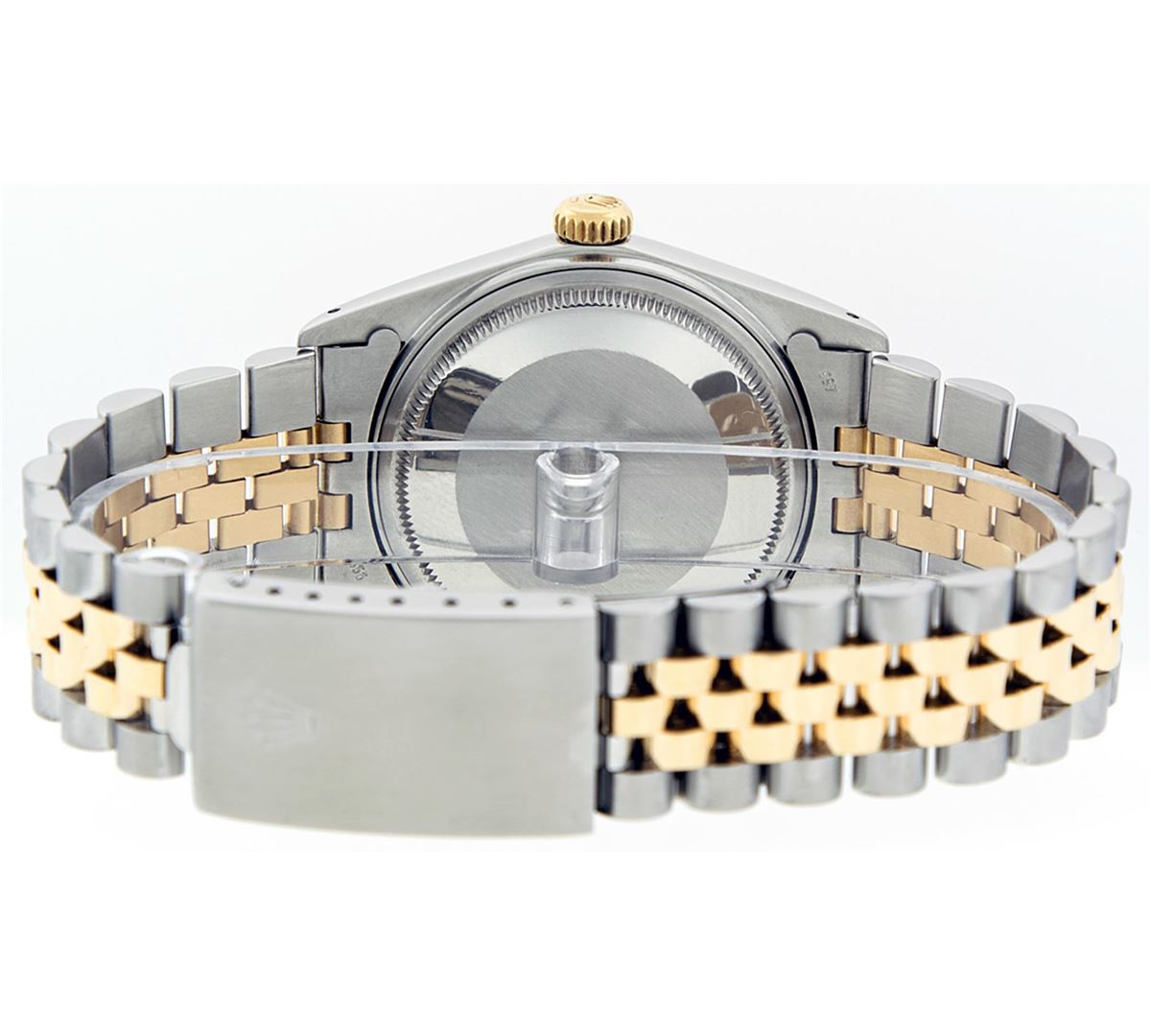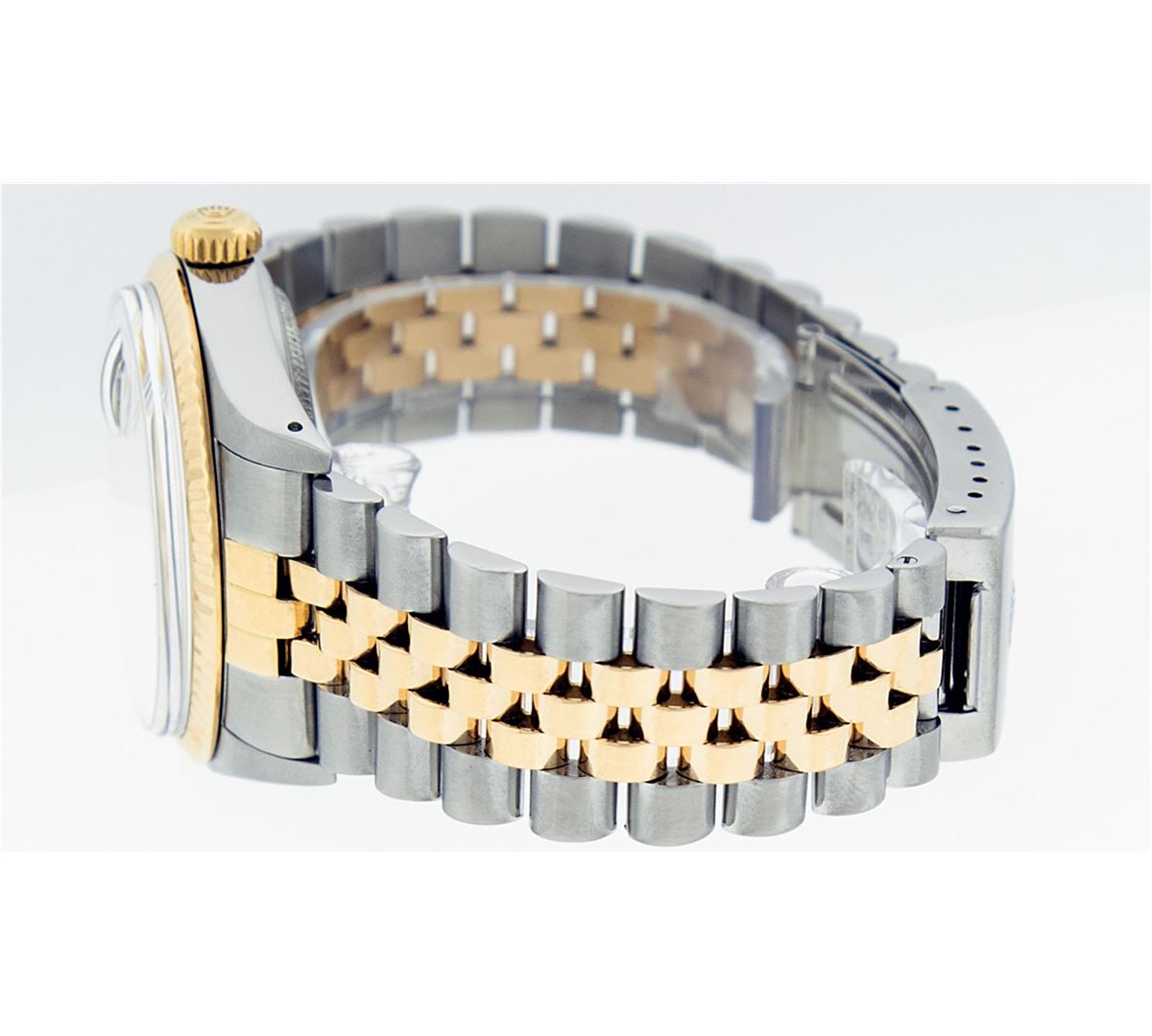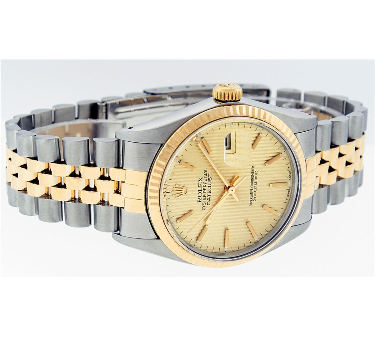 One Mens Two Tone Rolex Datejust Polished, Serviced & Electronically Tested, 14K Yellow Gold & Stainless Steel Case: 36mm, 14K Yellow Gold Crown, Bezel: 14K Yellow Gold Fluted Bezel. Custom Crystal: Acrylic Cyclops Lens. Movement: Automatic Winding Movement Caliber 3035. Custom Dial: Champagne Tapestry Dial With Index Hour Markers and Small Track. Date Window: 3 O'Clock Position Date Display, Quickset, Model: 16013 Condition: G-6 Extra Fine. Bracelet:Two Tone 14K Yellow Gold & Stainless Steel Jubilee. Bright Polish. 7.0 Inch Length, Adjustable. Standard Clasp, With Rolex Logo.