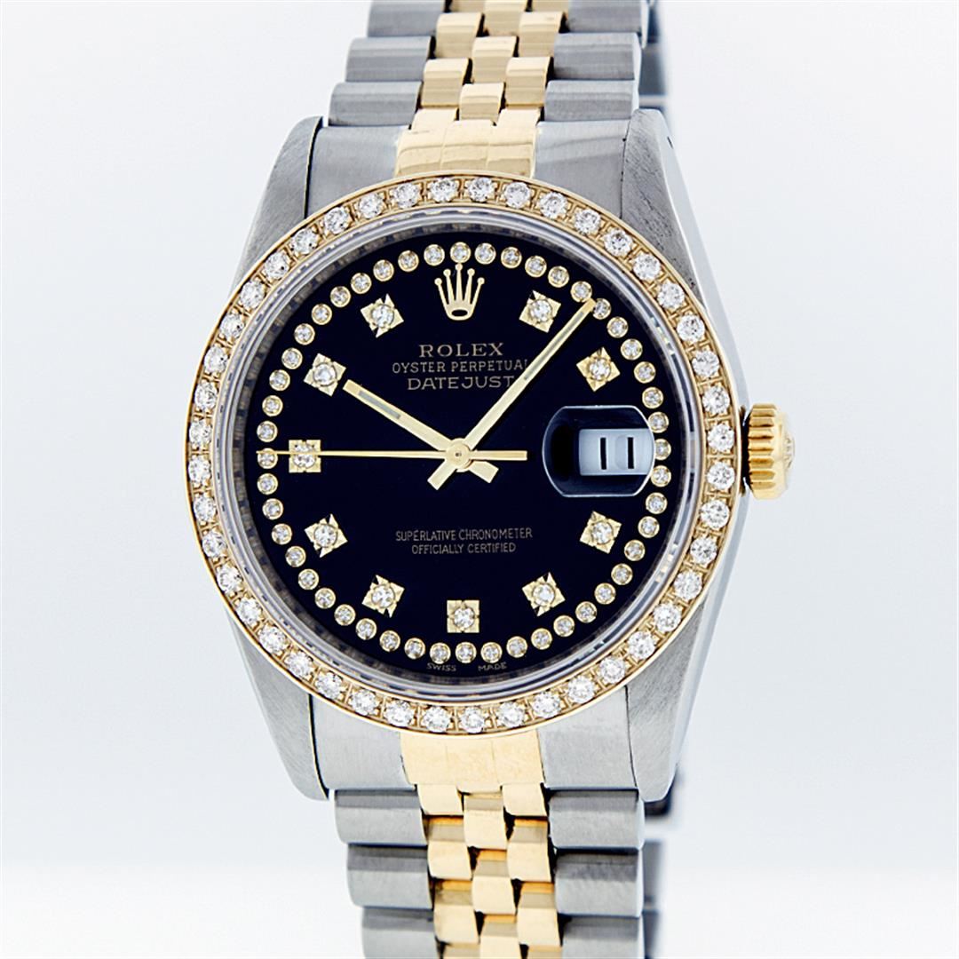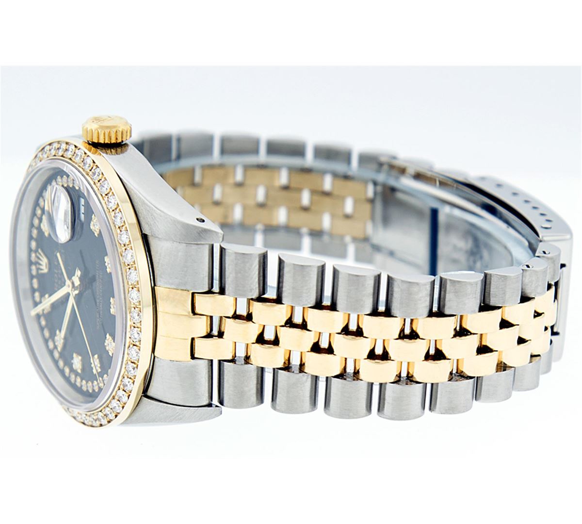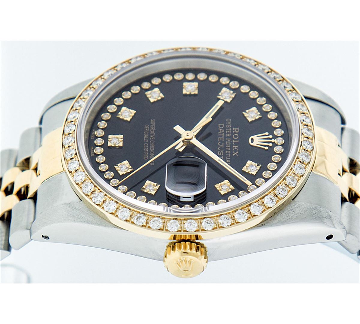 One Mens Two Tone Rolex Datejust Polished, Serviced & Electronically Tested, 14K Yellow Gold & Stainless Steel Case:36mm, 14K Yellow Gold Crown, Custom Bezel: 18K Yellow Gold Beadset Diamond Bezel, Diamond Count: 44 Diamonds, Total Weight 1.00 Carat, Clarity: Si-VS, Color: G to H. Custom Crystal: Synthetic Sapphire Cyclops Lens. Movement: Automatic Winding Movement Caliber 3035. Custom Dial: Black VVS String Diamond Dial, Diamond Count: 58 Diamonds in Dial G To H In Color, VVS In Clarity. Date Window: 3 O'Clock Position Date Display, Quickset, Model: 16013 Condition: G-6 Extra Fine. Bracelet:Two Tone 14K Yellow Gold & Stainless Steel Jubilee. Bright Polish. 7.0 Inch Length, Adjustable. Standard Clasp, With Rolex Logo.