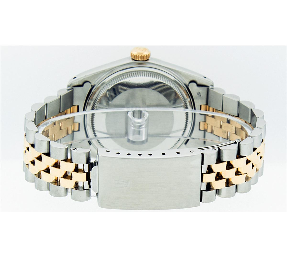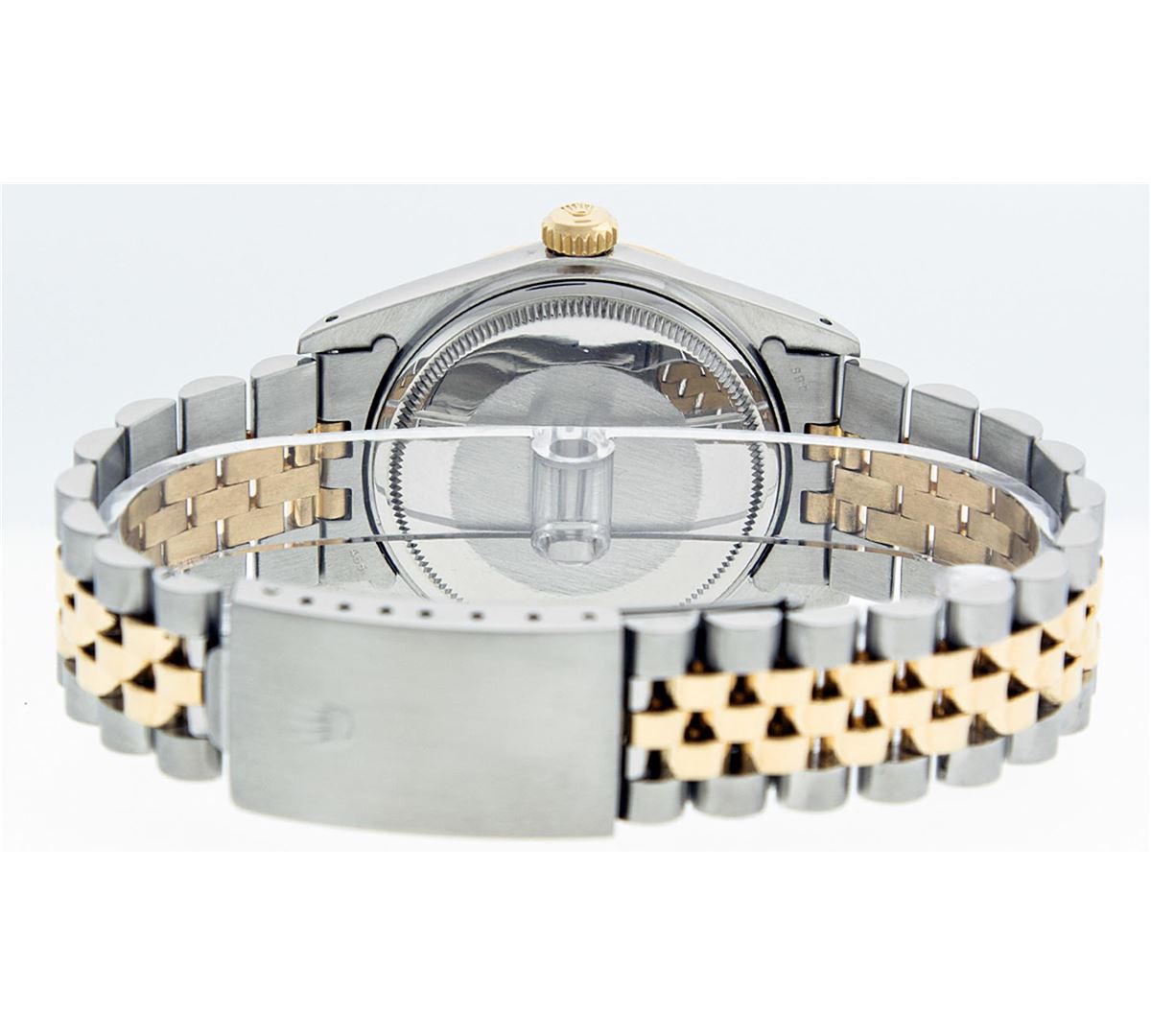 One Mens Two Tone Rolex Datejust Polished, Serviced & Electronically Tested, 14K Yellow Gold & Stainless Steel Case: 36mm,14K Yellow Gold Crown, Bezel: 14K Yellow Gold Fluted Bezel. Custom Crystal: Acrylic Cyclops Lens. Movement: Automatic Winding Movement Caliber 3035. Custom Dial: Champagne Dial With Index Hour Markers and Small Track. Date Window: 3 O'Clock Position Date Display, Quickset, Model: 16013 Condition: G-6 Extra Fine. Bracelet:Two Tone 14K Yellow Gold & Stainless Steel Jubilee. Bright Polish. 7.0 Inch Length, Adjustable. Standard Clasp, With Rolex Logo.