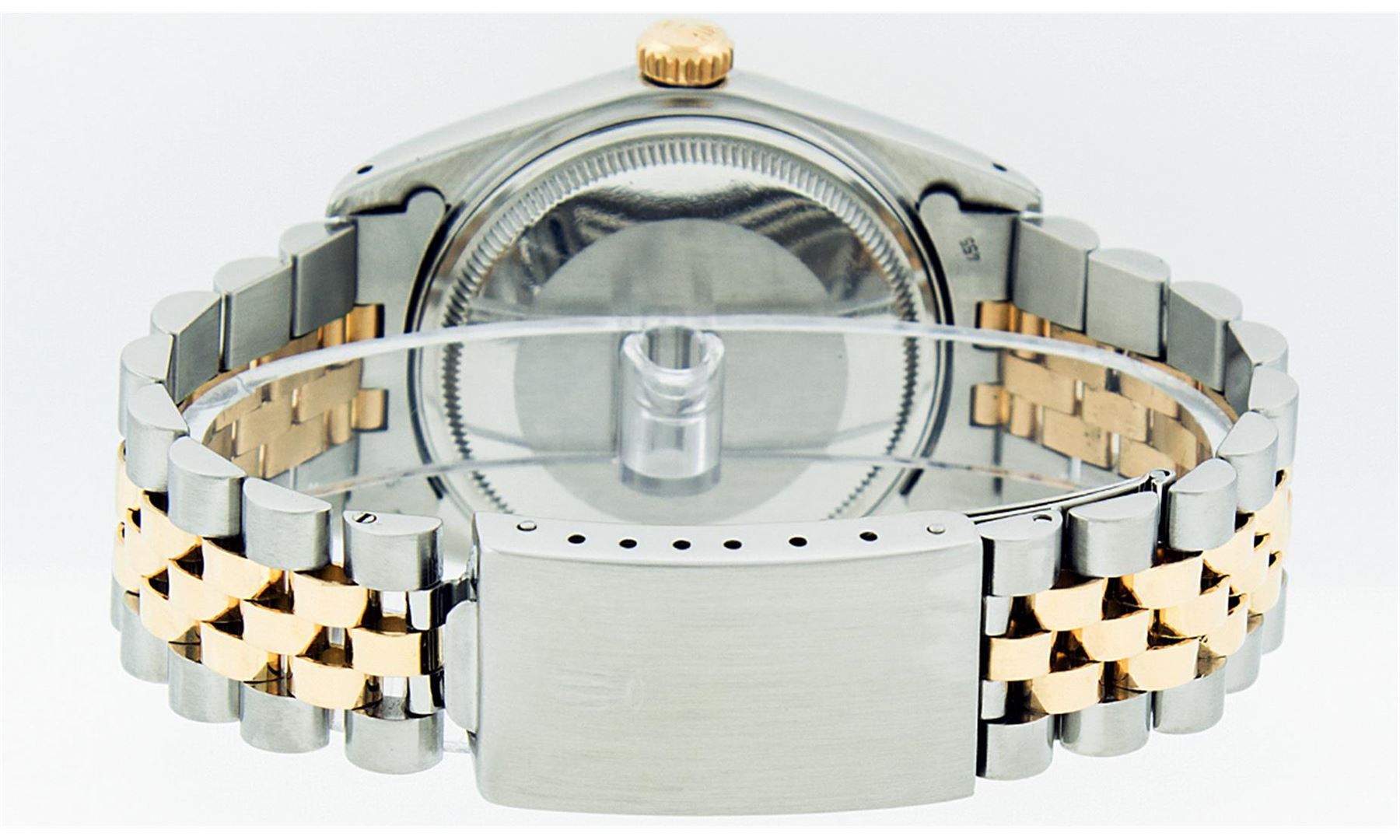 One Mens Two Tone Rolex Datejust Polished, Serviced & Electronically Tested, 14K Yellow Gold & Stainless Steel Case: 36mm,14K Yellow Gold Crown, Bezel: 14K Yellow Gold Fluted Bezel. Custom Crystal: Acrylic Cyclops Lens. Movement: Automatic Winding Movement Caliber 3035. Custom Dial: Champagne Dial With Index Hour Markers and Small Track. Date Window: 3 O'Clock Position Date Display, Quickset, Model: 16013 Condition: G-6 Extra Fine. Bracelet:Two Tone 14K Yellow Gold & Stainless Steel Jubilee. Bright Polish. 7.0 Inch Length, Adjustable. Standard Clasp, With Rolex Logo.