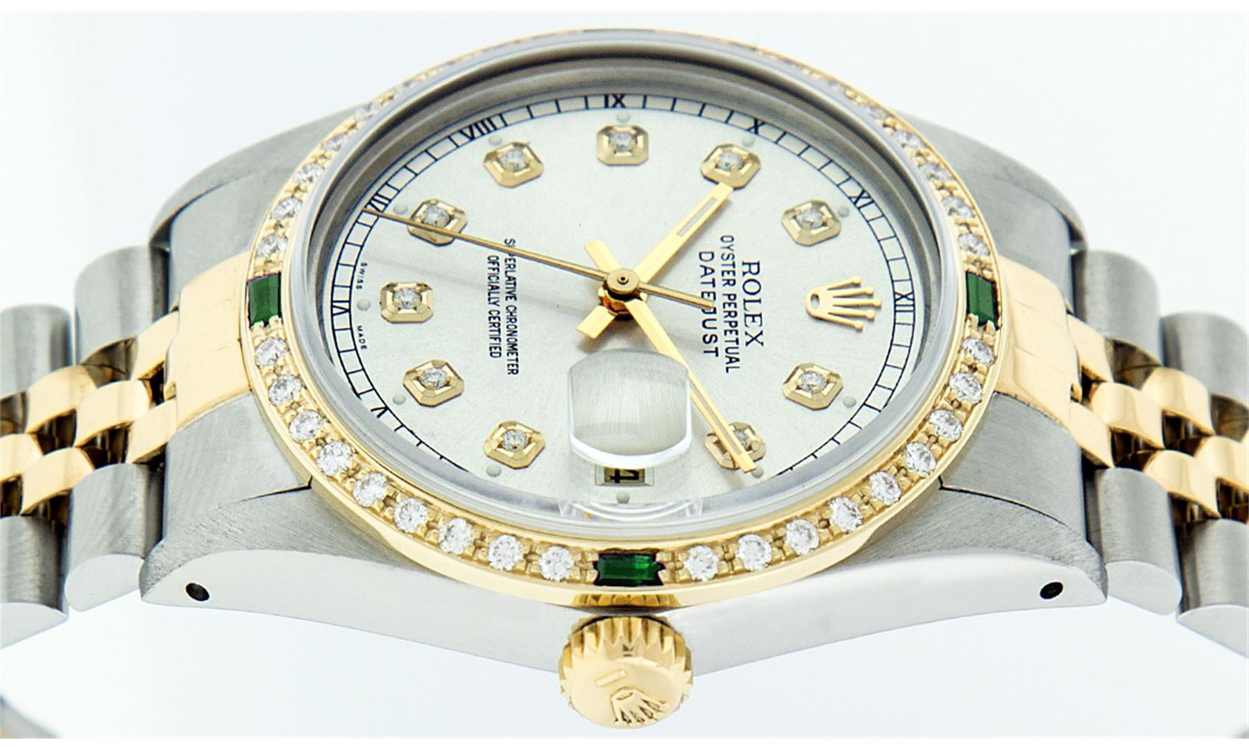 One Mens Two Tone Rolex Datejust Polished, Fully Serviced & Electronically Tested, 14K Yellow Gold & Stainless Steel Case:36mm, 14K Yellow Gold Crown, Custom Bezel: 18K Yellow Gold Emerald Beadset Diamond Bezel, Diamond Count: 36 Diamonds + 4 Emeralds, Total Weight 1.0 Carat, Clarity: Si-VS, Color: G to H. Custom Crystal: Synthetic Sapphire Cyclops Lens. Movement: Automatic Winding Movement Caliber 3035. Custom Dial: Silver Diamond Dial With Square Track and Luminescent Dots. Diamond Count: 10 Diamonds In Dial, Color: G to H, Clarity: SI-VS. Date Window: 3 O'Clock Position Date Display, Quickset, Model: Datejust Condition: G-6 Extra Fine. Bracelet: Two Tone 14K Yellow Gold & Stainless Steel Jubilee. Bright Polish. 7.0 Inch Length, Adjustable. Standard Clasp, With Rolex Logo.