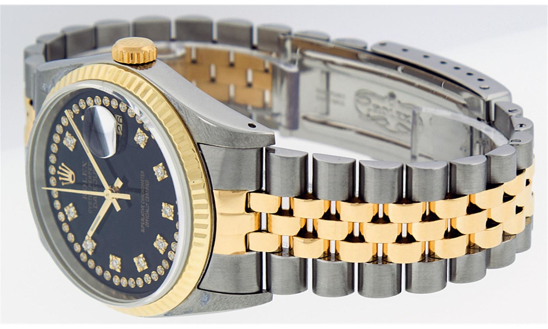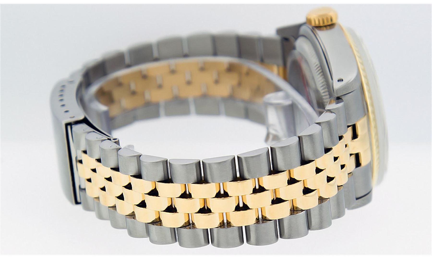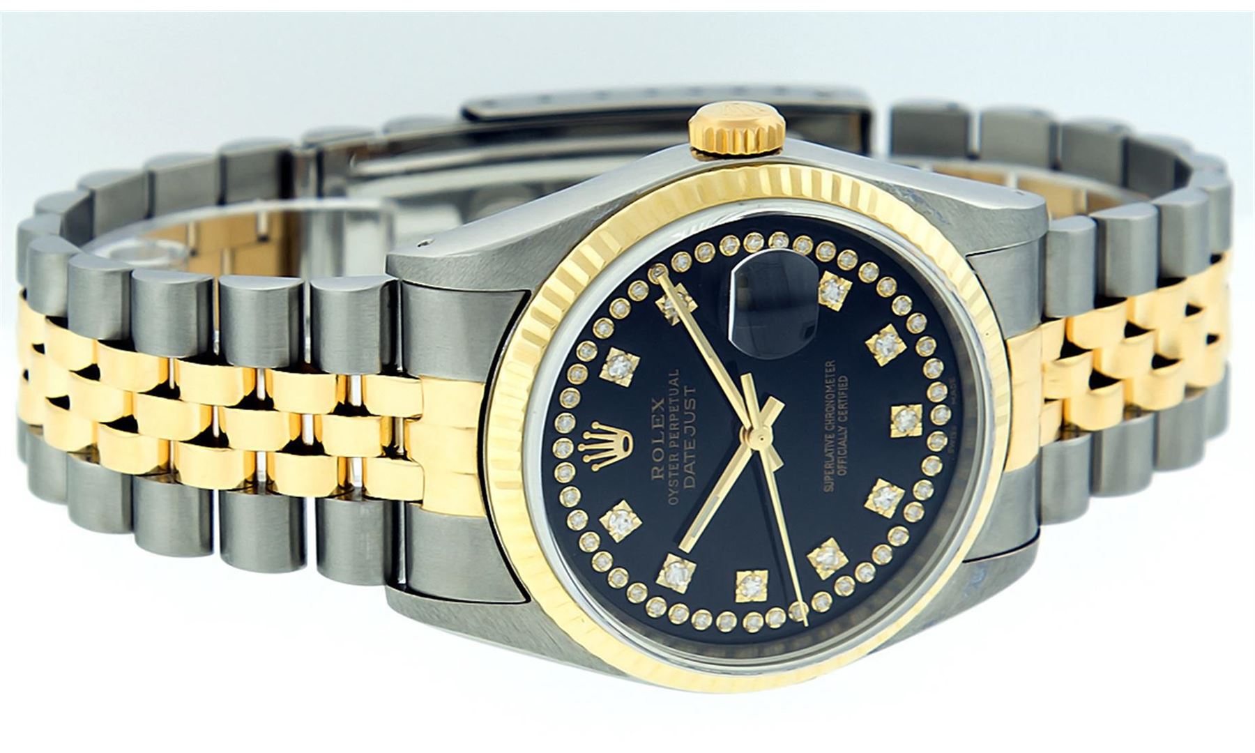 One Mens Two Tone Rolex Datejust Polished, Serviced & Electronically Tested, 14K Yellow Gold & Stainless Steel Case: 36mm, 14K Yellow Gold Crown, Bezel: 14K Yellow Gold Fluted Bezel. Custom Crystal: Acrylic Cyclops Lens. Movement: Automatic Winding Movement Caliber 3035. Custom Dial: Black String VVS Diamond Dial, Diamond Count: 58 Diamonds In Dial, Color: G to H, Clarity: VVS. Date Window: 3 O'Clock Position Date Display, Quickset, Model: 16013 Condition: G-6 Extra Fine. Bracelet: Two Tone 14K Yellow Gold & Stainless Steel Jubilee. Bright Polish. 7.0 Inch Length, Adjustable. Standard Clasp, With Rolex Logo.