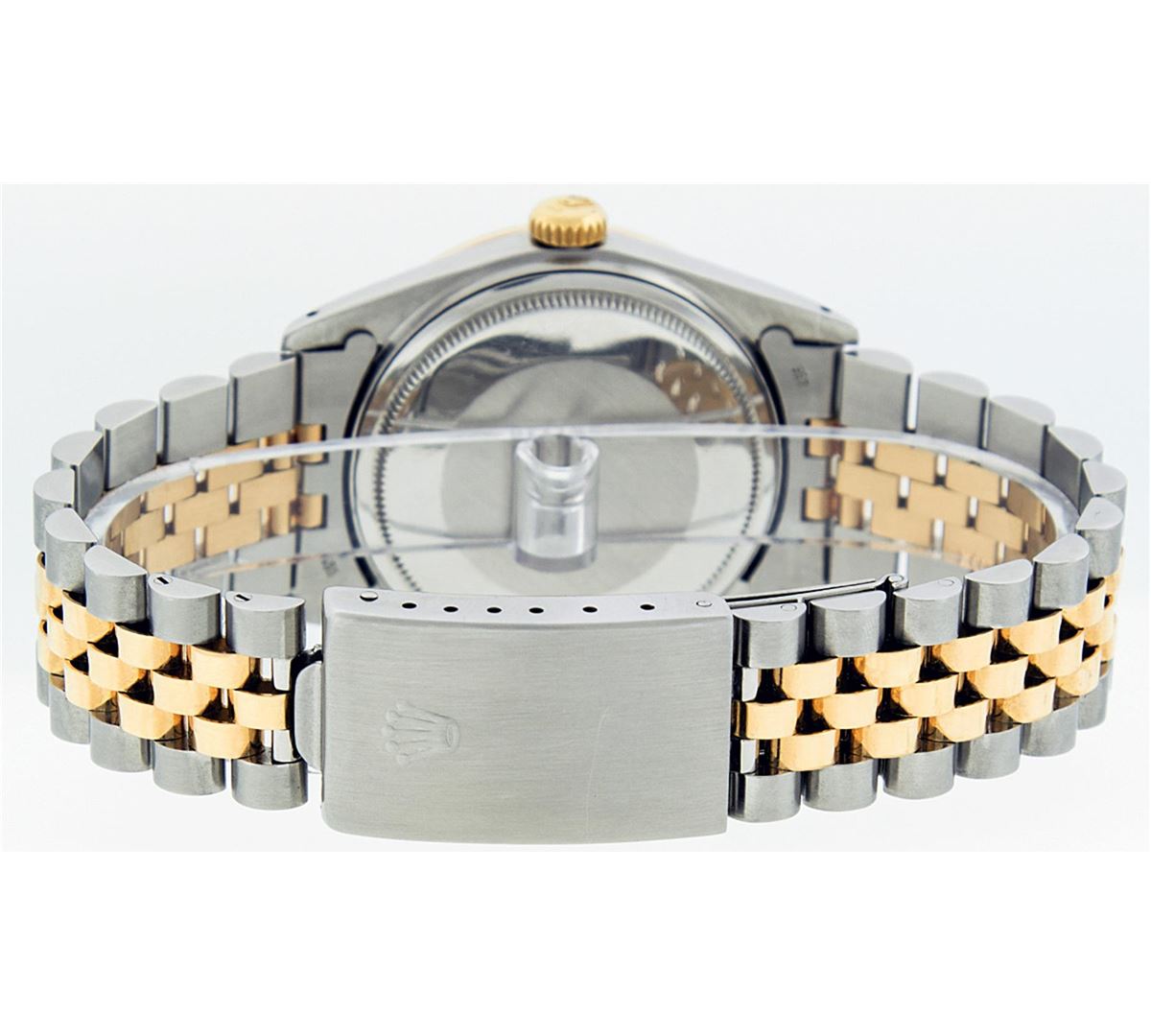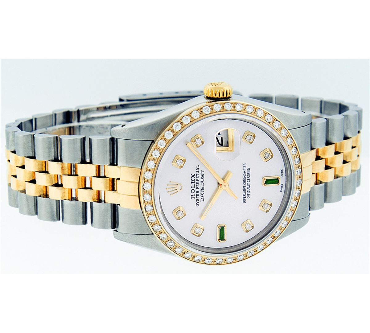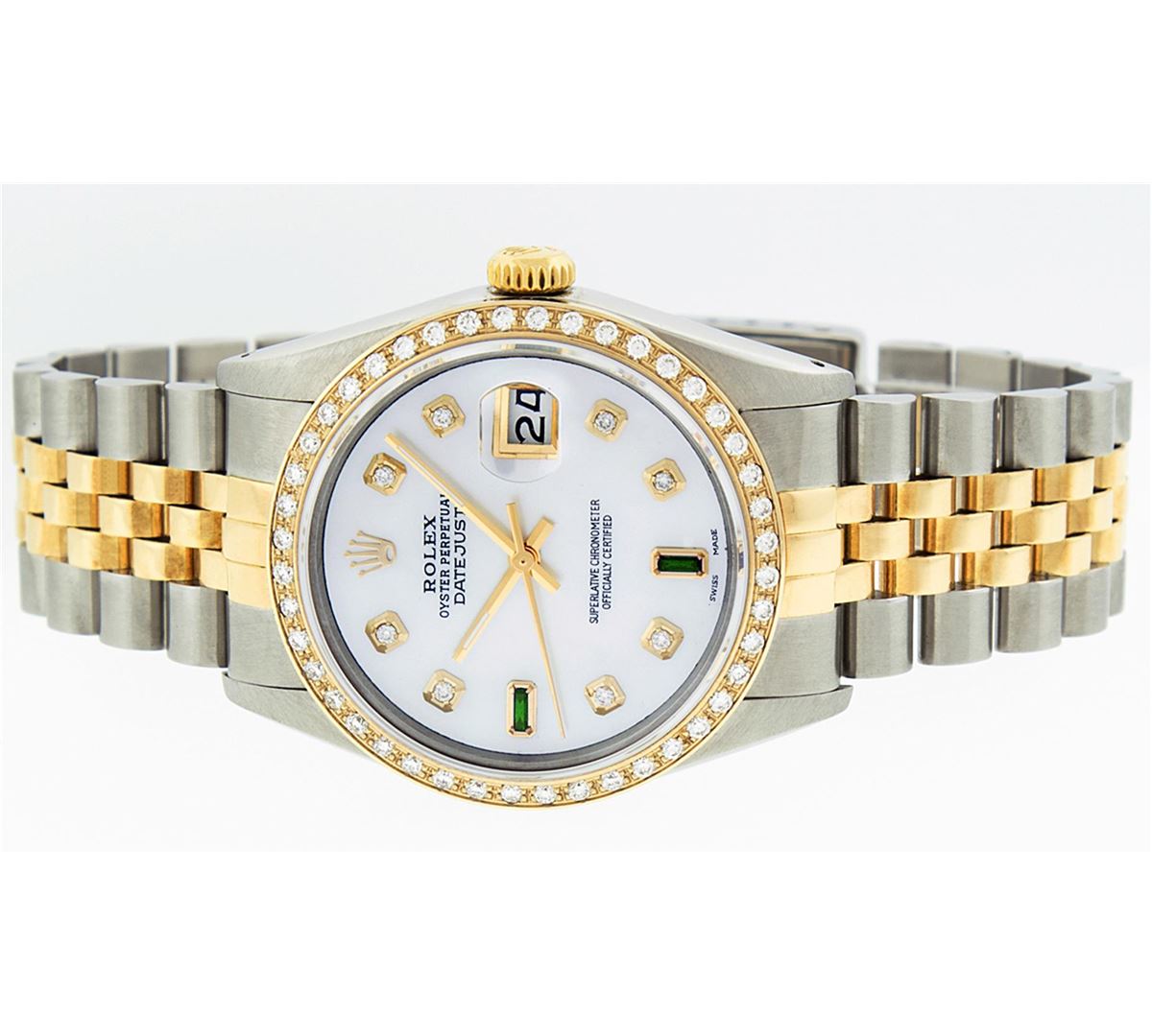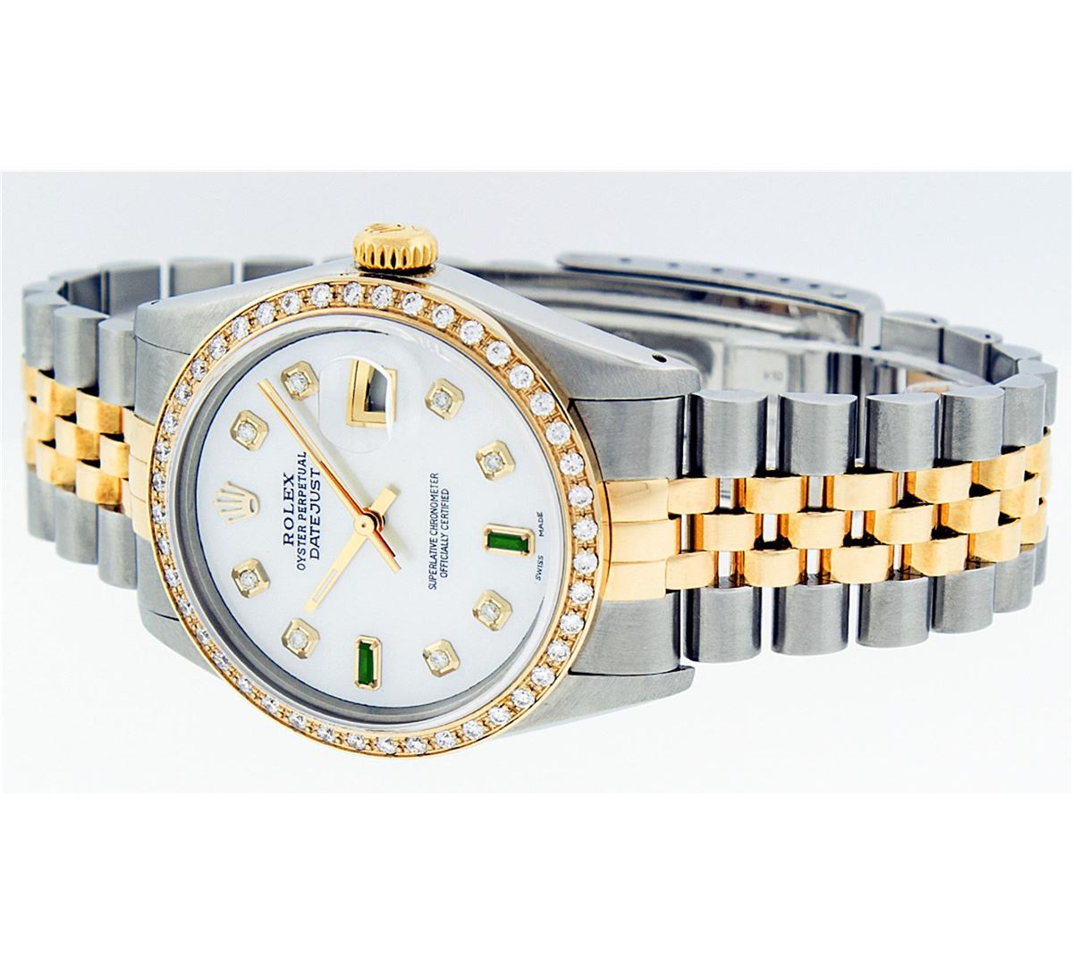 One Mens Two Tone Rolex Datejust Polished, Serviced & Electronically Tested, 14K Yellow Gold & Stainless Steel Case:36mm, 14K Yellow Gold Crown, Custom Bezel: 18K Yellow Gold Beadset Diamond Bezel, Diamond Count: 44 Diamonds. Total Weight 1.00 Carat, Clarity: Si-VS, Color: G to H. Custom Crystal: Synthetic Sapphire Cyclops Lens. Movement: Automatic Winding Movement Caliber 3035. Custom Dial: Mother Of Pearl Diamond With Emerald Baguette, 8 Diamonds + 2 Emerald Baguettes in Dial, Dial Weight: .40 Carat G To H In Color, Clarity: SI-VS Date Window: 3 O'Clock Position Date Display, Quickset, Model: 16013 Condition: G-6 Extra Fine. Bracelet:Two Tone 14K Yellow Gold & Stainless Steel Jubilee. Bright Polish. 7.0 Inch Length, Adjustable. Standard Clasp, With Rolex Logo.