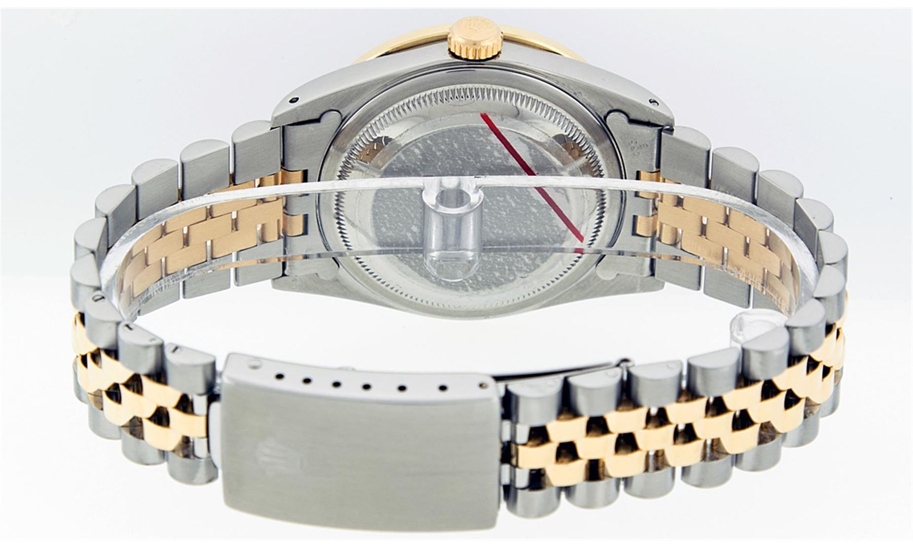 One Mens Two Tone Rolex Datejust Polished, Serviced & Electronically Tested, 14K Yellow Gold & Stainless Steel Case:36mm, 14K Yellow Gold Crown, Custom Bezel: 18K Yellow Gold Emerald Channel Set Diamond Bezel, Diamond Count: 52 Diamonds + 4 Emeralds, Total Weight 1.30 Carat, Clarity: SI-VS, Color: G to H. Custom Crystal: Synthetic Sapphire Cyclops Lens. Movement: Automatic Winding Movement Caliber 3035. Custom Dial: Black String Diamond Dial VVS, Diamond Count: 58 Diamonds in Dial G To H In Color, VVS Clarity. Date Window: 3 O'Clock Position Date Display, Quickset, Model: 16013 Condition: G-6 Extra Fine. Bracelet:Two Tone 14K Yellow Gold & Stainless Steel Jubilee. Bright Polish. 7.0 Inch Length, Adjustable. Standard Clasp, With Rolex Logo.