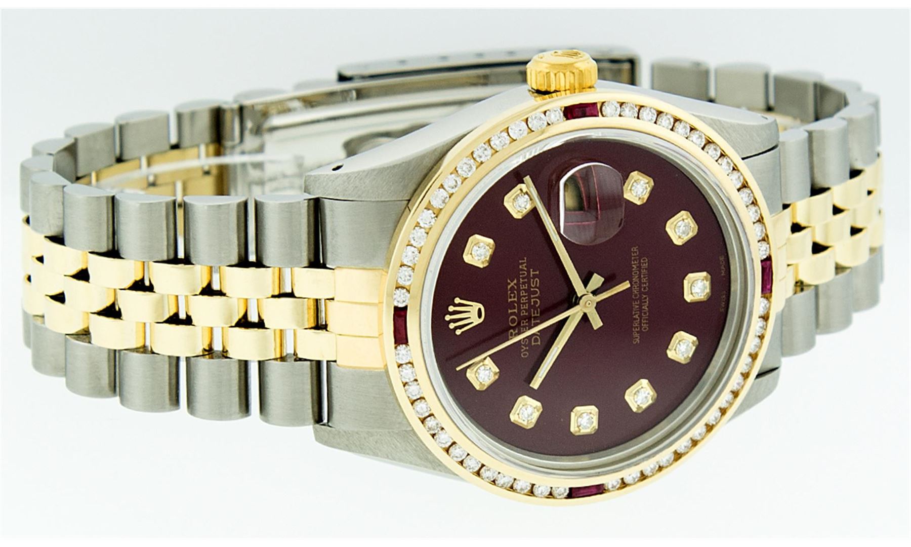 One Mens Two Tone Rolex Datejust Polished, Serviced & Electronically Tested, 14K Yellow Gold & Stainless Steel Case:36mm, 14K Yellow Gold Crown, Custom Bezel: 18K Yellow Gold Ruby Channel Set Diamond Bezel, Diamond Count: 52 Diamonds + 4 Rubies, Total Weight 1.30 Carat, Clarity: SI-VS, Color: G to H. Custom Crystal: Synthetic Sapphire Cyclops Lens. Movement: Automatic Winding Movement Caliber 3035. Custom Dial: Maroon Dial VVS, Diamond Count: 10 Single Cut Diamonds in Dial G To H In Color, VVS Clarity. Date Window: 3 O'Clock Position Date Display, Quickset, Model: 16013 Condition: G-6 Extra Fine. Bracelet:Two Tone 14K Yellow Gold & Stainless Steel Jubilee. Bright Polish. 7.0 Inch Length, Adjustable. Standard Clasp, With Rolex Logo.