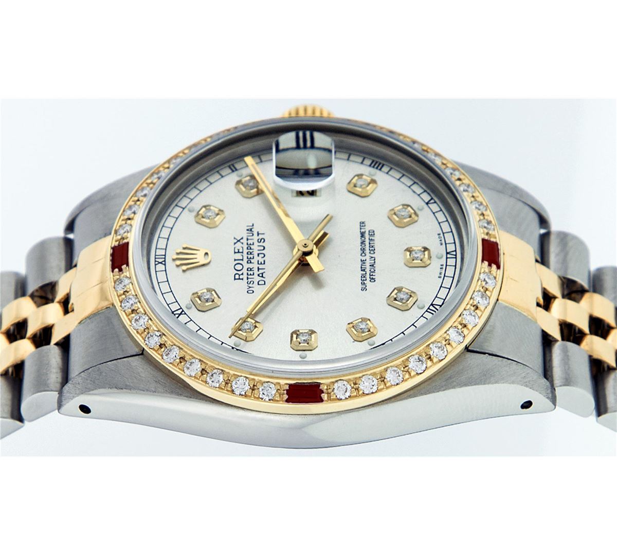 One Mens Two Tone Rolex Datejust Polished, Fully Serviced & Electronically Tested, 14K Yellow Gold & Stainless Steel Case:36mm, 14K Yellow Gold Crown, Custom Bezel: 18K Yellow Gold Ruby Beadset Diamond Bezel, Diamond Count: 36 Diamonds + 4 Rubies, Total Weight 1.0 Carat, Clarity: Si-VS, Color: G to H. Custom Crystal: Synthetic Sapphire Cyclops Lens. Movement: Automatic Winding Movement Caliber 3035. Custom Dial: Silver Diamond Dial With Square Roman Track and Luminescent Dots , Diamond Count: 10 Diamonds In Dial, Color: G to H, Clarity: SI-VS. Date Window: 3 O'Clock Position Date Display, Quickset, Model: Datejust Condition: G-6 Extra Fine. Bracelet: Two Tone 14K Yellow Gold & Stainless Steel Jubilee. Bright Polish. 7.0 Inch Length, Adjustable. Standard Clasp, With Rolex Logo.