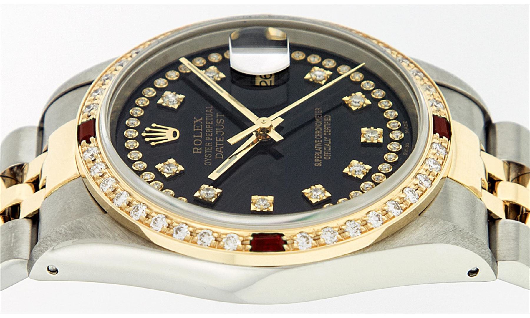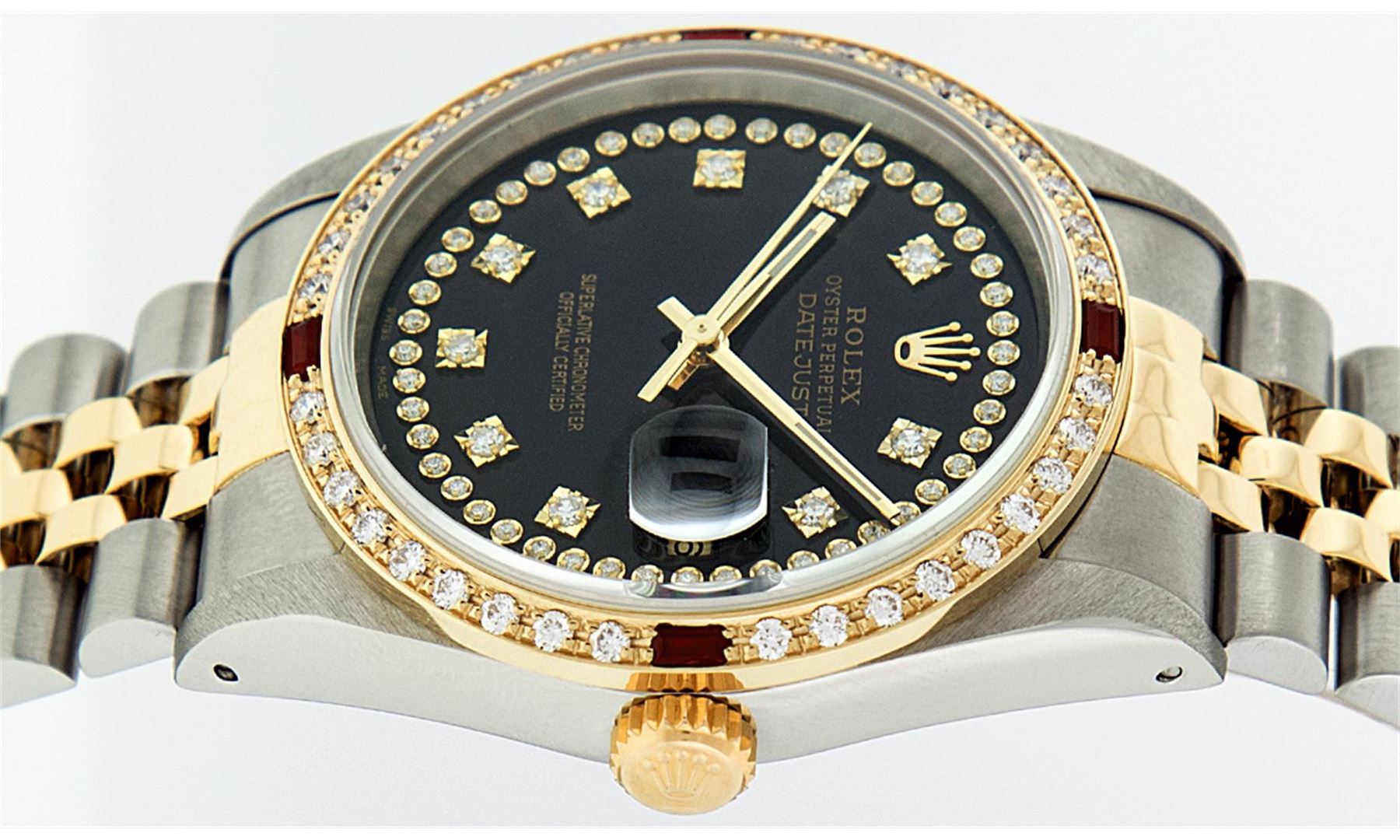 One Mens Two Tone Rolex Datejust Polished, Serviced & Electronically Tested, 14K Yellow Gold & Stainless Steel Case:36mm, 14K Yellow Gold Crown, Custom Bezel: 18K Yellow Gold Ruby Beadset Diamond Bezel, Diamond Count: 36 Diamonds + 4 Rubies, Total Weight 1.00 Carat, Clarity: SI-VS, Color: G to H. Custom Crystal: Synthetic Sapphire Cyclops Lens. Movement: Automatic Winding Movement Caliber 3035. Custom Dial: Black String Diamond Dial VVS , Diamond Count: 58 Diamonds in Dial G To H In Color, VVS Clarity. Date Window: 3 O'Clock Position Date Display, Quickset, Model: 16013 Condition: G-6 Extra Fine. Bracelet: Two Tone 14K Yellow Gold & Stainless Steel Jubilee. Bright Polish. 7.0 Inch Length, Adjustable. Standard Clasp, With Rolex Logo.