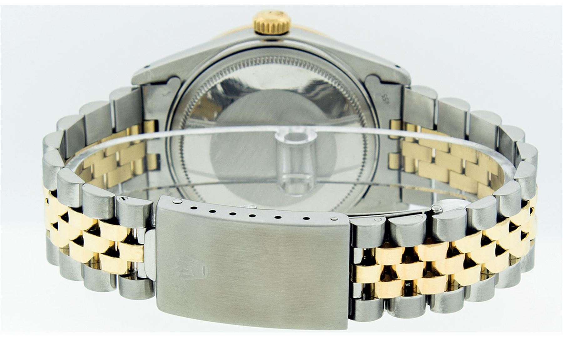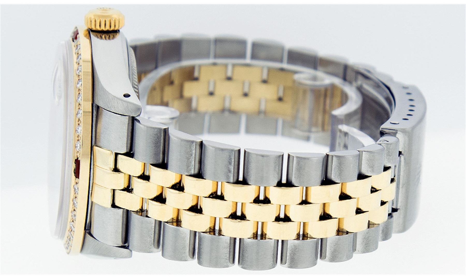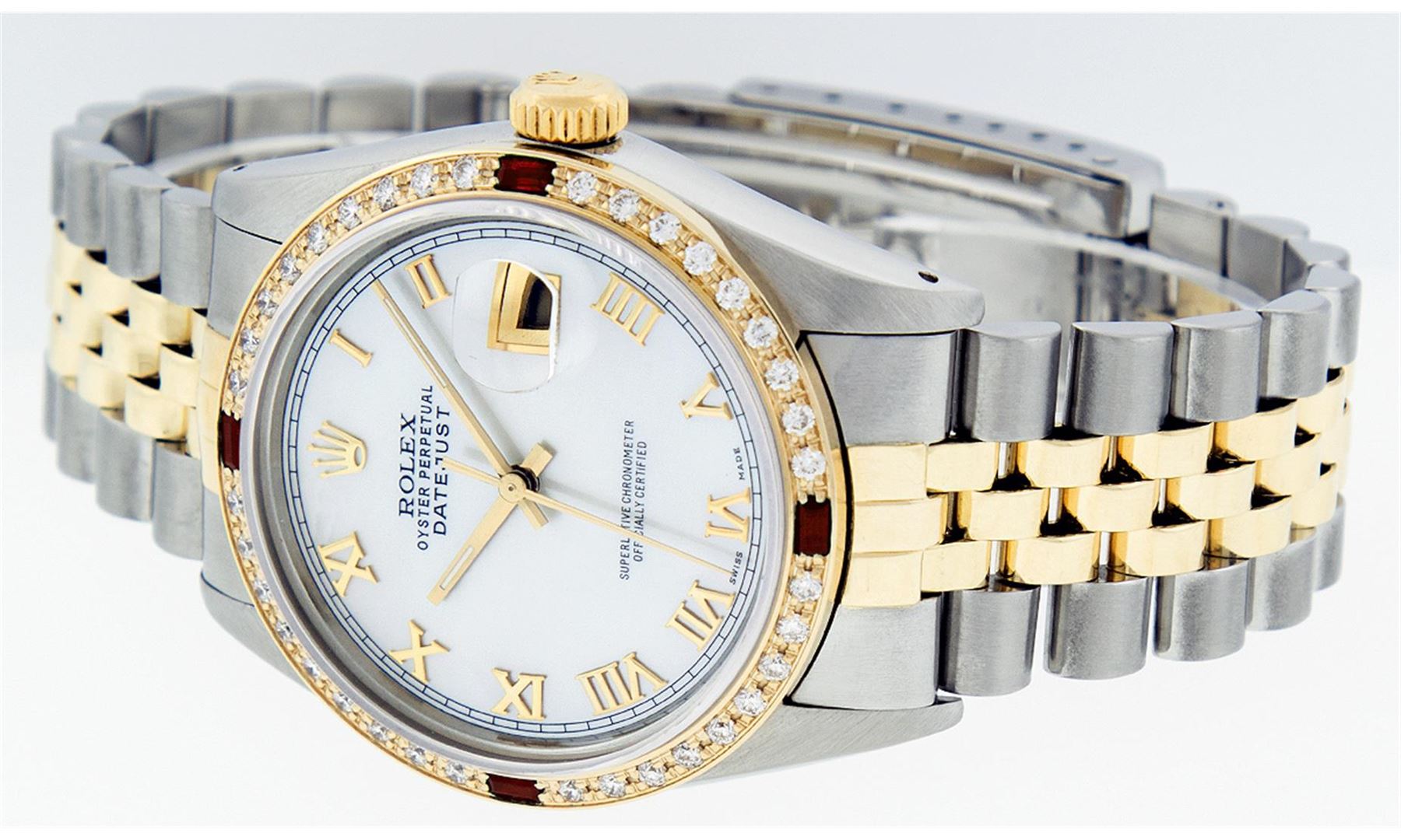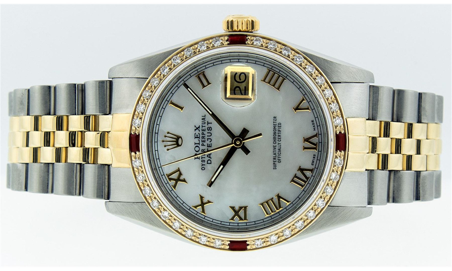 One Mens Two Tone Rolex Datejust Polished, Serviced & Electronically Tested, 14K Yellow Gold & Stainless Steel Case:36mm, 14K Yellow Gold Crown, Custom Bezel: 18K Yellow Gold Ruby Beadset Diamond Bezel, Diamond Count: 36 Diamonds + 4 Ruby, Total Weight 1.00 Carat, Clarity: SI-VS, Color: G to H. Custom Crystal: Synthetic Sapphire Cyclops Lens. Movement: Automatic Winding Movement Caliber 3035. Custom Dial: Mother Of Pearl Roman Dial. Date Window: 3 O'Clock Position Date Display, Quickset, Model: 16013 Condition: G-6 Extra Fine. Bracelet:Two Tone 14K Yellow Gold & Stainless Steel Jubilee. Bright Polish. 7.0 Inch Length, Adjustable. Standard Clasp, With Rolex Logo.