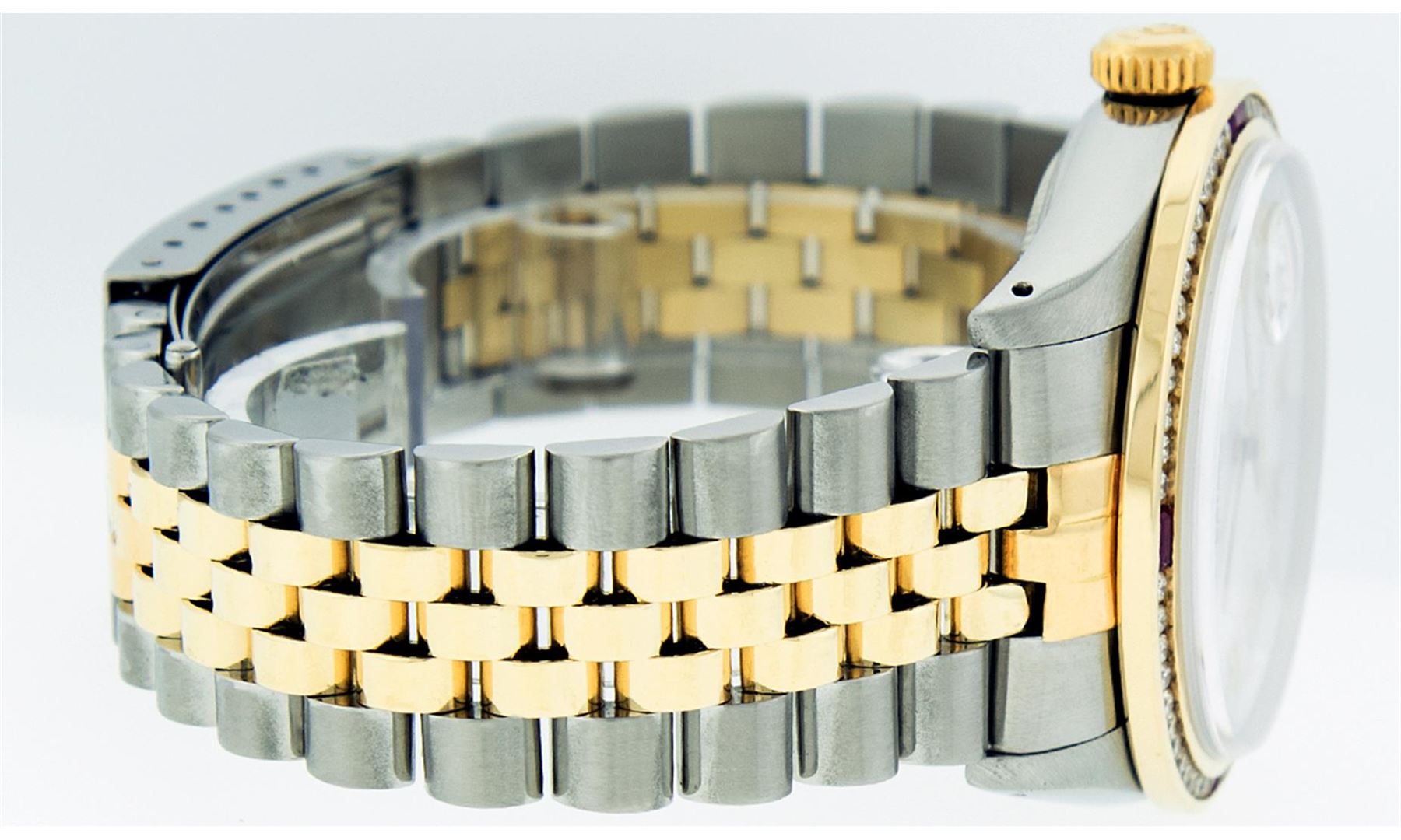 One Mens Two Tone Rolex Datejust Polished, Serviced & Electronically Tested, 14K Yellow Gold & Stainless Steel Case:36mm, 14K Yellow Gold Crown, Custom Bezel: 18K Yellow Gold Ruby Channel Set Diamond Bezel, Diamond Count: 52 Diamonds + 4 Rubies, Total Weight 1.30 Carat, Clarity: SI-VS, Color: G to H. Custom Crystal: Synthetic Sapphire Cyclops Lens. Movement: Automatic Winding Movement Caliber 3035. Custom Dial: Mother Of Pearl Roman Dial With Square Track. Date Window: 3 O'Clock Position Date Display, Quickset, Model: 16013 Condition: G-6 Extra Fine. Bracelet:Two Tone 14K Yellow Gold & Stainless Steel Jubilee. Bright Polish. 7.0 Inch Length, Adjustable. Standard Clasp, With Rolex Logo.