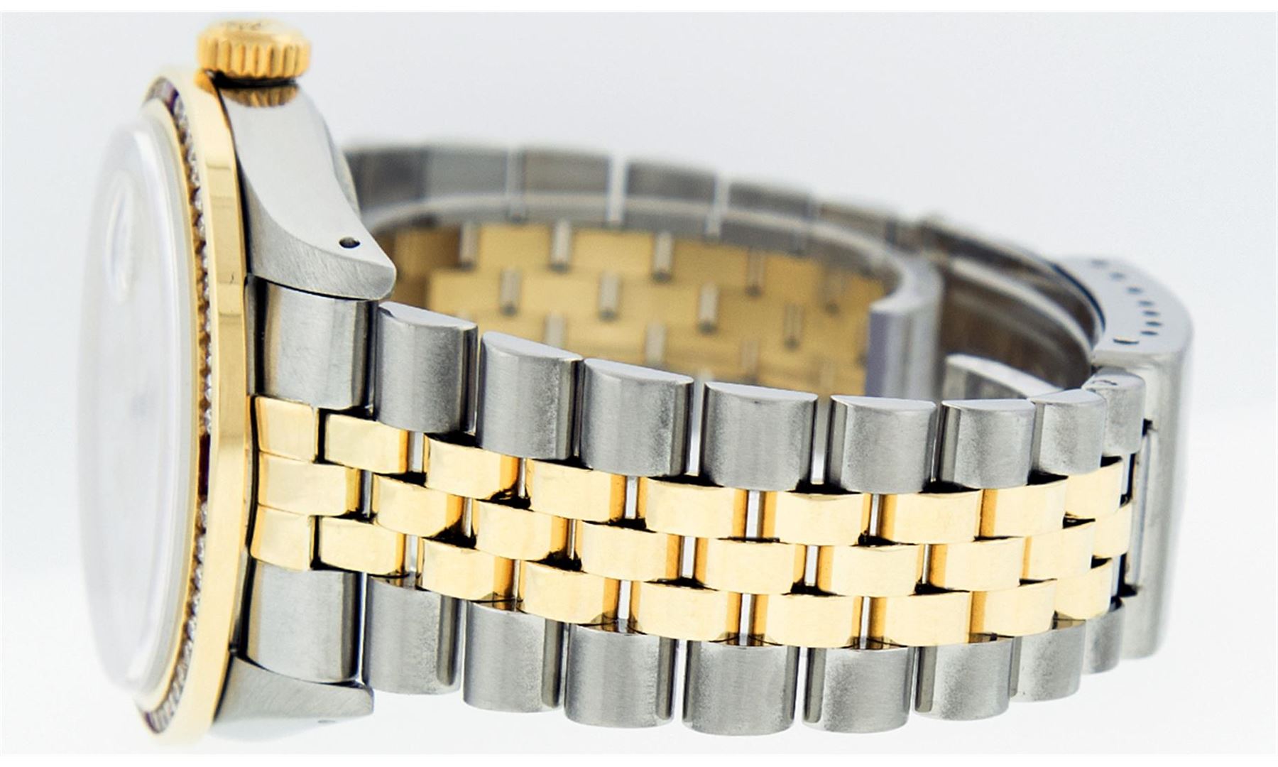 One Mens Two Tone Rolex Datejust Polished, Serviced & Electronically Tested, 14K Yellow Gold & Stainless Steel Case:36mm, 14K Yellow Gold Crown, Custom Bezel: 18K Yellow Gold Ruby Channel Set Diamond Bezel, Diamond Count: 52 Diamonds + 4 Rubies, Total Weight 1.30 Carat, Clarity: SI-VS, Color: G to H. Custom Crystal: Synthetic Sapphire Cyclops Lens. Movement: Automatic Winding Movement Caliber 3035. Custom Dial: Mother Of Pearl Roman Dial With Square Track. Date Window: 3 O'Clock Position Date Display, Quickset, Model: 16013 Condition: G-6 Extra Fine. Bracelet:Two Tone 14K Yellow Gold & Stainless Steel Jubilee. Bright Polish. 7.0 Inch Length, Adjustable. Standard Clasp, With Rolex Logo.