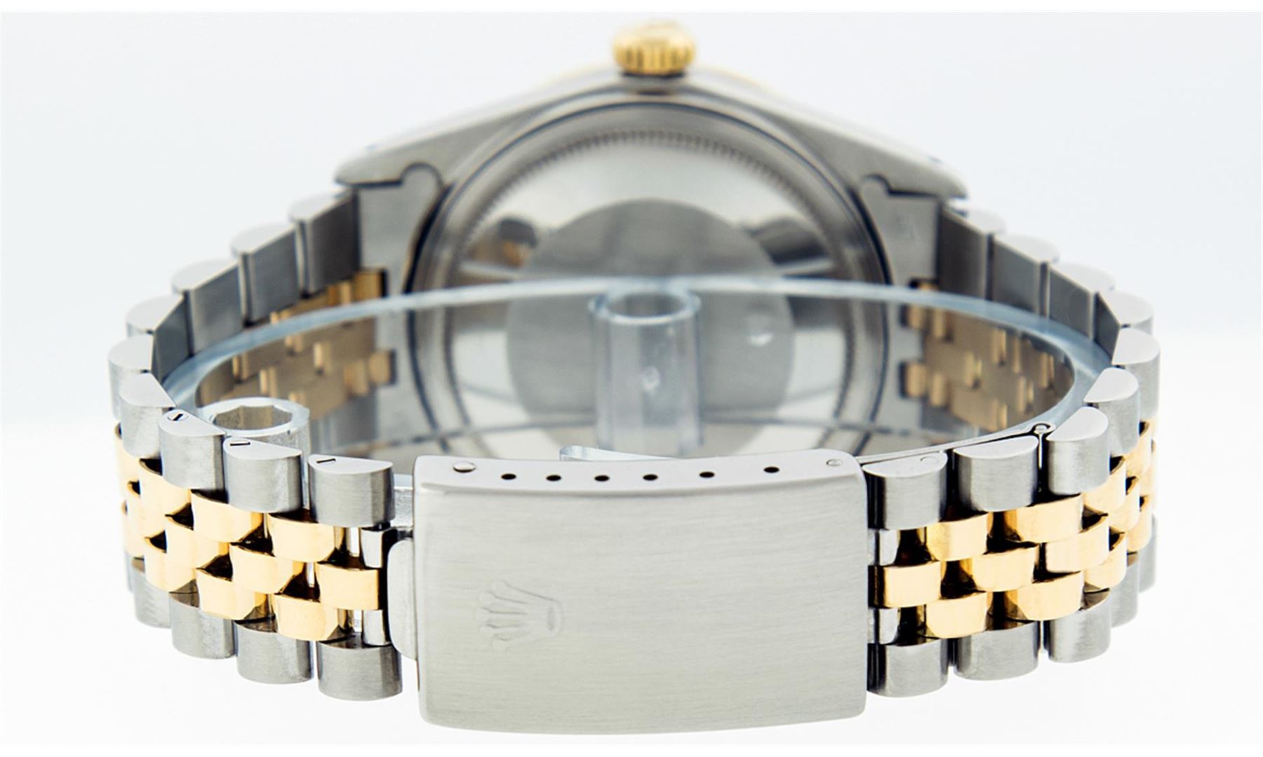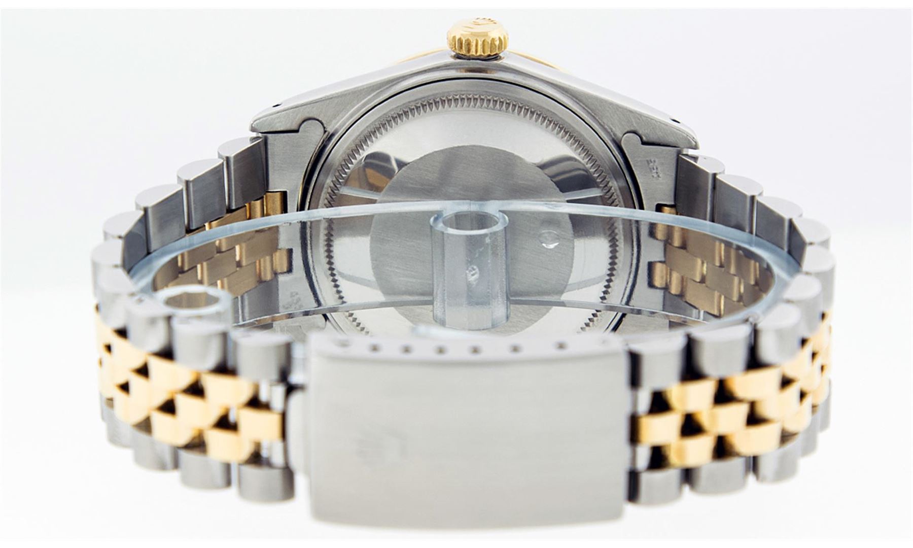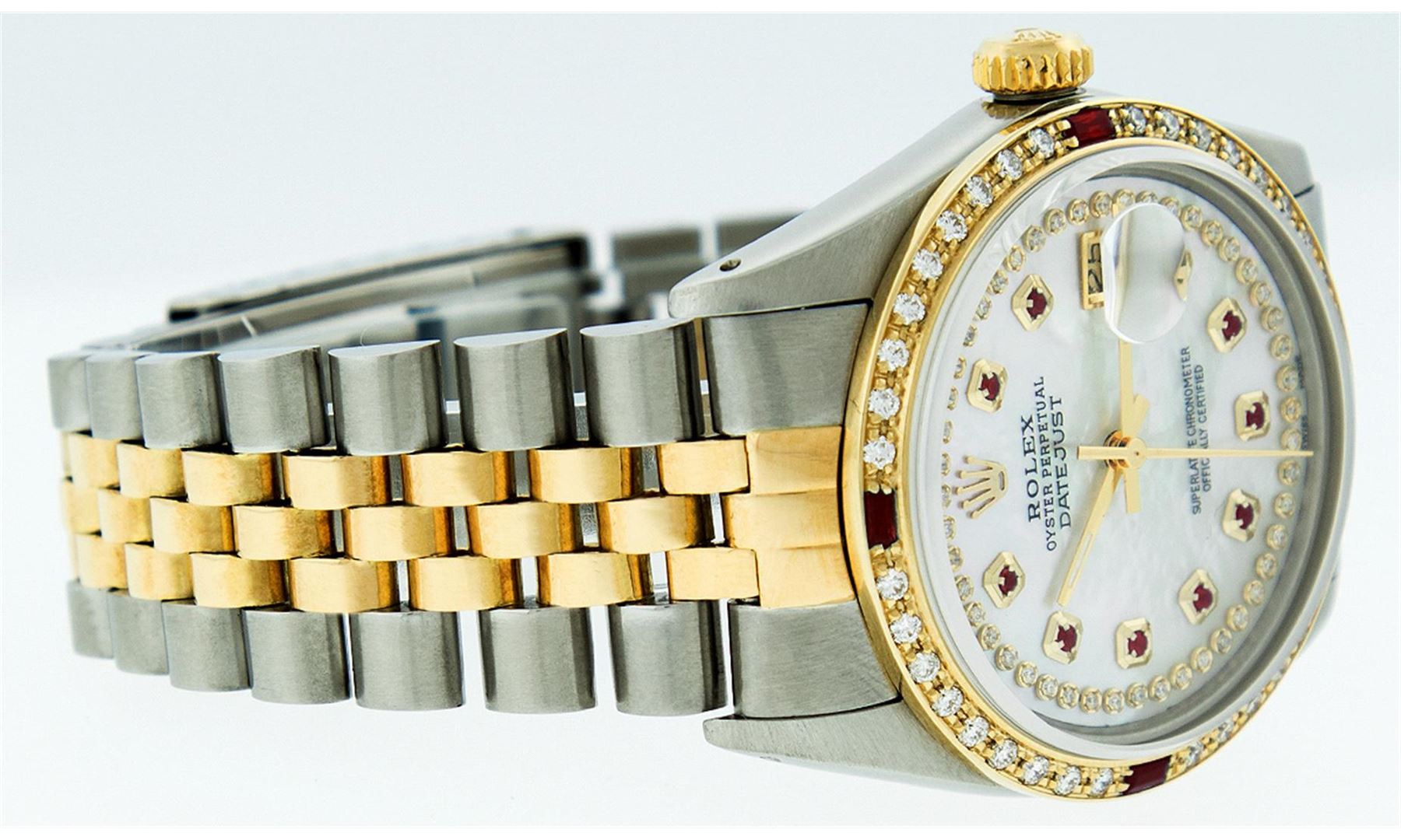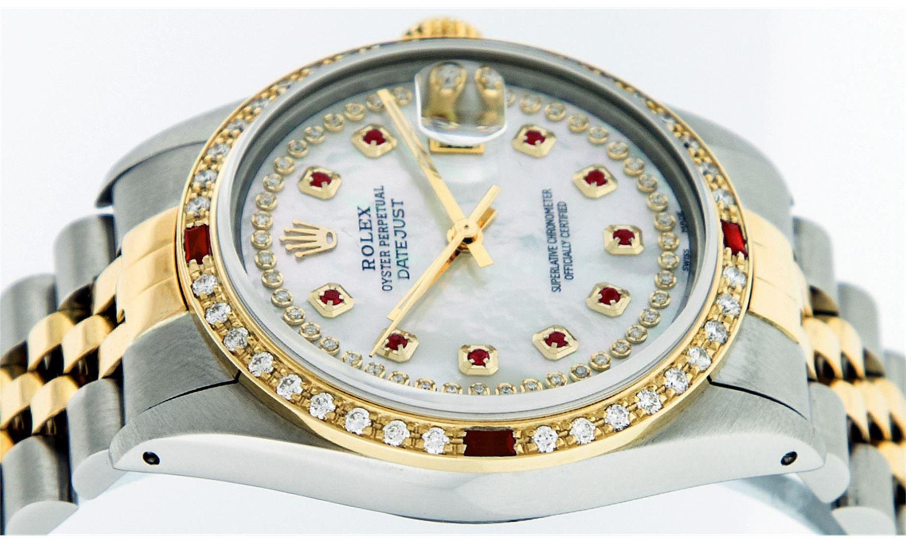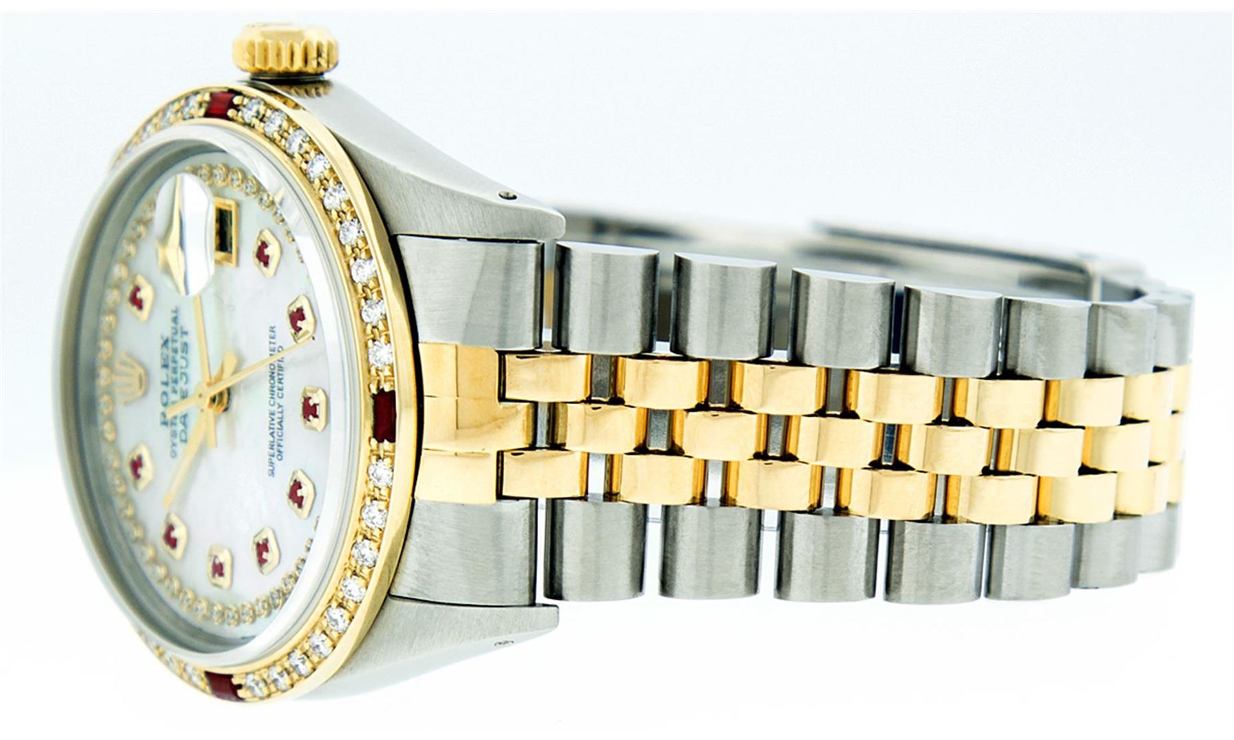 One Mens Two Tone Rolex Datejust Polished, Serviced & Electronically Tested, 14K Yellow Gold & Stainless Steel Case:36mm, 14K Yellow Gold Crown, Custom Bezel: 18K Yellow Gold Ruby Beadset Diamond Bezel, Diamond Count: 36 Diamonds + 4 Rubies Total Weight 1.00 Carat, Clarity: Si-VS, Color: G to H. Custom Crystal: Synthetic Sapphire Cyclops Lens. Movement: Automatic Winding Movement Caliber 3035. Custom Dial: Mother Of Pearl Ruby String Diamond Dial , Diamond + Gem Count: 10 Ruby + 48 Diamonds in Dial G To H In Color, SI-VS Clarity. Date Window: 3 O'Clock Position Date Display, Quickset, Model: 16013 Condition: G-6 Extra Fine. Bracelet:Two Tone 14K Yellow Gold & Stainless Steel Jubilee. Bright Polish. 7.0 Inch Length, Adjustable. Standard Clasp, With Rolex Logo.