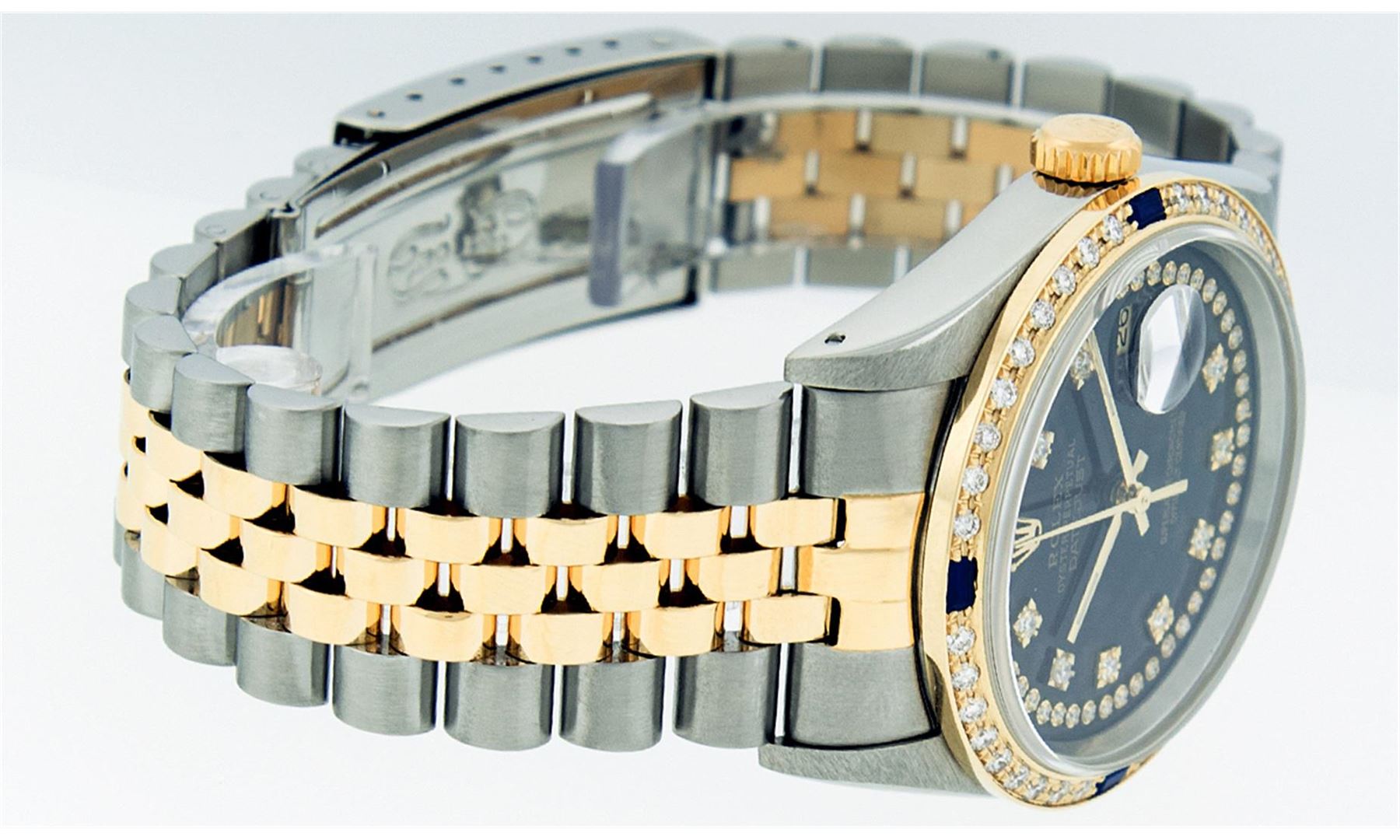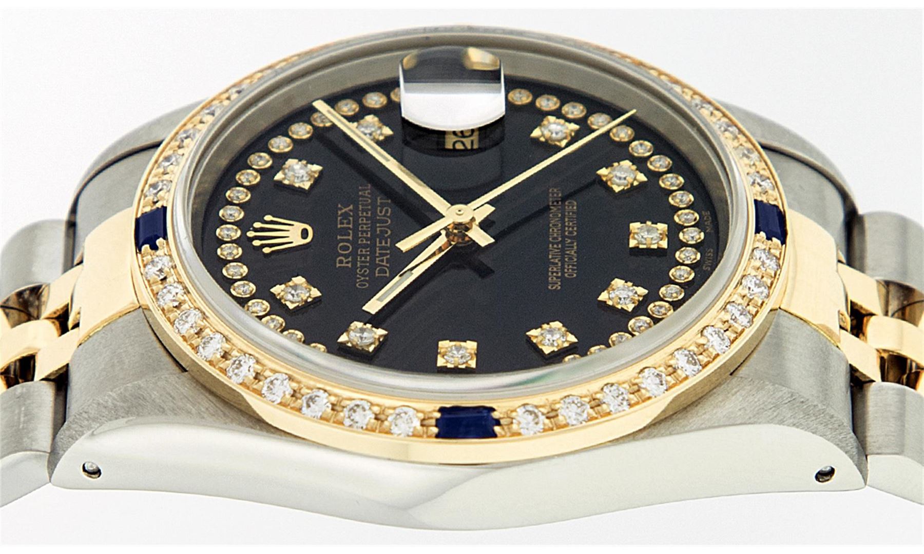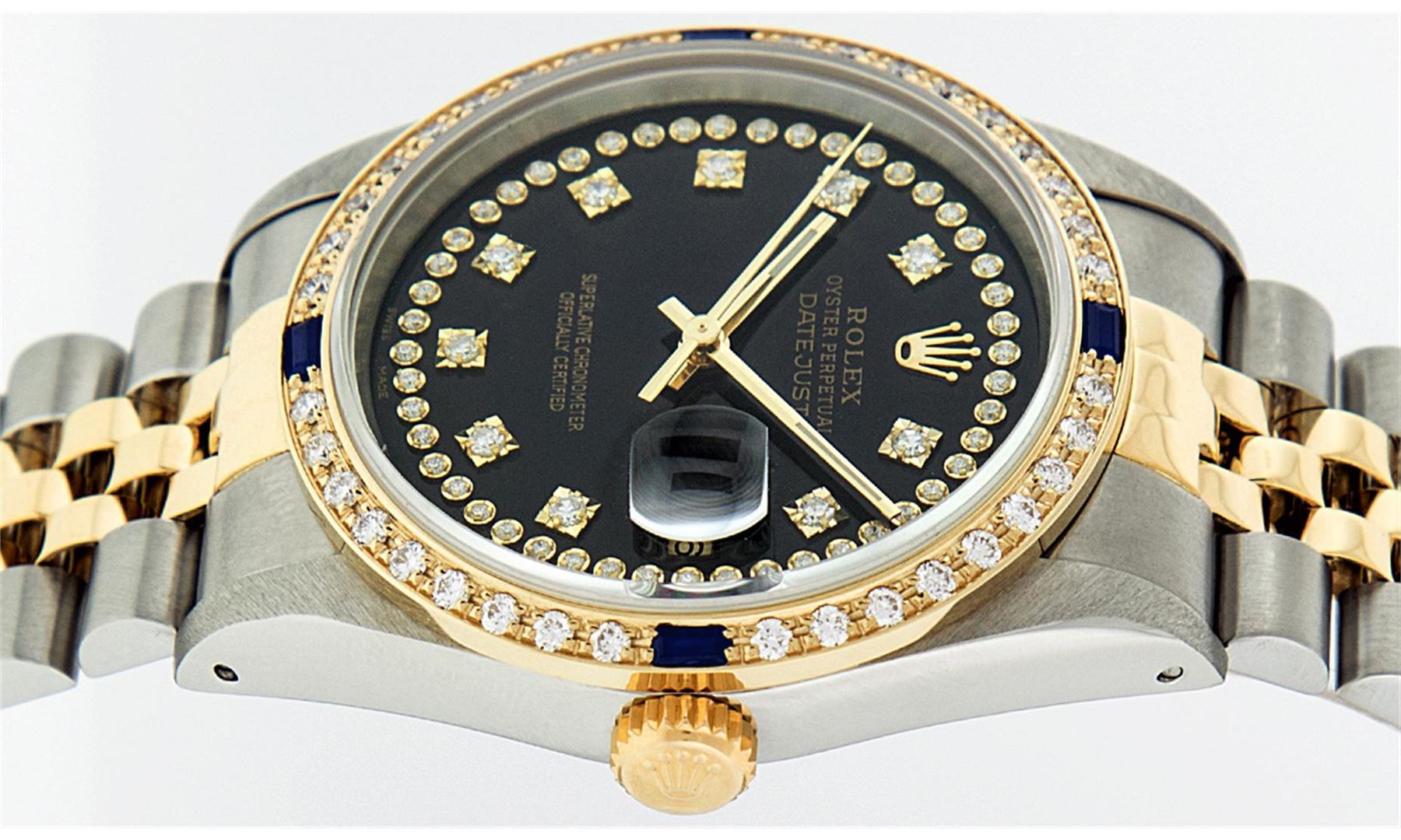 One Mens Two Tone Rolex Datejust Polished, Serviced & Electronically Tested, 14K Yellow Gold & Stainless Steel Case:36mm, 14K Yellow Gold Crown, Custom Bezel: 18K Yellow Gold Sapphire Beadset Diamond Bezel, Diamond Count: 36 Diamonds + 4 Sapphires, Total Weight 1.00 Carat, Clarity: SI-VS, Color: G to H. Custom Crystal: Synthetic Sapphire Cyclops Lens. Movement: Automatic Winding Movement Caliber 3035. Custom Dial: Black String Diamond Dial VVS , Diamond Count: 58 Diamonds in Dial G To H In Color, VVS Clarity. Date Window: 3 O'Clock Position Date Display, Quickset, Model: 16013 Condition: G-6 Extra Fine. Bracelet: Two Tone 14K Yellow Gold & Stainless Steel Jubilee. Bright Polish. 7.0 Inch Length, Adjustable. Standard Clasp, With Rolex Logo.
