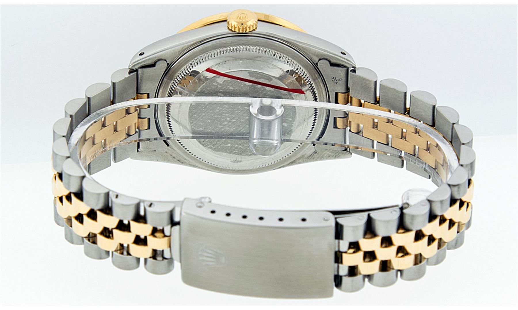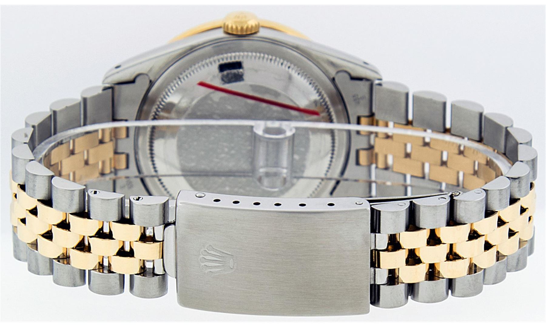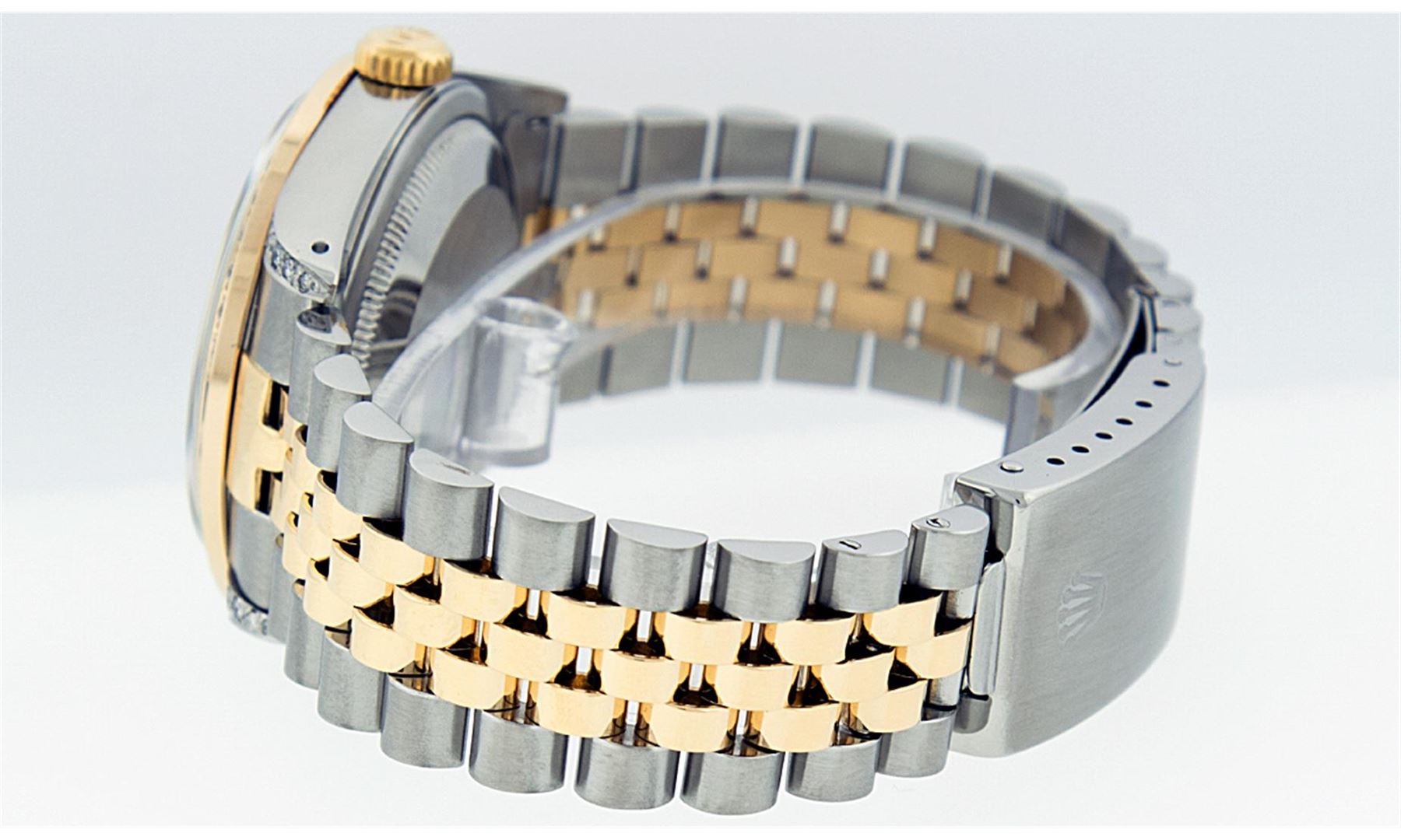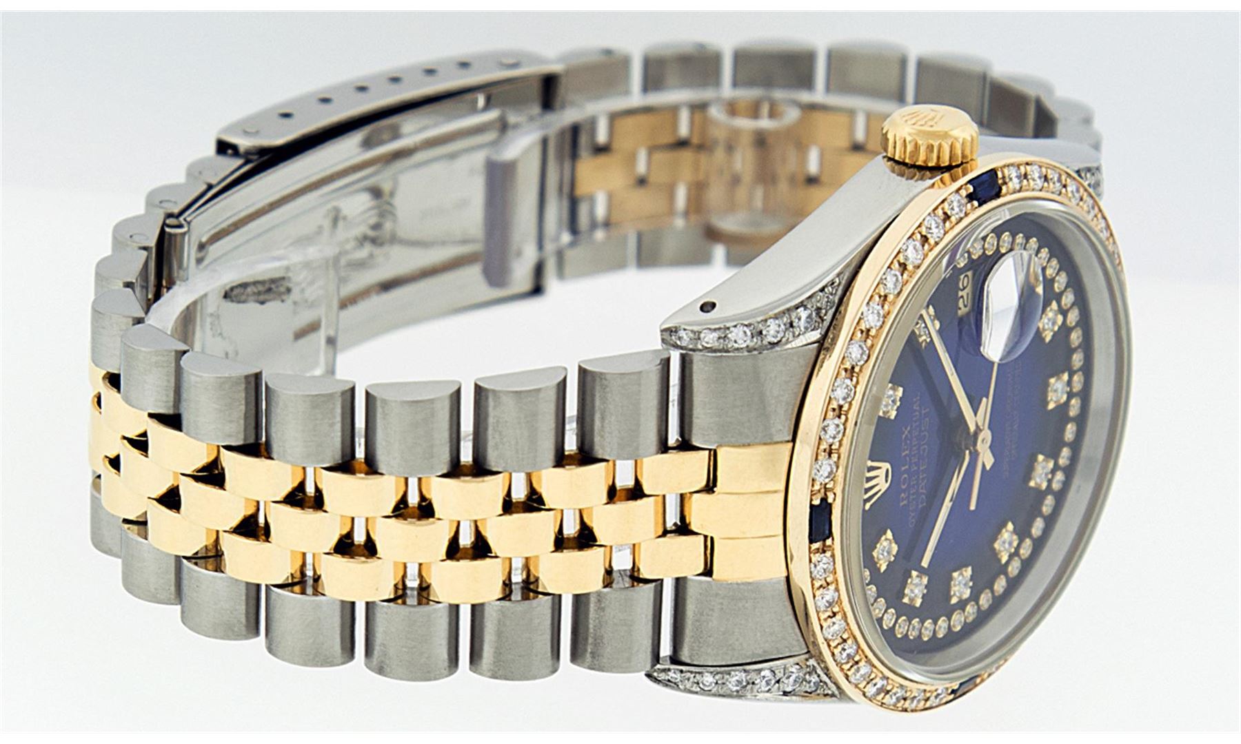 One Mens Two Tone Rolex Datejust Polished, Serviced & Electronically Tested,14K Yellow Gold And Stainless Steel Case:36mm, Diamond Lugs: Diamond Count: 24 Diamonds In Lugs, Diamond Weight: .35 Carat. Clarity SI-VS, Color: G to H. 14K Yellow Gold Crown, Custom Bezel: 18K Yellow Gold Sapphire Beadset Diamond Bezel. Diamond Count: 36 Diamonds + 4 Sapphires. Total Weight 1.0 Carat, Clarity: SI-VS, Color: G to H. Custom Crystal: Synthetic Sapphire Cyclops Lens. Movement: Automatic Winding Movement Caliber 3035. Custom Dial: Blue Vignette String Diamond Dial VVS, Diamond Count: 58 Diamonds In Dial, Clarity: SI-VS, Color: VVS. Date Window: 3 O'Clock Position Date Display, Quickset, Model: 16013 Condition: G-6 Extra Fine. Bracelet: 14K Yellow Gold And Stainless Steel Jubilee. Bright Polish & Satin Finish. 7.0 Inch Length, Adjustable. Standard Clasp, With Rolex Logo.