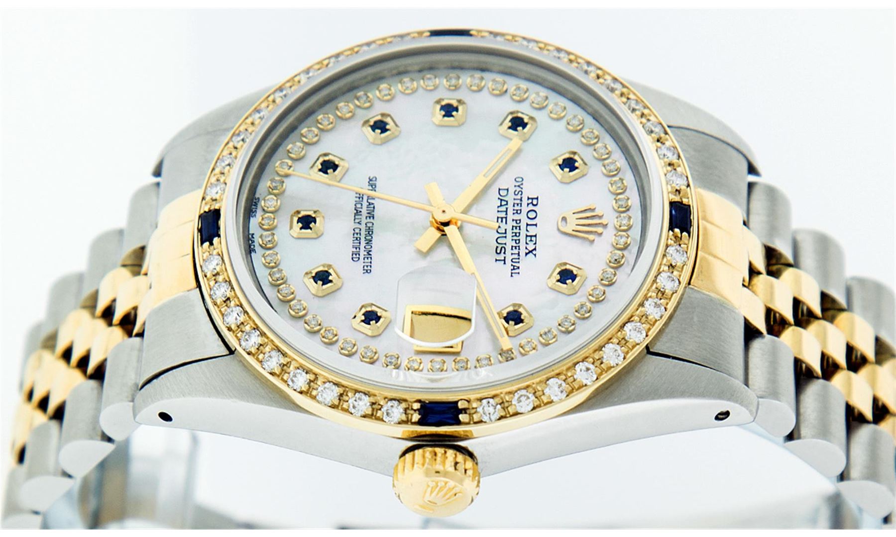 One Mens Two Tone Rolex Datejust Polished, Serviced & Electronically Tested, 14K Yellow Gold & Stainless Steel Case:36mm, 14K Yellow Gold Crown, Custom Bezel: 18K Yellow Gold Sapphire Beadset Diamond Bezel, Diamond Count: 36 Diamonds + 4 Sapphires Total Weight 1.00 Carat, Clarity: Si-VS, Color: G to H. Custom Crystal: Synthetic Sapphire Cyclops Lens. Movement: Automatic Winding Movement Caliber 3035. Custom Dial: Mother Of Pearl Sapphire String Diamond Dial , Diamond + Gem Count: 10 Sapphires + 48 Diamonds in Dial G To H In Color, SI-VS Clarity. Date Window: 3 O'Clock Position Date Display, Quickset, Model: 16013 Condition: G-6 Extra Fine. Bracelet:Two Tone 14K Yellow Gold & Stainless Steel Jubilee. Bright Polish. 7.0 Inch Length, Adjustable. Standard Clasp, With Rolex Logo.
