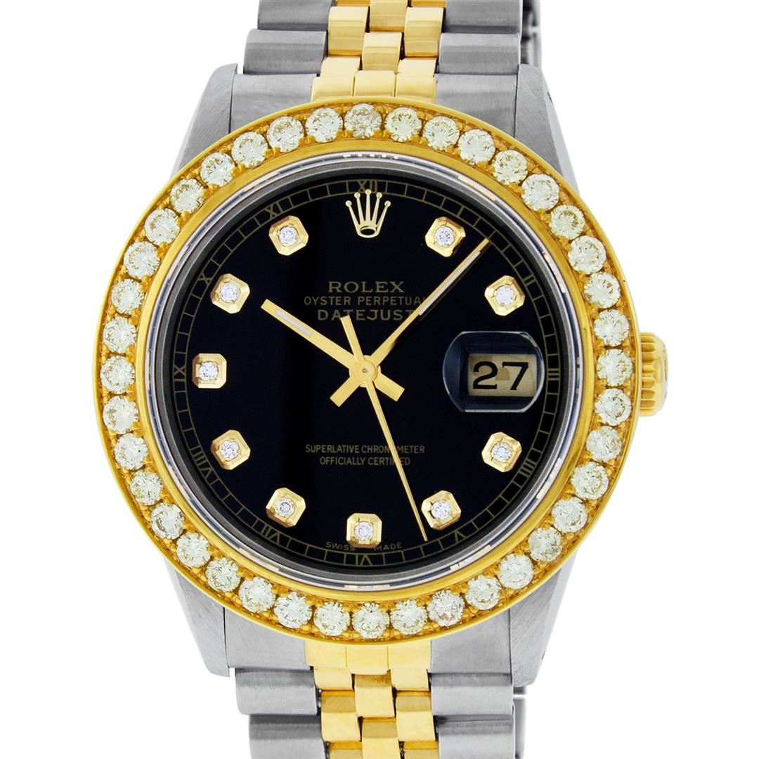 One Men's 14K Yellow Gold Two Tone Rolex Datejust Polished Bright with Satin Finish, Serviced & Electronically Tested, 14K Yellow Gold And Stainless Steel Case: 36mm, Yellow Gold Crown, Custom Bezel: New 18K Yellow Gold Beadset Diamond Bezel, Diamond Count: 40 Diamonds On Bezel, Total Weight 2.5 Carat, Clarity: SI-VS, Color: G to H. Custom Crystal: New Scratch Resistant Synthetic Sapphire Cyclops Lens. Custom Hands: New Luminescent Hands. Movement: Automatic Winding Movement Caliber 3035. Custom Dial: Black Diamond Dial With Roman Track, Diamond Count: 10 Diamonds On Dial, Dial Color: G To H In Color, Clarity: VS2-SI1. Date Window: 3 O'Clock Position Date Display, Quickset, Model: Datejust. Condition: G-6 Extra Fine. Bracelet: 14K Yellow Gold And Stainless Steel Jubilee Band. Bright Polish & Satin Finish. 7.0 Inch Length, Adjustable. Standard Clasp, With Rolex Logo. This Watch Has Been Serviced and Polished And It Is Free Of All Dents And Scratches And Has Been Time Tested.