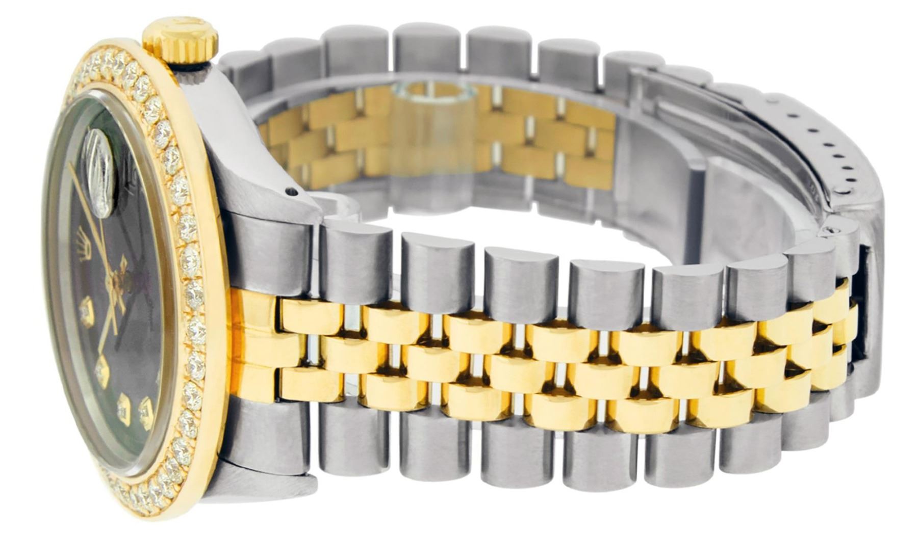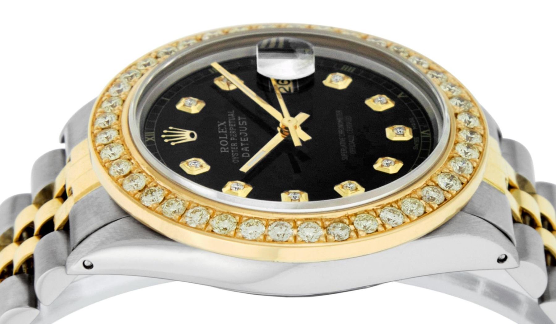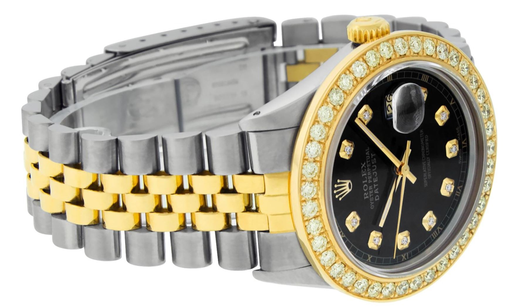 One Mens Pre Owned Two Tone Yellow Gold And Stainless Steel Rolex Datejust Polished Bright with Satin Finish, Serviced And Electronically Tested, Rolex Yellow Gold And Stainless Steel Case: 36mm, Rolex Yellow Gold Crown, Custom Bezel: New 18K Yellow Gold Beadset Diamond Bezel, Diamond Count: 40 Diamonds On Bezel, Total Weight 2.0 Carat. Custom Crystal: New Sapphire With Date Window. Custom Hands: New Luminescent Hands. Rolex Movement: Automatic Winding Movement 3035. Custom Dial: Custom Black Dial With Added Diamonds, Diamond Count: 10 Diamonds On Dial. Date Window: 3 O'Clock Position Date Display, Quickset, Model: Datejust. Condition: G-6 Extra Fine. Rolex Bracelet: Yellow Gold And Stainless Steel Jubilee Band. Bright Polish And Satin Finish. 7.0 Inch Length, Adjustable. Standard Clasp, With Rolex Logo. This Watch Has Been Serviced and Polished And It Is Free Of All Dents And Scratches And Has Been Time Tested.