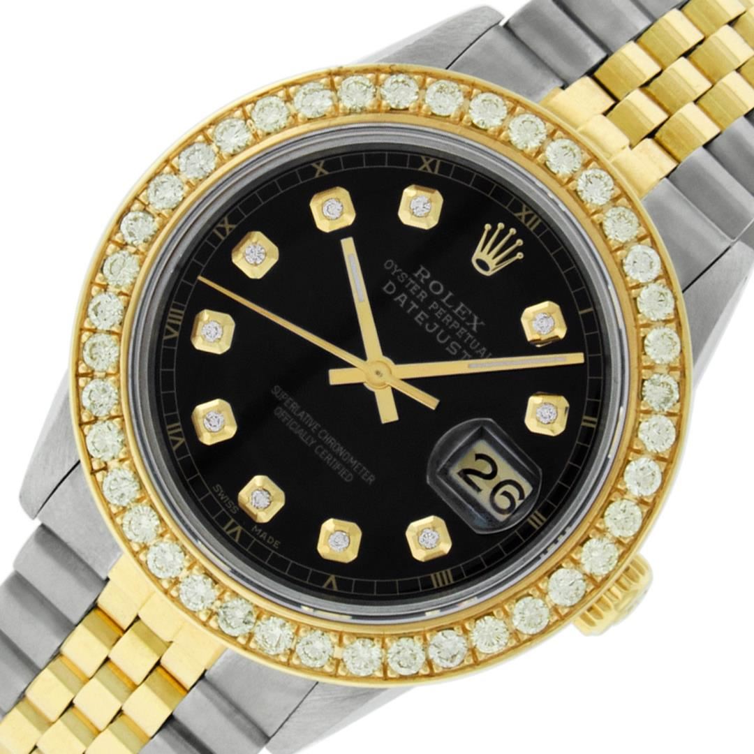 One Mens Pre Owned Two Tone Yellow Gold And Stainless Steel Rolex Datejust Polished Bright with Satin Finish, Serviced And Electronically Tested, Rolex Yellow Gold And Stainless Steel Case: 36mm, Rolex Yellow Gold Crown, Custom Bezel: New 18K Yellow Gold Beadset Diamond Bezel, Diamond Count: 40 Diamonds On Bezel, Total Weight 2.0 Carat. Custom Crystal: New Sapphire With Date Window. Custom Hands: New Luminescent Hands. Rolex Movement: Automatic Winding Movement 3035. Custom Dial: Custom Black Dial With Added Diamonds, Diamond Count: 10 Diamonds On Dial. Date Window: 3 O'Clock Position Date Display, Quickset, Model: Datejust. Condition: G-6 Extra Fine. Rolex Bracelet: Yellow Gold And Stainless Steel Jubilee Band. Bright Polish And Satin Finish. 7.0 Inch Length, Adjustable. Standard Clasp, With Rolex Logo. This Watch Has Been Serviced and Polished And It Is Free Of All Dents And Scratches And Has Been Time Tested.