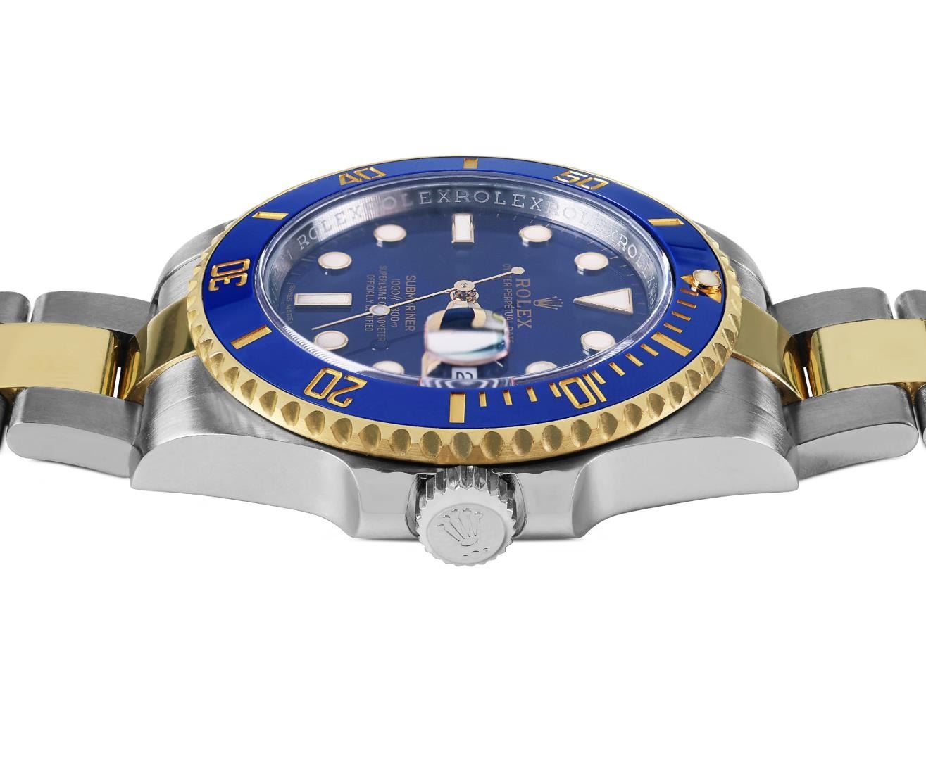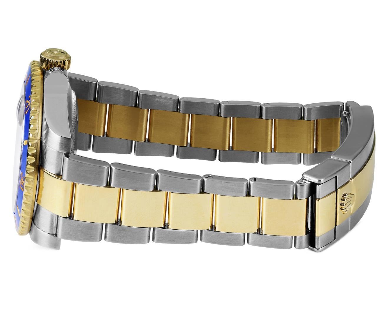 One Mens Pre Owned Two Tone 18K Yellow Gold And Stainless Steel Rolex Submariner With Date Polished, Serviced And Electronically Tested, Rolex Stainless Steel Case: 40mm, Rolex 18K Yellow Gold Crown, Rolex Bezel: 18K Yellow Gold Rotatable Bezel With Ceramic Blue Insert. Crystal: Sapphire With Magnified Date Window. Rolex Movement: Automatic Winding Movement Caliber 3135. Rolex Dial: Blue Submariner Dial with Luminous Index Hour Markers And Dash Track. Date Window: 3 O'Clock Position Date Display, Model: Ceramic Date Submariner, Quickset, Condition: G-6 Extra Fine. Rolex Bracelet: 18K Yellow Gold and Stainless Steel Oyster Band. Bright Polish & Satin Finish. 7.0 Inch Length, Adjustable. Standard Clasp, With Rolex Logo. This Watch Comes With A Rolex Box And Card.