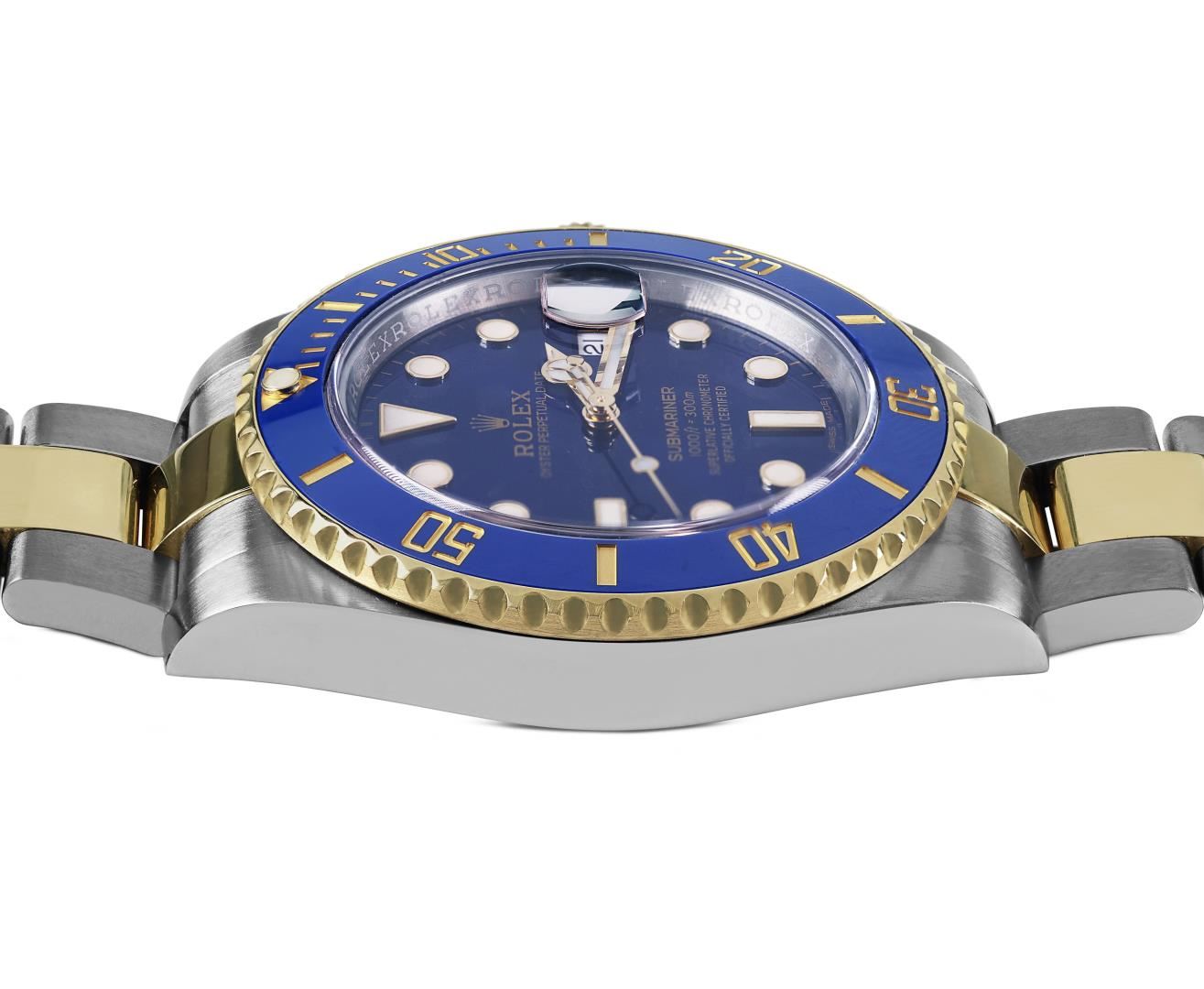 One Mens Pre Owned Two Tone 18K Yellow Gold And Stainless Steel Rolex Submariner With Date Polished, Serviced And Electronically Tested, Rolex Stainless Steel Case: 40mm, Rolex 18K Yellow Gold Crown, Rolex Bezel: 18K Yellow Gold Rotatable Bezel With Ceramic Blue Insert. Crystal: Sapphire With Magnified Date Window. Rolex Movement: Automatic Winding Movement Caliber 3135. Rolex Dial: Blue Submariner Dial with Luminous Index Hour Markers And Dash Track. Date Window: 3 O'Clock Position Date Display, Model: Ceramic Date Submariner, Quickset, Condition: G-6 Extra Fine. Rolex Bracelet: 18K Yellow Gold and Stainless Steel Oyster Band. Bright Polish & Satin Finish. 7.0 Inch Length, Adjustable. Standard Clasp, With Rolex Logo. This Watch Comes With A Rolex Box And Card.