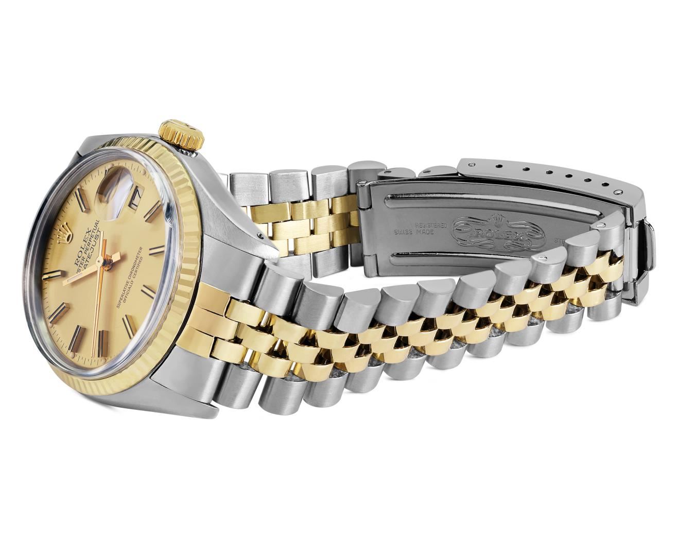 One Mens Pre Owned Yellow Gold Two Tone Rolex Datejust Polished, Serviced And Electronically Tested, Rolex Yellow Gold And Stainless Steel Case: 36mm, Rolex Yellow Gold Crown, Rolex Bezel: Yellow Gold Fluted Bezel. Custom Crystal: New Plastic With Magnified Date Window. Hands: Luminescent Hands. Rolex Movement: Automatic Winding Movement 3035. Rolex Dial: Champagne Dial With Index Hour Markers and Dash Track With Lumi Dots. Date Window: 3 O'Clock Position Date Display, Quickset, Model: Quickset Datejust. Condition: G-6 Extra Fine. Rolex Bracelet: Two Tone Yellow Gold And Stainless Steel Jubilee Band. Bright Polish. 7.0 Inch Length, Adjustable. Standard Clasp, With Rolex Logo. This Watch Has Been Serviced Time Tested And Is In Excellent Condition It Is Free Of All Scratches And Dents. This Watch Comes With A Rolex Box.