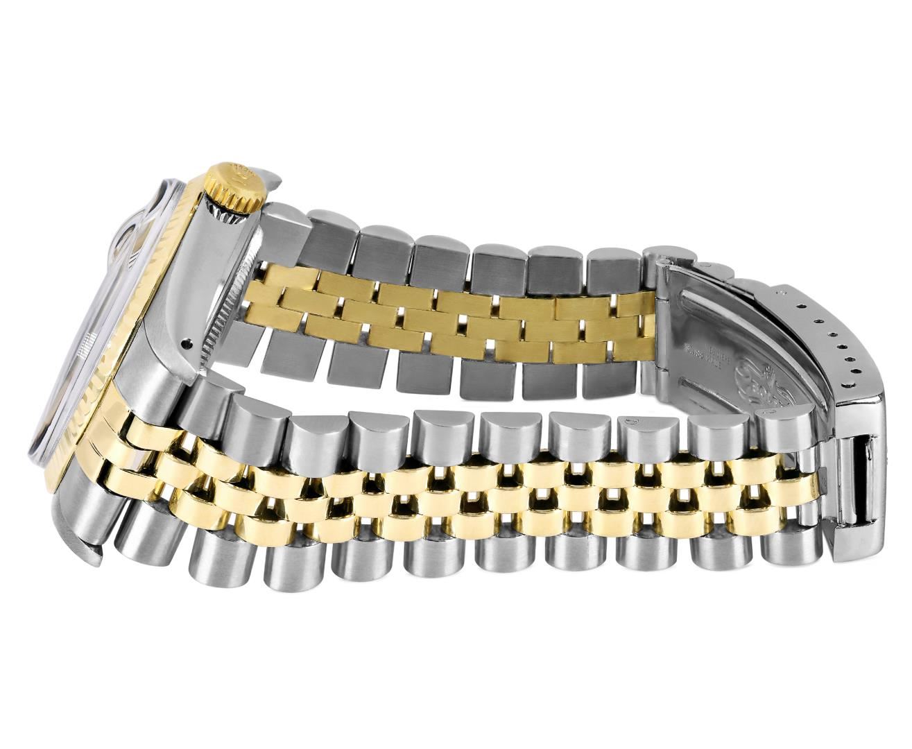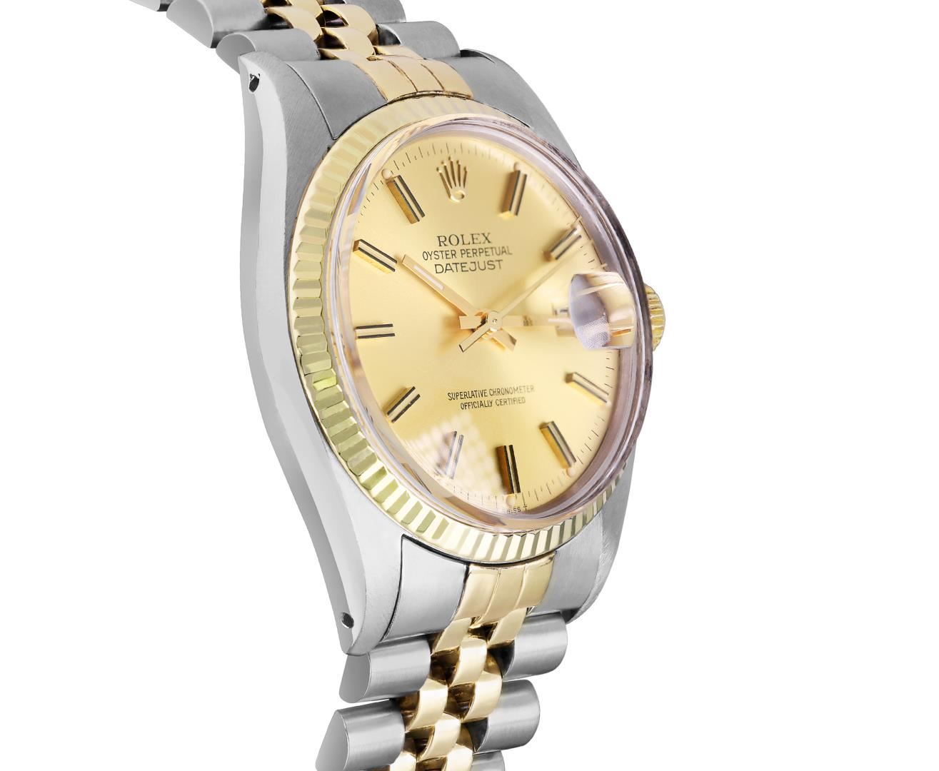 One Mens Pre Owned Yellow Gold Two Tone Rolex Datejust Polished, Serviced And Electronically Tested, Rolex Yellow Gold And Stainless Steel Case: 36mm, Rolex Yellow Gold Crown, Rolex Bezel: Yellow Gold Fluted Bezel. Custom Crystal: New Plastic With Magnified Date Window. Hands: Luminescent Hands. Rolex Movement: Automatic Winding Movement 3035. Rolex Dial: Champagne Dial With Index Hour Markers and Dash Track With Lumi Dots. Date Window: 3 O'Clock Position Date Display, Quickset, Model: Quickset Datejust. Condition: G-6 Extra Fine. Rolex Bracelet: Two Tone Yellow Gold And Stainless Steel Jubilee Band. Bright Polish. 7.0 Inch Length, Adjustable. Standard Clasp, With Rolex Logo. This Watch Has Been Serviced Time Tested And Is In Excellent Condition It Is Free Of All Scratches And Dents. This Watch Comes With A Rolex Box.