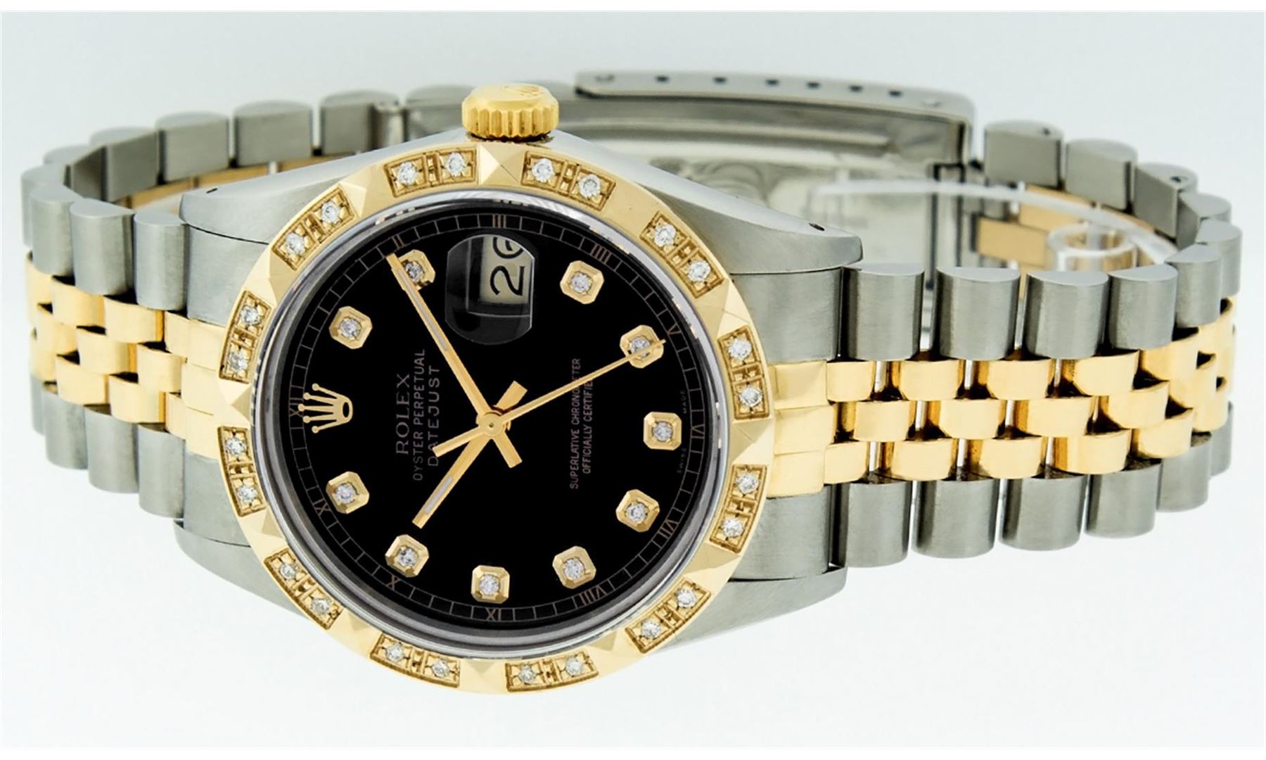 One Gents 18K Yellow Gold Two Tone Rolex Datejust Polished, Serviced & Electronically Tested, 18K Yellow Gold & Stainless Steel Case:36mm, 18K Yellow Gold Crown, Custom Bezel: 18K Yellow Pyramid Diamond Bezel, Diamond Count: 24 Diamonds In Dial. Clarity: Si-VS, Color: G to H. Custom Crystal: Synthetic Sapphire Cyclops Lens. Movement: Automatic Winding Movement Caliber 3035. Custom Dial: Black Diamond Dial With Square Roman Track, Diamond Count: 10 Diamonds In Dial, Color: G To H, Clarity: SI-VS, Date Window: 3 O'Clock Position Date Display, Quickset, Model: 16013, Condition: G-6 Extra Fine The Watch Is In Very Good Condition Free Of All Scratches And Dents. Bracelet:Two Tone Yellow Gold & Stainless Steel Jubilee Band. Bright Polish. 7.0 Inch Length, Adjustable. Standard Clasp, With Rolex Logo.