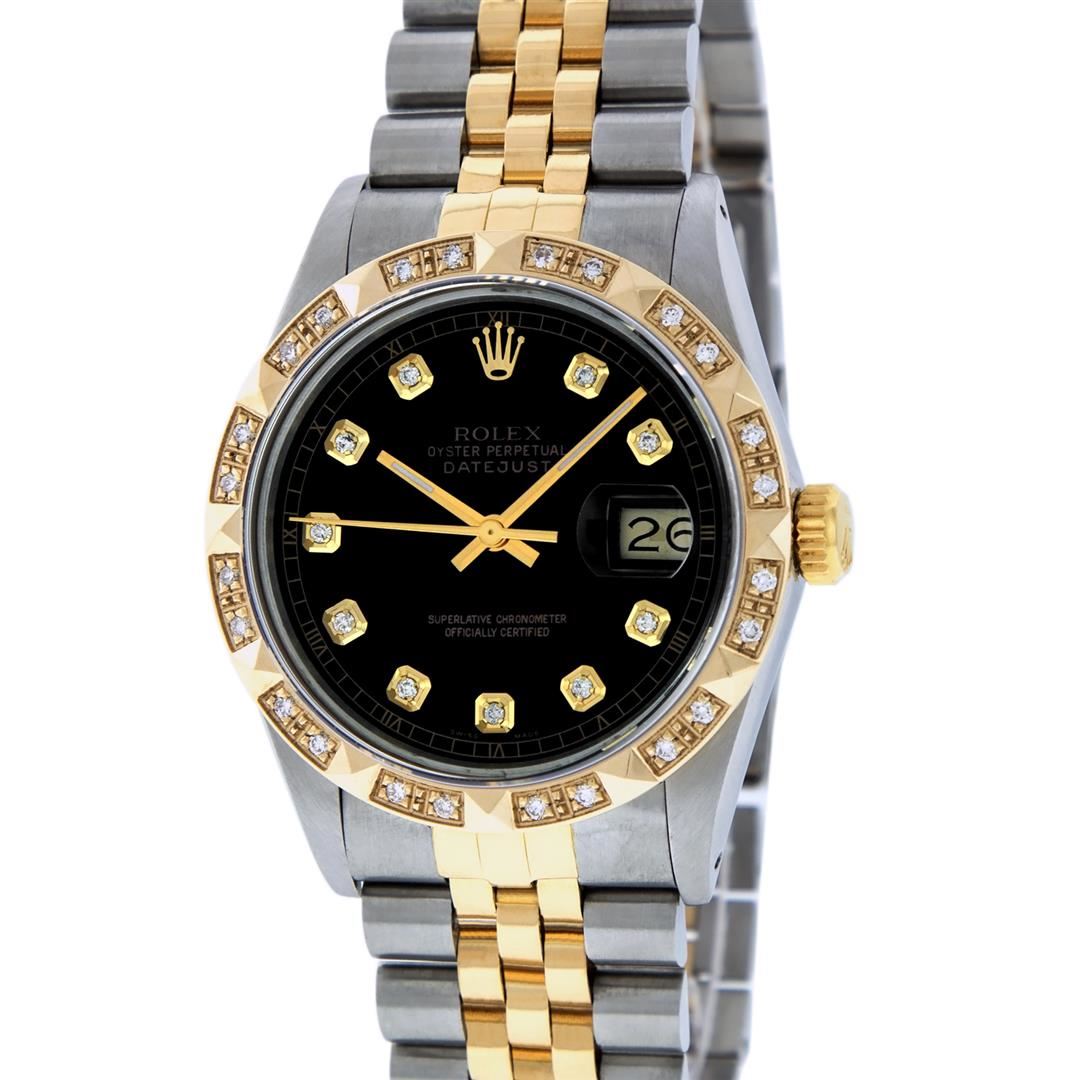 One Gents 18K Yellow Gold Two Tone Rolex Datejust Polished, Serviced & Electronically Tested, 18K Yellow Gold & Stainless Steel Case:36mm, 18K Yellow Gold Crown, Custom Bezel: 18K Yellow Pyramid Diamond Bezel, Diamond Count: 24 Diamonds In Dial. Clarity: Si-VS, Color: G to H. Custom Crystal: Synthetic Sapphire Cyclops Lens. Movement: Automatic Winding Movement Caliber 3035. Custom Dial: Black Diamond Dial With Square Roman Track, Diamond Count: 10 Diamonds In Dial, Color: G To H, Clarity: SI-VS, Date Window: 3 O'Clock Position Date Display, Quickset, Model: 16013, Condition: G-6 Extra Fine The Watch Is In Very Good Condition Free Of All Scratches And Dents. Bracelet:Two Tone Yellow Gold & Stainless Steel Jubilee Band. Bright Polish. 7.0 Inch Length, Adjustable. Standard Clasp, With Rolex Logo.