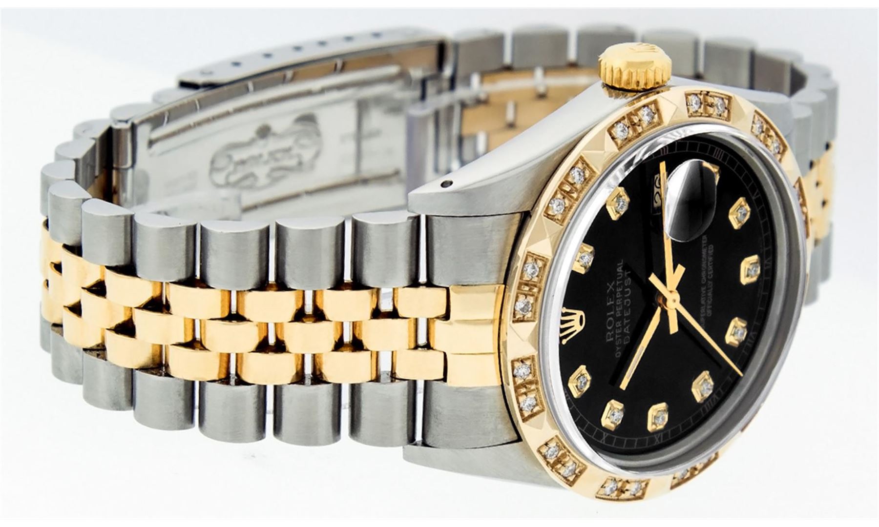 One Gents 18K Yellow Gold Two Tone Rolex Datejust Polished, Serviced & Electronically Tested, 18K Yellow Gold & Stainless Steel Case:36mm, 18K Yellow Gold Crown, Custom Bezel: 18K Yellow Pyramid Diamond Bezel, Diamond Count: 24 Diamonds In Dial. Clarity: Si-VS, Color: G to H. Custom Crystal: Synthetic Sapphire Cyclops Lens. Movement: Automatic Winding Movement Caliber 3035. Custom Dial: Black Diamond Dial With Square Roman Track, Diamond Count: 10 Diamonds In Dial, Color: G To H, Clarity: SI-VS, Date Window: 3 O'Clock Position Date Display, Quickset, Model: 16013, Condition: G-6 Extra Fine The Watch Is In Very Good Condition Free Of All Scratches And Dents. Bracelet:Two Tone Yellow Gold & Stainless Steel Jubilee Band. Bright Polish. 7.0 Inch Length, Adjustable. Standard Clasp, With Rolex Logo.