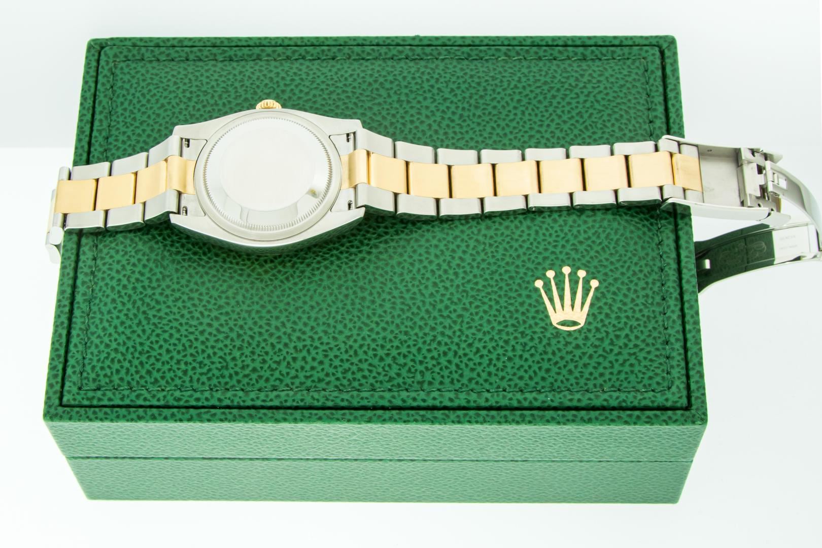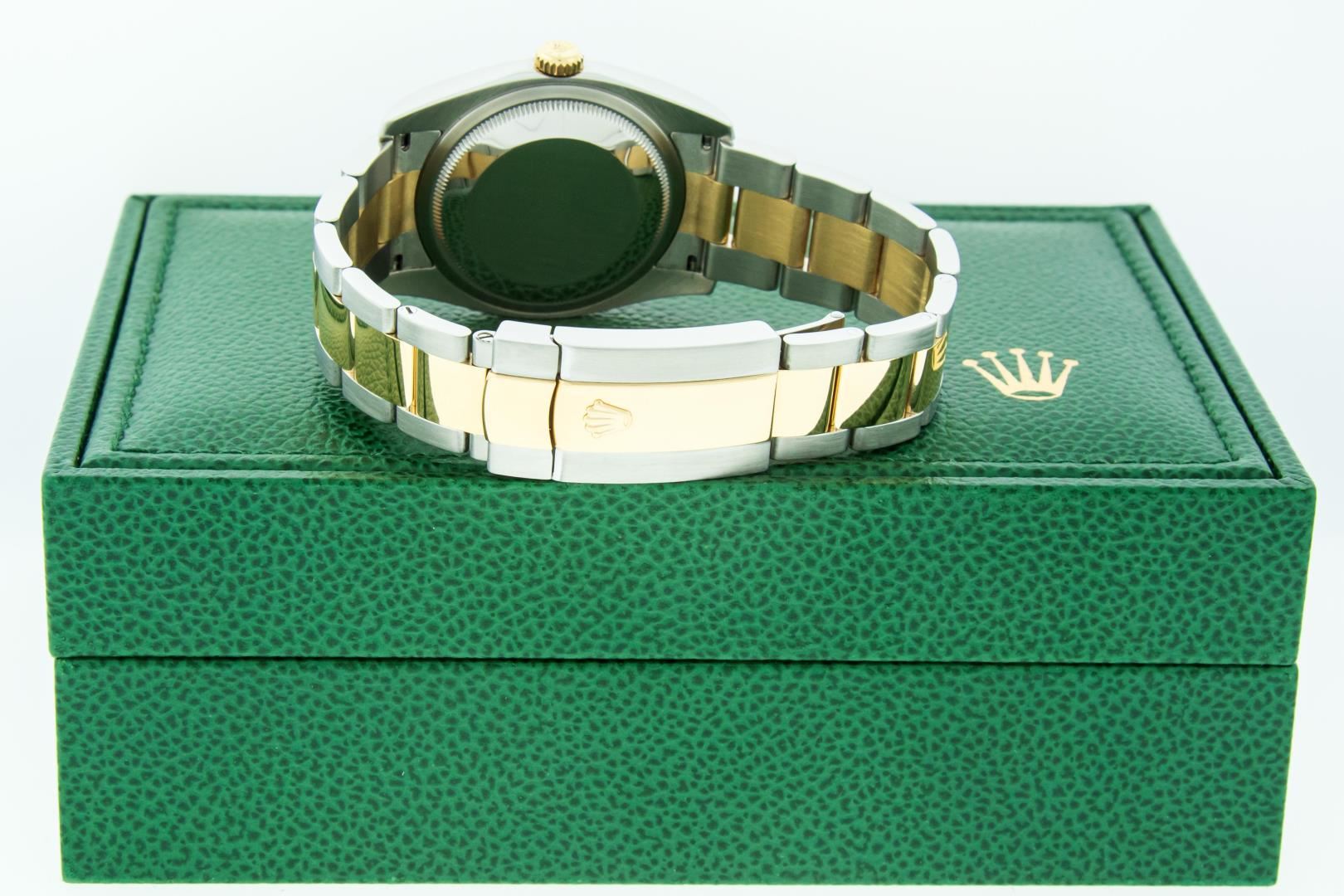 One Mens Pre Owned 18K Yellow Gold and Stainless Steel Two Tone Rolex Datejust Polished, Serviced & Electronically Tested, Rolex Yellow Gold & Stainless Steel Case: 36mm, Rolex Yellow Gold Crown, Rolex Bezel: Rolex 18K Yellow Gold Fluted Bezel. Crystal: Sapphire With Cyclops Lens. Hands: Lumi Hands. Rolex Dial: Black Dial With Square Roman Track, Date Window: 3 O'Clock Position Date Display, Quickset, Model: Quickset Datejust 116233. Condition: G-6 Extra Fine. Rolex Bracelet: 18K Yellow Gold and Stainless Steel Oyster Band. Bright Polish & Satin Finish. 7.0 Inch Length, Adjustable. Standard Clasp, With Rolex Logo. This Watch Comes With A Rolex Box.