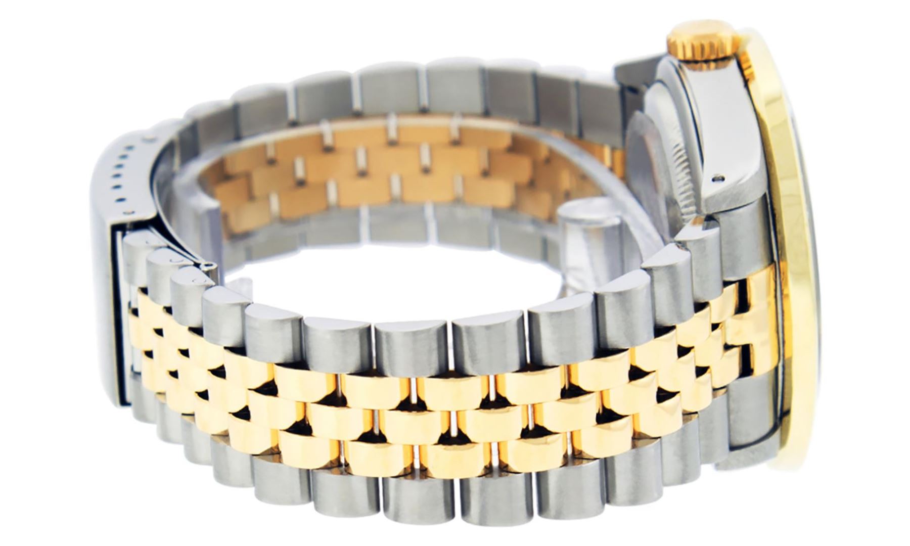 One Mens Pre Owned Two Tone Yellow Gold And Stainless Steel Rolex Datejust Polished Bright with Satin Finish, Serviced And Electronically Tested, Rolex Stainless Steel Case: 36mm, Yellow Gold Crown, Custom Bezel: New 18K Yellow Gold 3ct Channel Set Diamond Bezel, Diamond Count: 40 Diamonds, Total Weight 3.00 Carat. Custom Crystal: New Sapphire With Magnified Lens. Custom Hands: New Luminescent Hands. Rolex Movement: Automatic Winding Movement 3035. Custom Dial: Custom Black Dial With Added Diamonds, Diamond Count: 58 Diamonds On Dial. Date Window: 3 O'Clock Position Date Display, Quickset, Model: Datejust. Condition: G-6 Extra Fine. Rolex Bracelet: Yellow Gold And Stainless Steel Jubilee Band. Bright Polish And Satin Finish. 7.0 Inch Length, Adjustable. Standard Clasp, With Rolex Logo. This Watch Has Been Serviced And Polished It Is Free Of All Scratches And Dents.