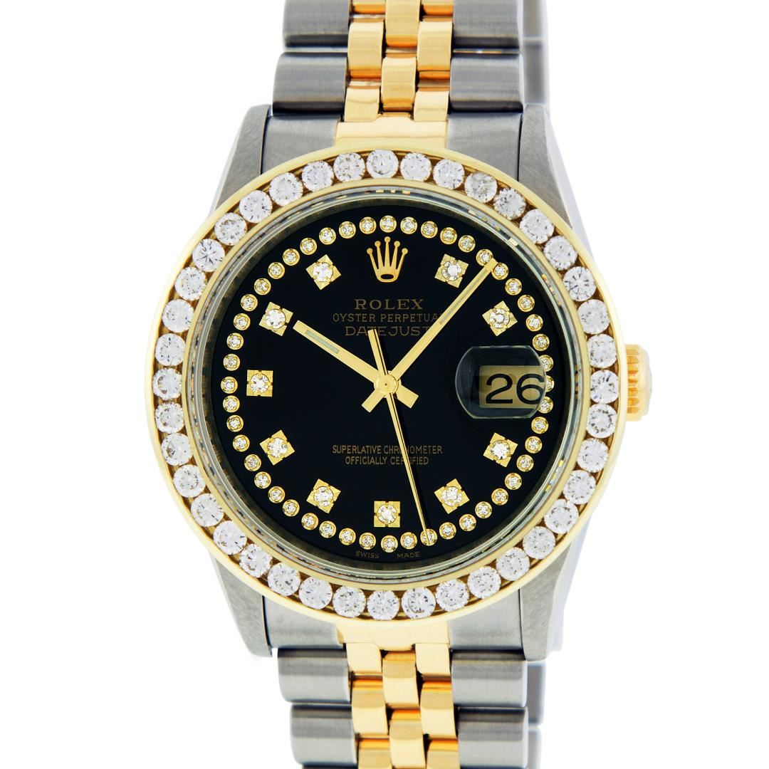 One Mens Pre Owned Two Tone Yellow Gold And Stainless Steel Rolex Datejust Polished Bright with Satin Finish, Serviced And Electronically Tested, Rolex Stainless Steel Case: 36mm, Yellow Gold Crown, Custom Bezel: New 18K Yellow Gold 3ct Channel Set Diamond Bezel, Diamond Count: 40 Diamonds, Total Weight 3.00 Carat. Custom Crystal: New Sapphire With Magnified Lens. Custom Hands: New Luminescent Hands. Rolex Movement: Automatic Winding Movement 3035. Custom Dial: Custom Black Dial With Added Diamonds, Diamond Count: 58 Diamonds On Dial. Date Window: 3 O'Clock Position Date Display, Quickset, Model: Datejust. Condition: G-6 Extra Fine. Rolex Bracelet: Yellow Gold And Stainless Steel Jubilee Band. Bright Polish And Satin Finish. 7.0 Inch Length, Adjustable. Standard Clasp, With Rolex Logo. This Watch Has Been Serviced And Polished It Is Free Of All Scratches And Dents.