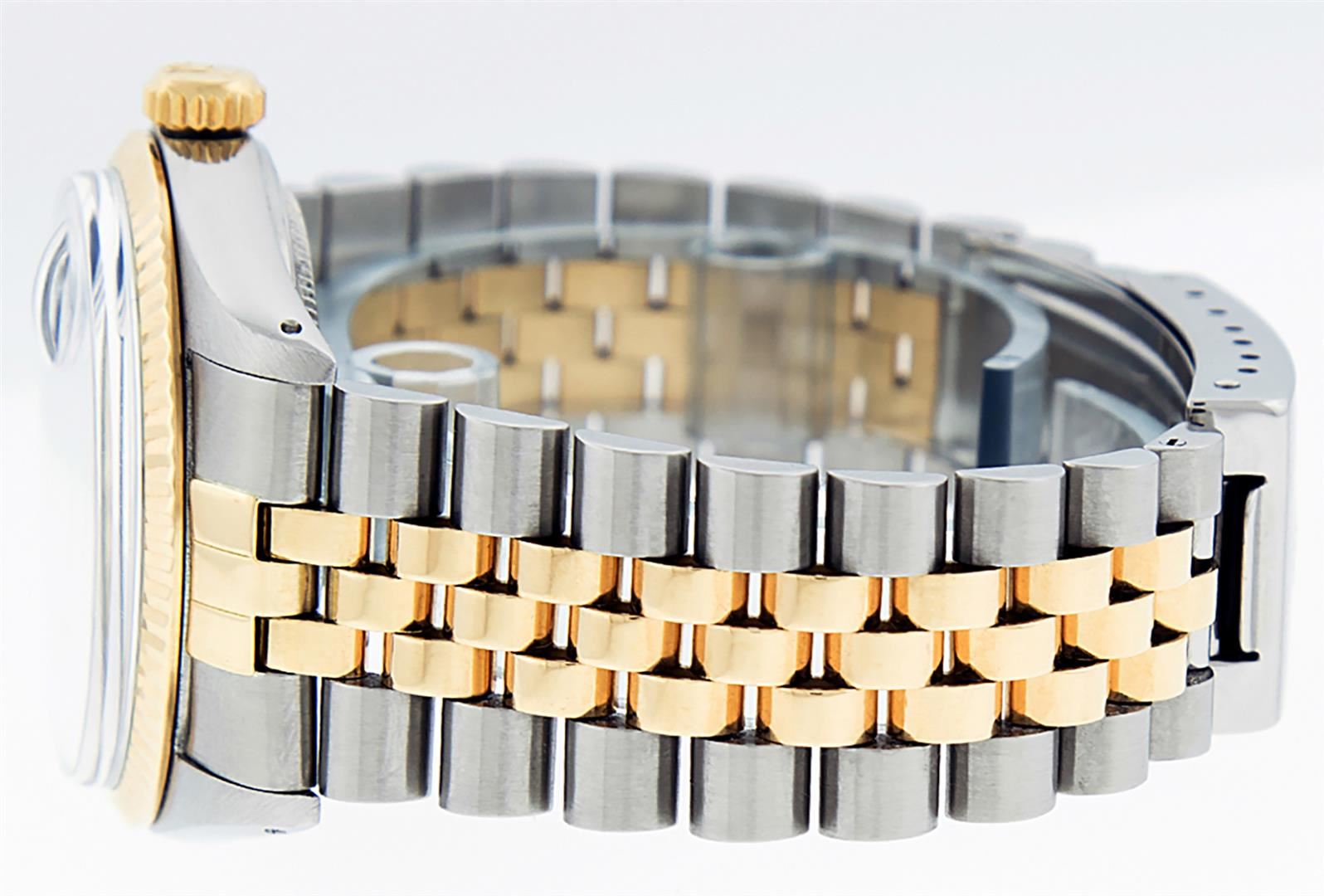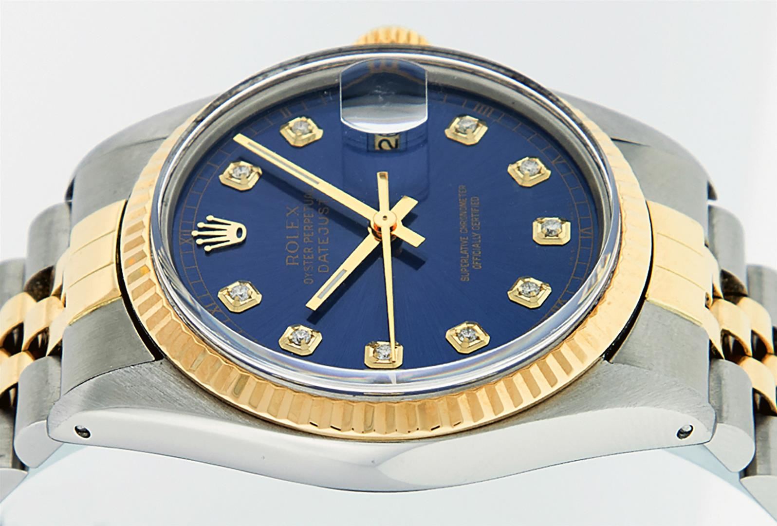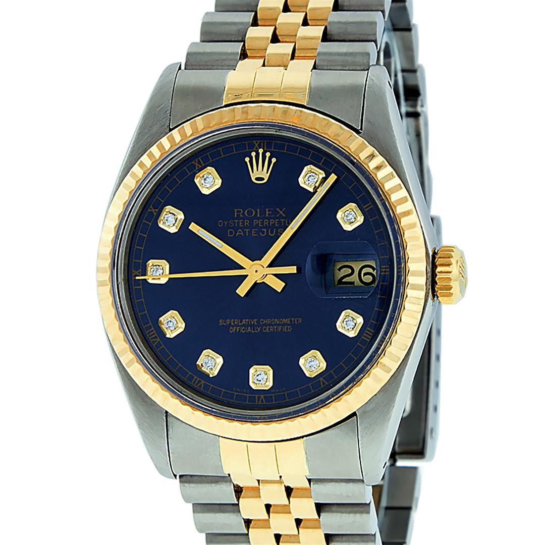 One Mens Yellow Gold Two Tone Rolex Datejust Polished, Serviced & Electronically Tested, Yellow Gold & Stainless Steel Case: 36mm, Yellow Gold Crown, Bezel: Yellow Gold Fluted Bezel. Custom Crystal: New Acrylic Cyclops Lens. Custom Hands: New Luminecent Hands. Movement: Automatic Winding Movement. Custom Dial: Blue With Diamond Hour Markers And Square Roman Track, Diamond Count: 10 Diamonds in Dial, G To H In Color, SI-VS Clarity. Date Window: 3 O'Clock Position Date Display, Quickset, Model: Datejust, Condition: G-6 Extra Fine. Bracelet: Two Tone Yellow Gold & Stainless Steel Jubilee. Bright Polish. 7.0 Inch Length, Adjustable. Standard Clasp, With Rolex Logo. This Watch Has Been Serviced And Polished It Is Free Of All Scratches And Dents.