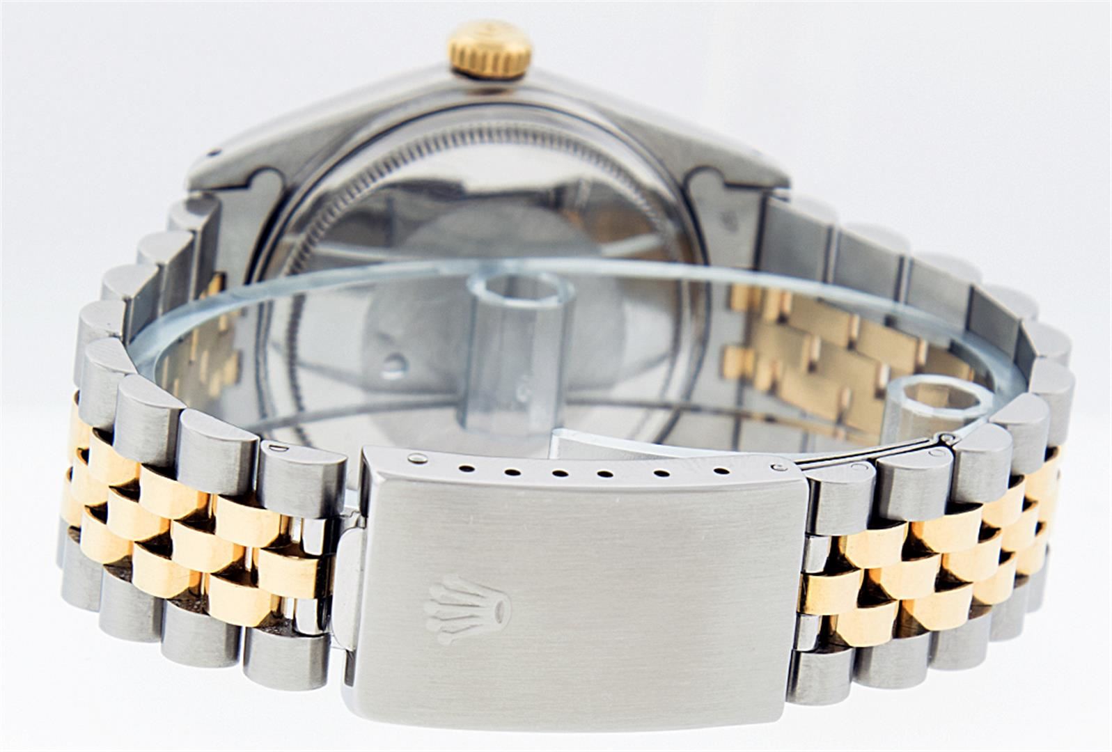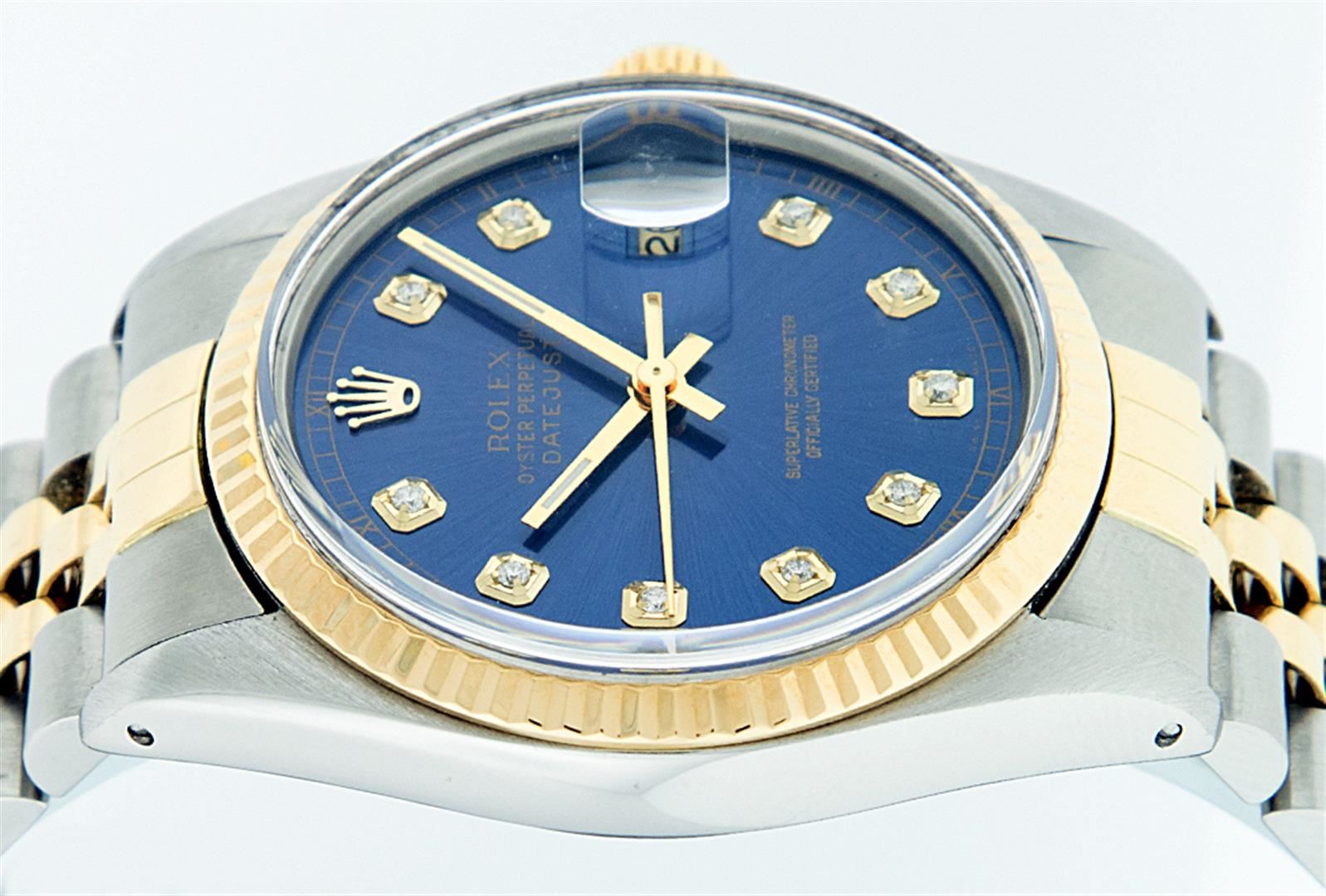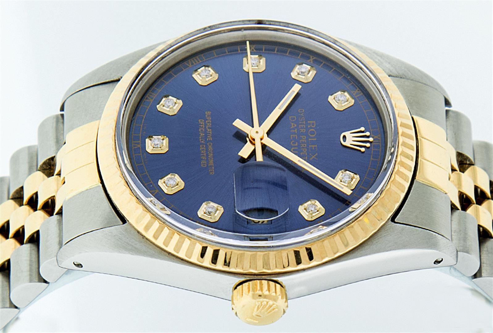 One Mens Two Tone Rolex Datejust Polished, Serviced & Electronically Tested, 18K Yellow Gold & Stainless Steel Case: 36mm,18K Yellow Gold Crown, Bezel: 18K Yellow Gold Fluted Bezel. Custom Crystal: Sapphire Cyclops Lens. Movement: Automatic Winding Movement Caliber 3135. Custom Dial: Blue Dial With Diamond Hour Markers and Track. Diamond Count: 10 Diamonds In Dial, Color: G To H, Clarity: VS2-SI1. Date Window: 3 O'Clock Position Date Display, Quickset, Model: 16233 Sapphire Datejust. Condition: G-6 Extra Fine. Bracelet:Two Tone 18K Yellow Gold & Stainless Steel Jubilee. Bright Polish. 7.0 Inch Length, Adjustable. Standard Clasp, With Rolex Logo.