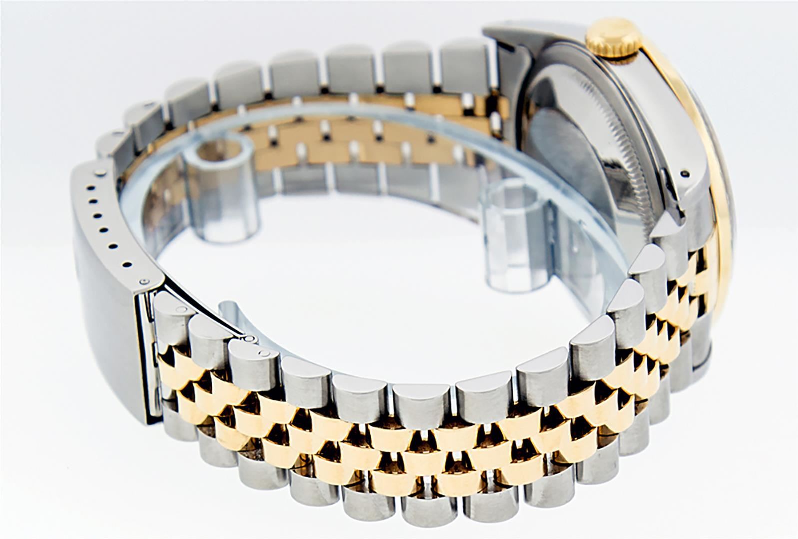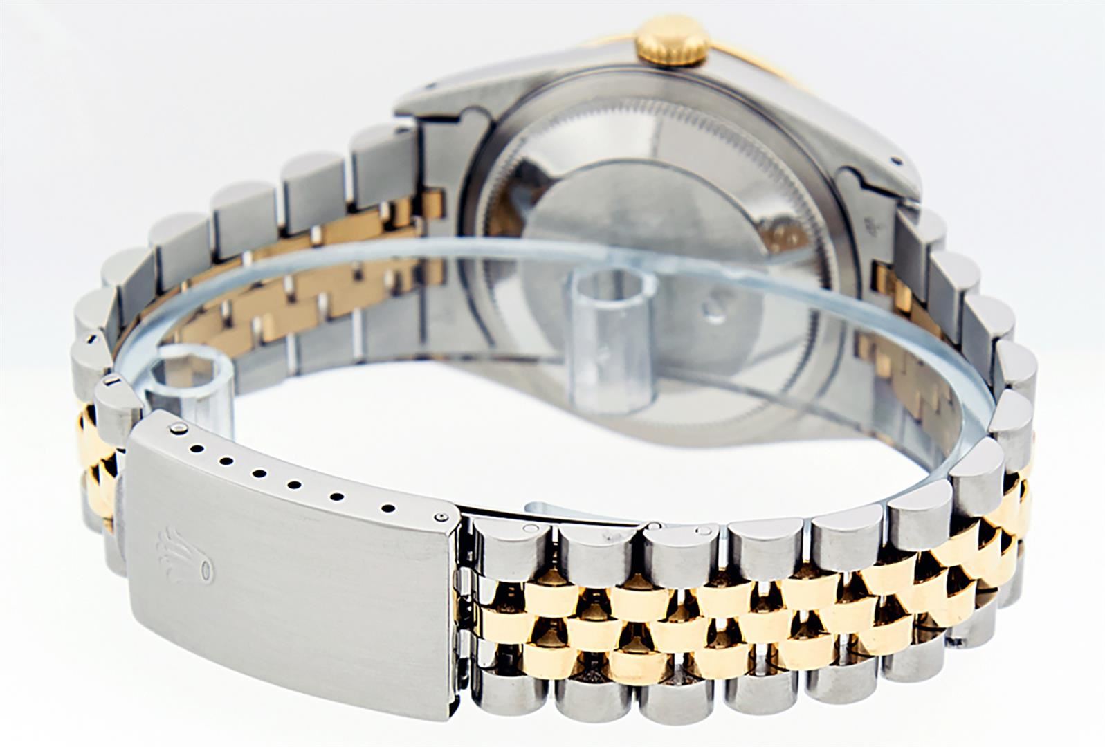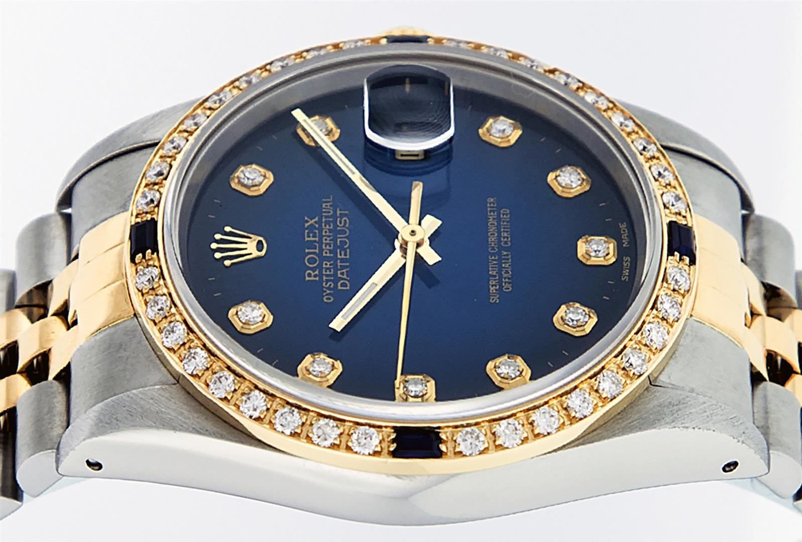 One Mens Pre Owned Rolex Yellow Gold And Steel Two Tone Rolex Datejust Polished, Serviced & Electronically Tested, Rolex Case: Yellow Gold And Stainless Steel Case: 36mm, Rolex Yellow Gold Crown, Custom Bezel: New 18K Yellow Gold Sapphire Beadset Diamond Bezel, Diamond Count: 36 Diamonds + 4 Sapphires. Custom Crystal: New Sapphire With Magnified Date Window. Custom Hands: New Luminescent Hands. Rolex Movement: Automatic Winding Movement. Custom Dial: Refinished To Blue Vignette With Custom Added Diamond Hour Markers & Dash Track. Diamond Count: 10 Diamonds, Clarity: VS, Color: G to H Date Window: 3 O'Clock Position Date Display, Quickset, Model: Datejust, Condition: G-6 Extra Fine. Rolex Bracelet: Two Tone Yellow Gold & Stainless Steel Jubilee. Bright Polish. 7.0 Inch Length, Adjustable. Standard Clasp, With Rolex Logo. This Watch Has Been Serviced Time Tested And Is In Excellent Condition It Is Free Of All Scratches And Dents.